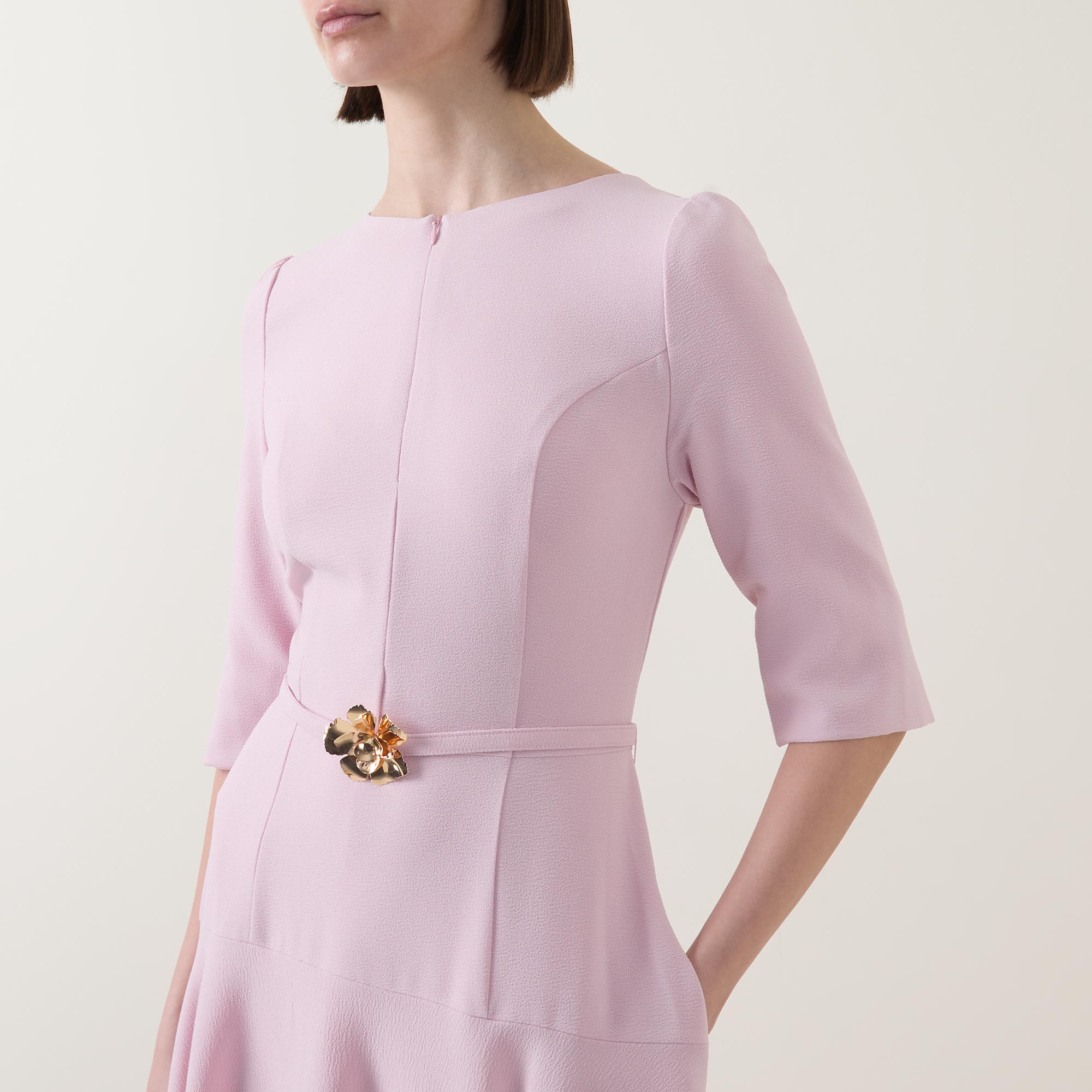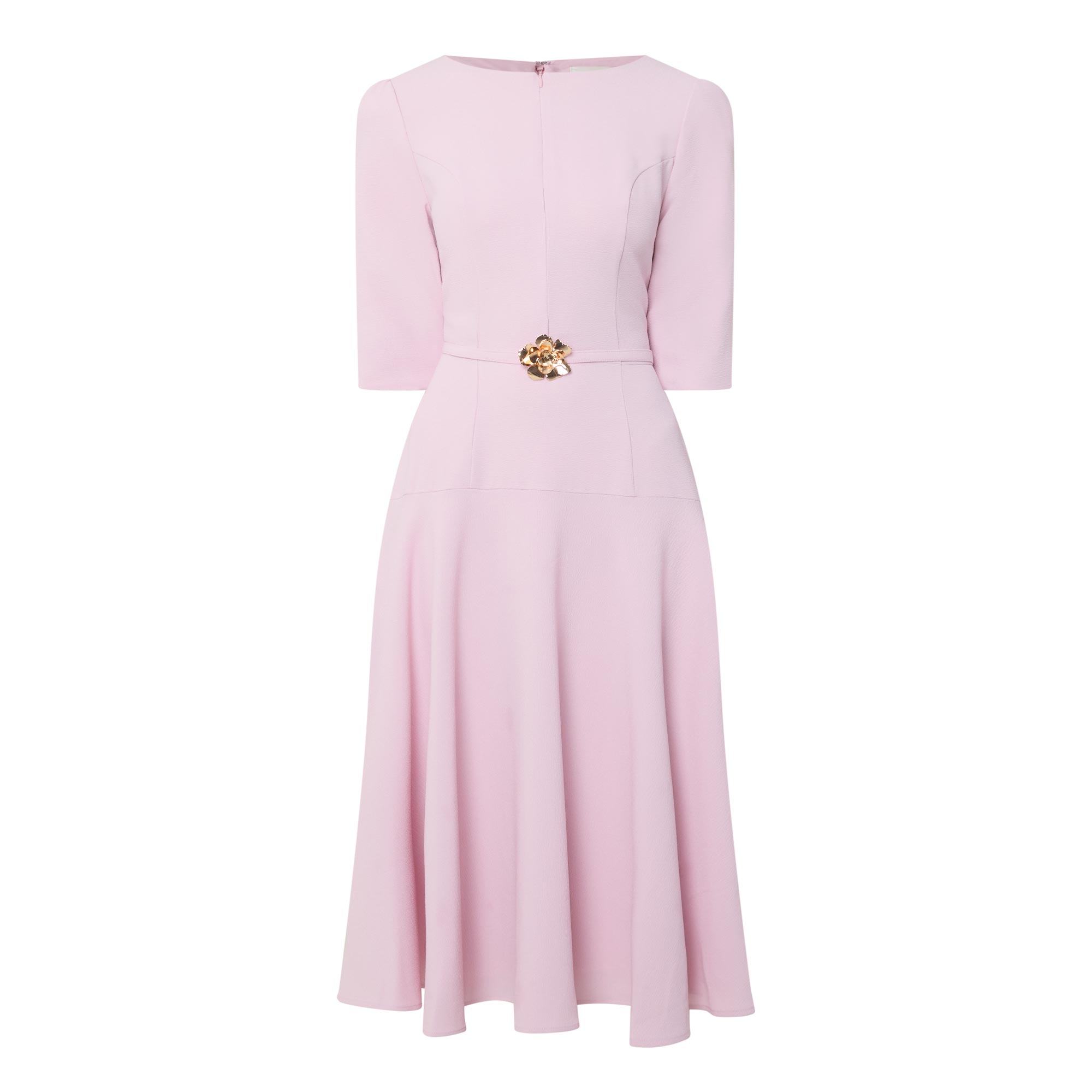 - Boat neckline, three quarter length sleeves, split cuffs, rear concealed zip fastening, front zip design, belt with gold-tone hardware, dropped waistline, two side in seam pockets, flared skirt, midi length