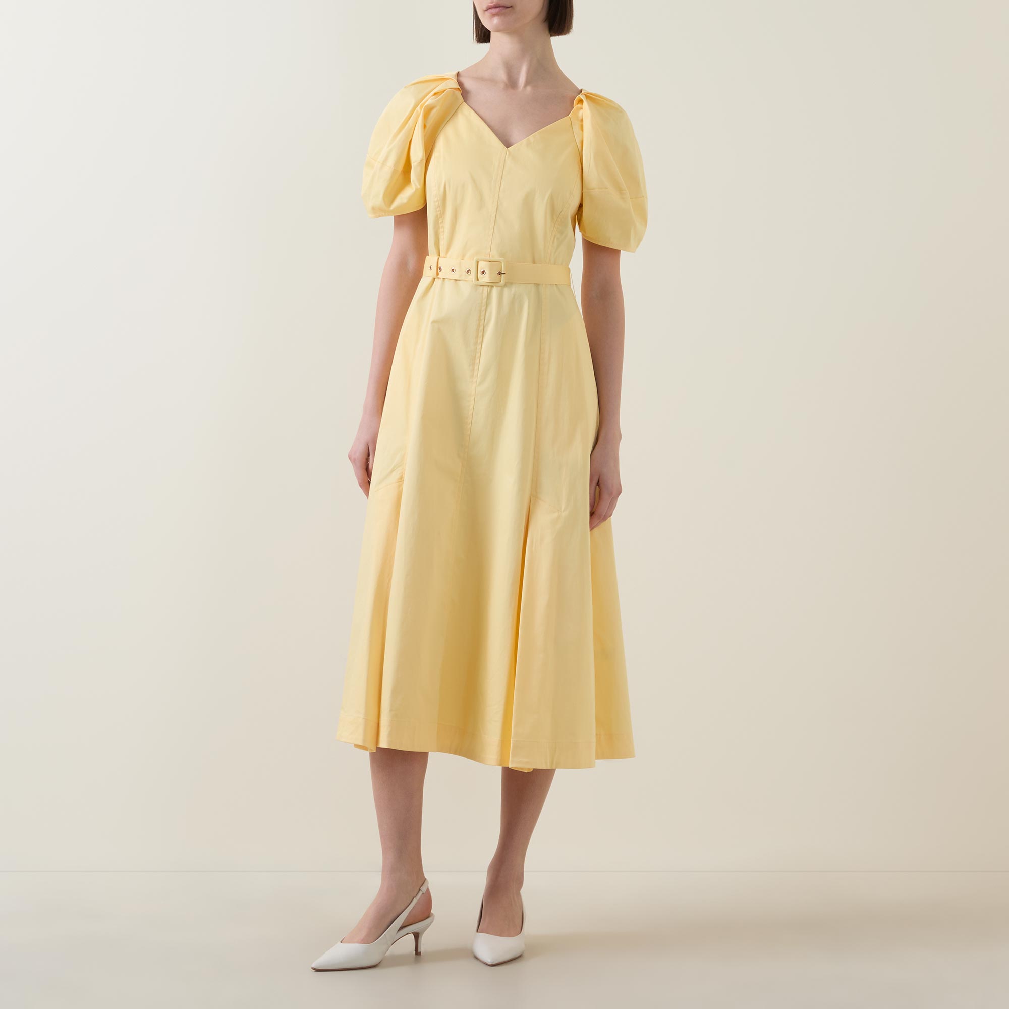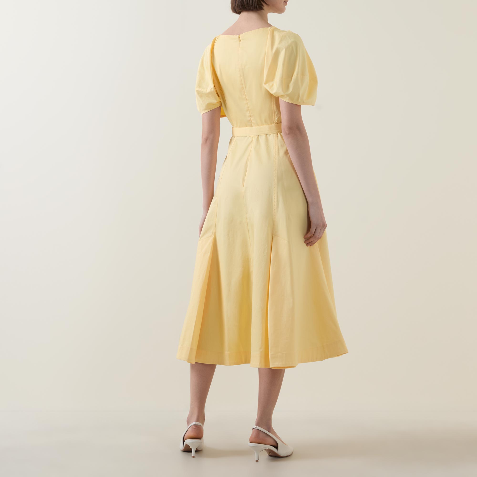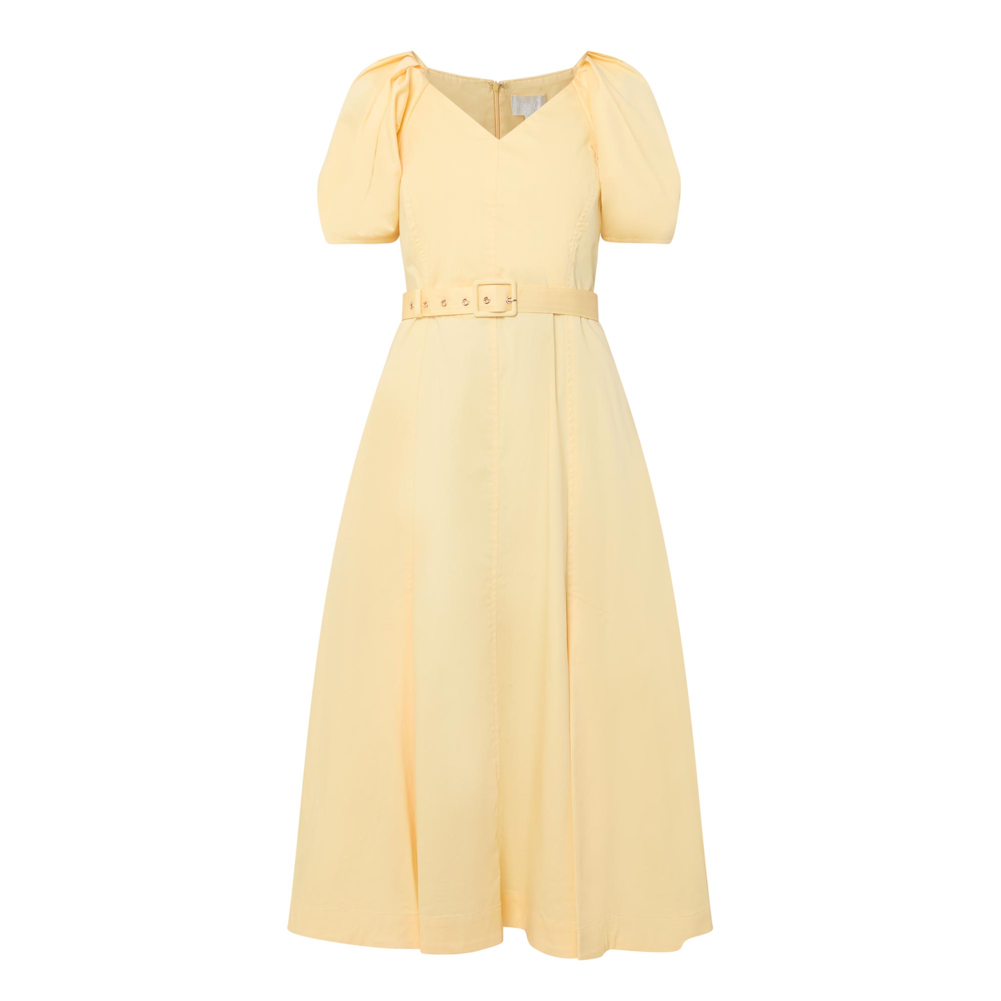• V-neckline, short puff sleeves, rear concealed zip closure, matching buckle fastening, two side in seam pockets, flared skirt, straight hem, tonal stitching, midi length