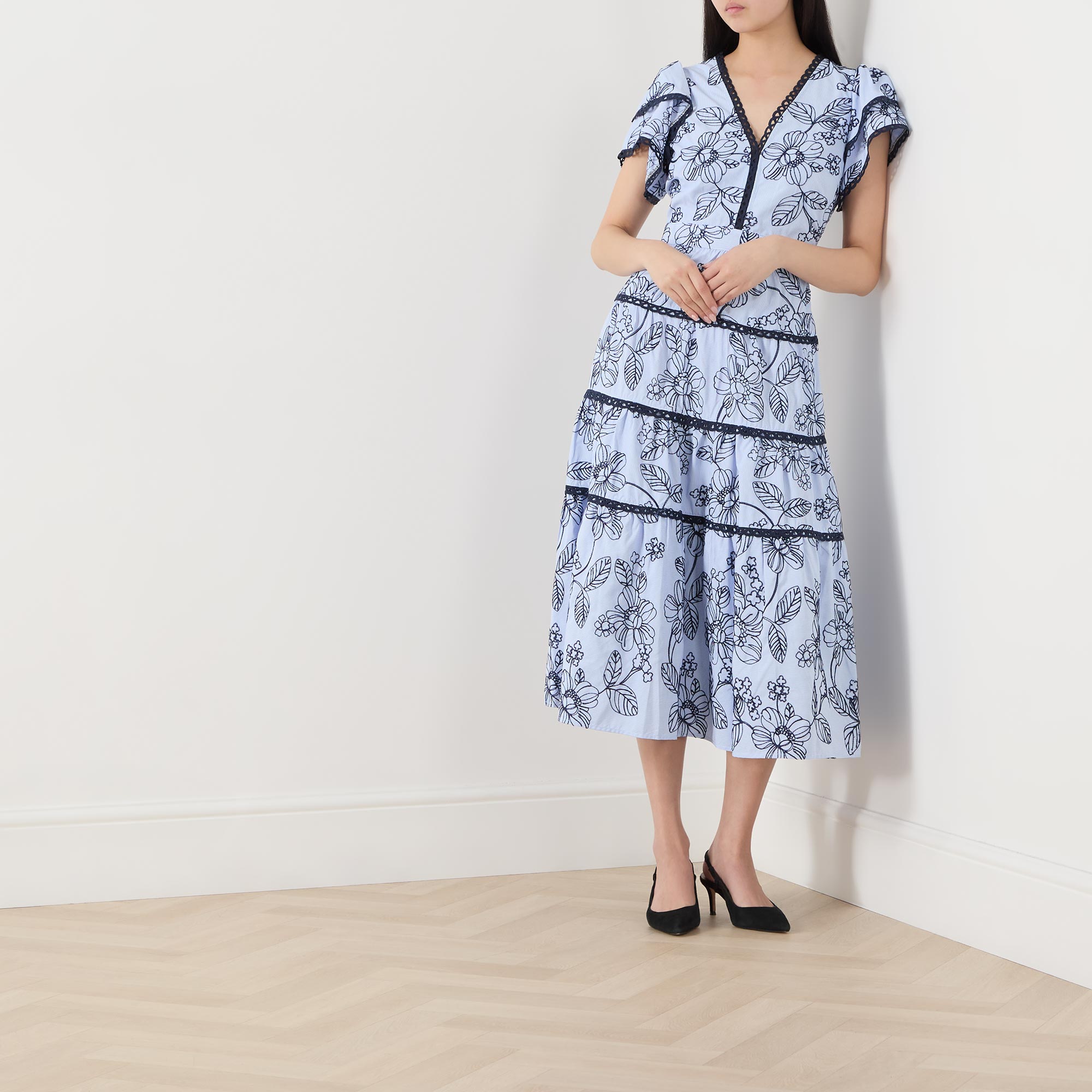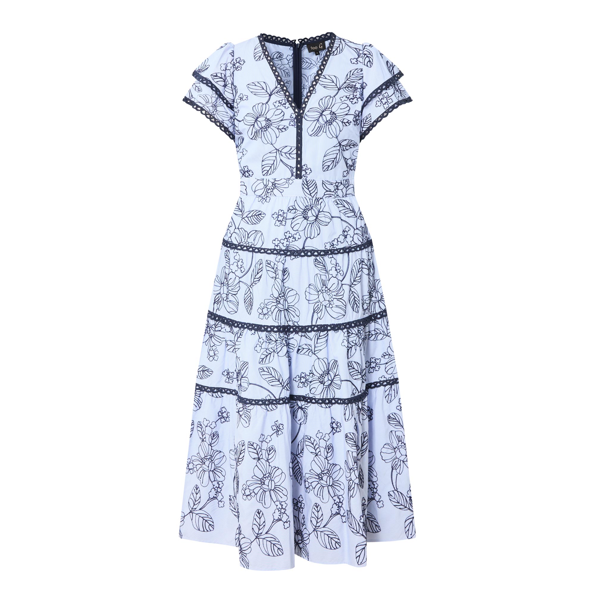 • V-neckline, short layered sleeves, tiered skirt, embroidered floral detailing, zip fastening to the back, midi length