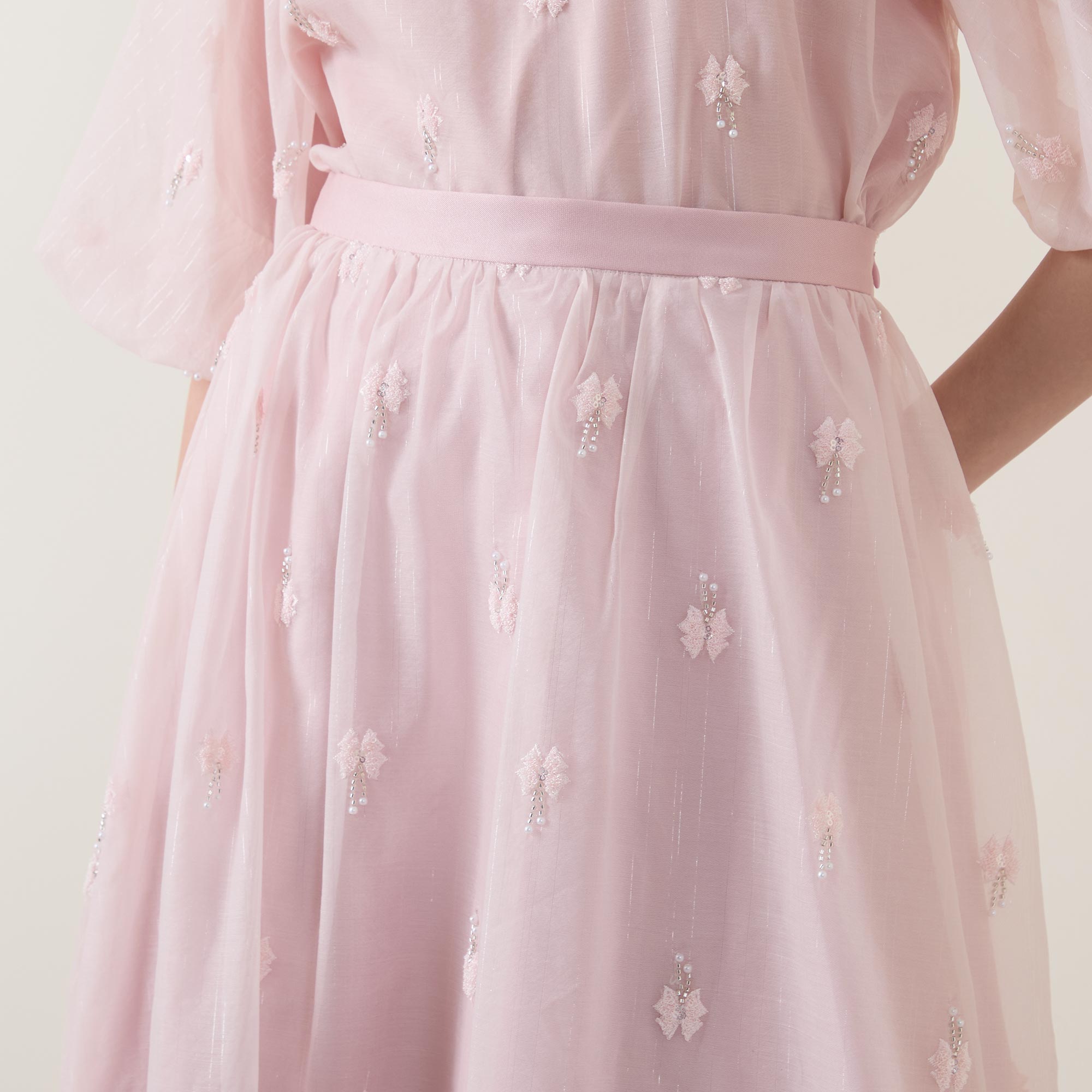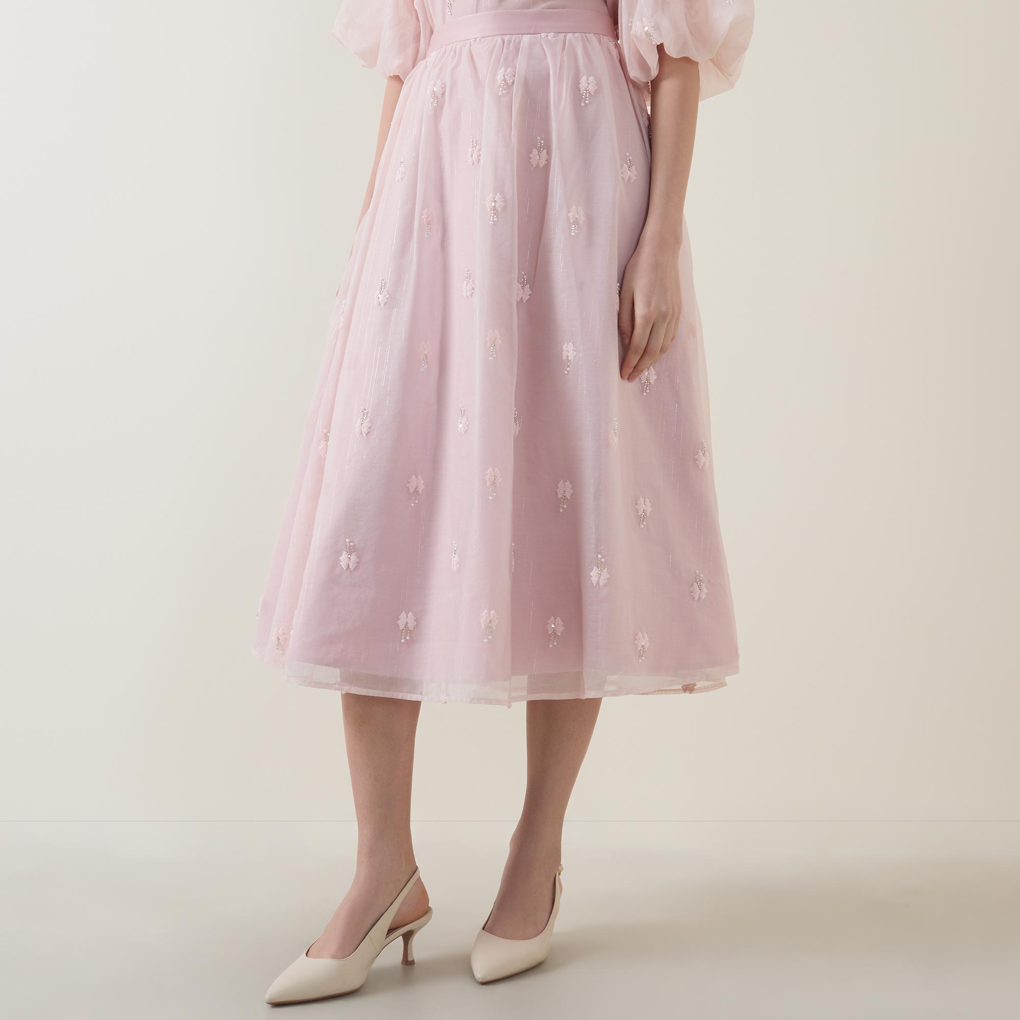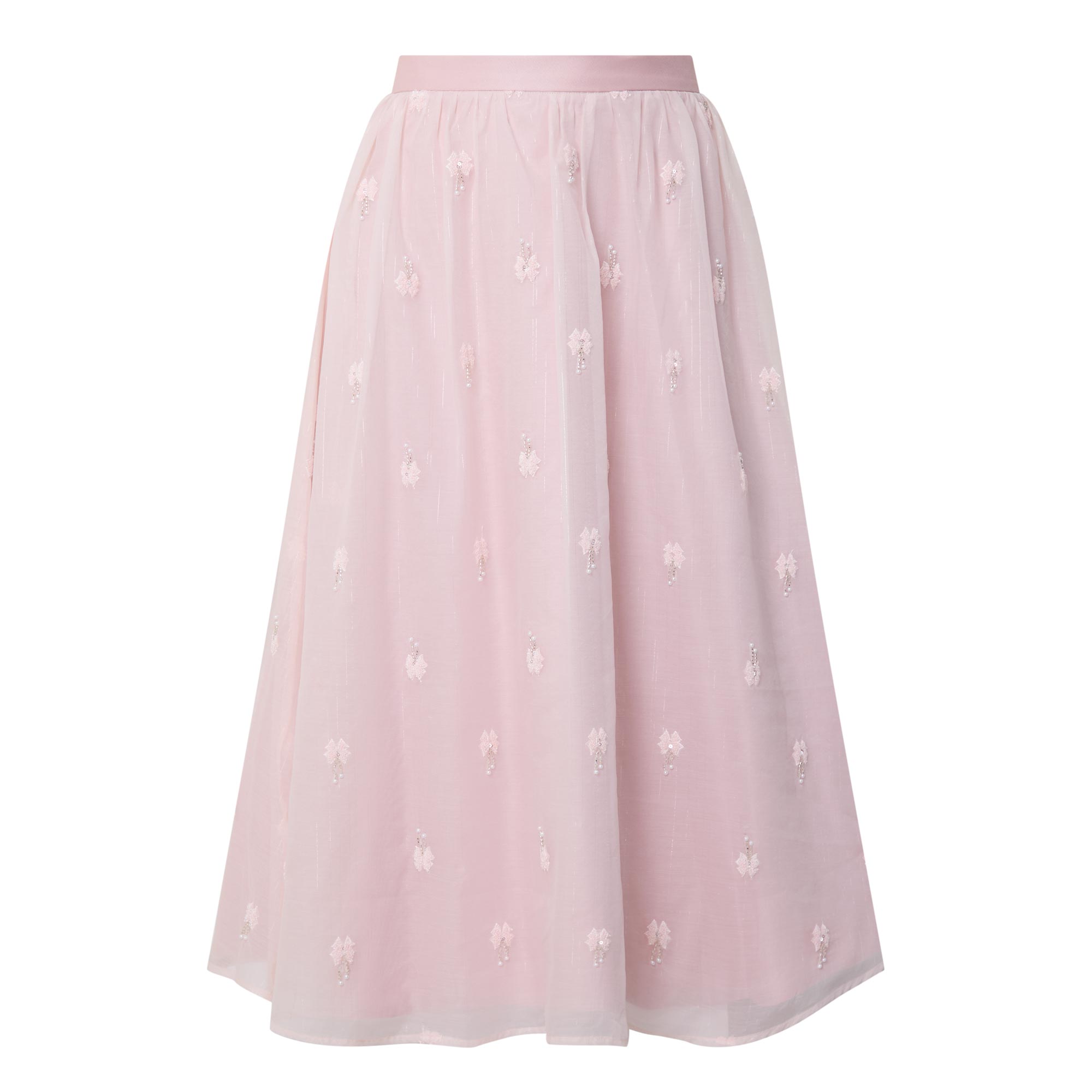 - High rise, satin waistband, concealed zip fastening, flared design, embellished detailing throughout, semi-sheer overlay, midi length, lined