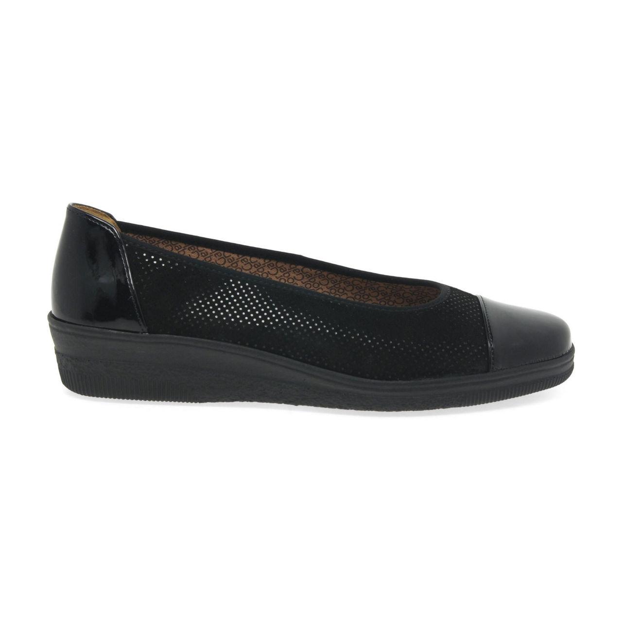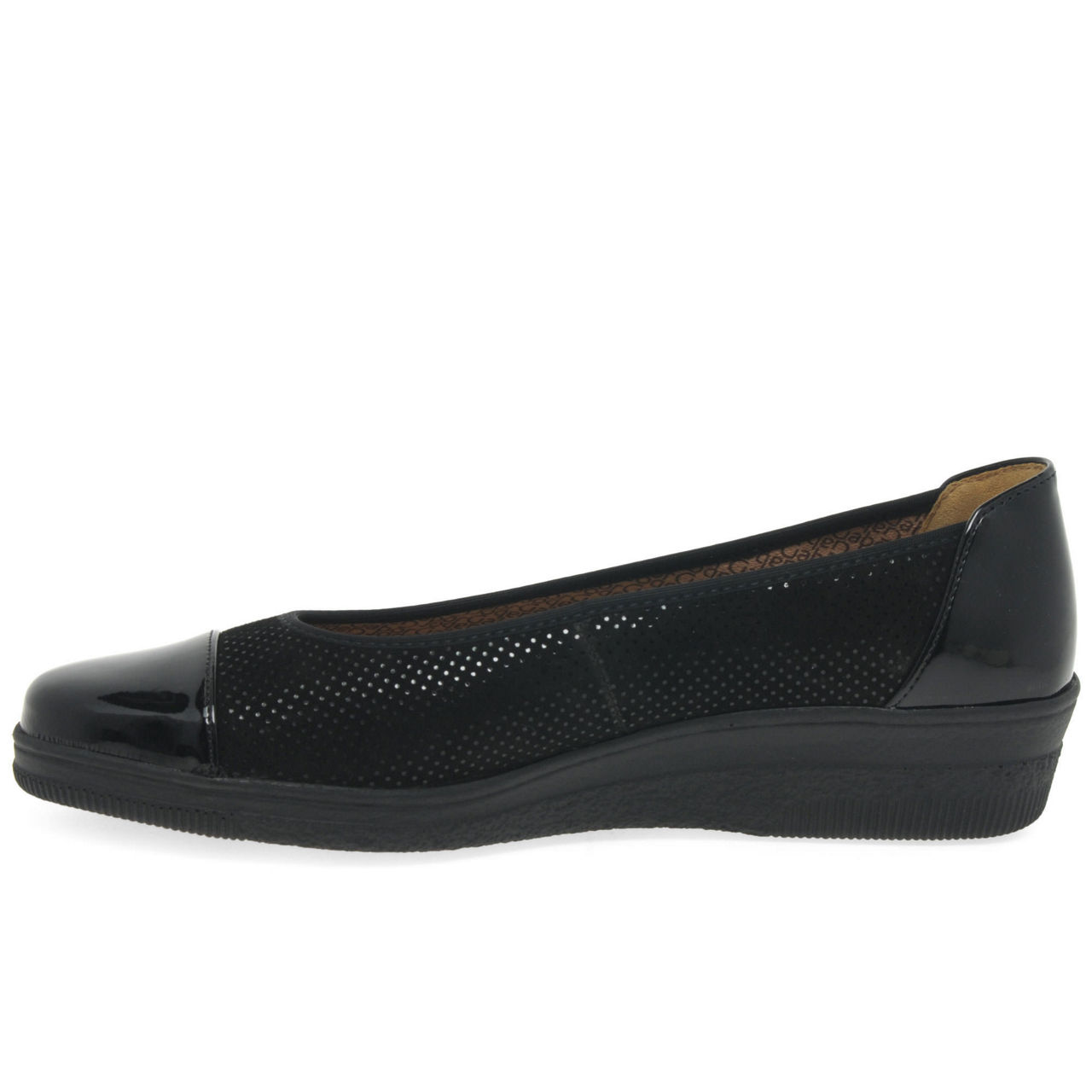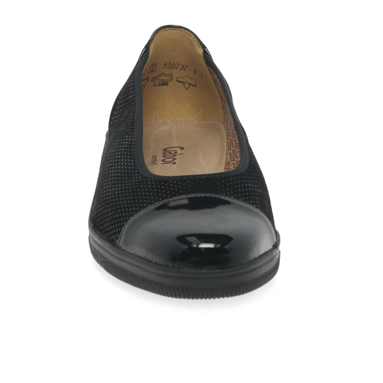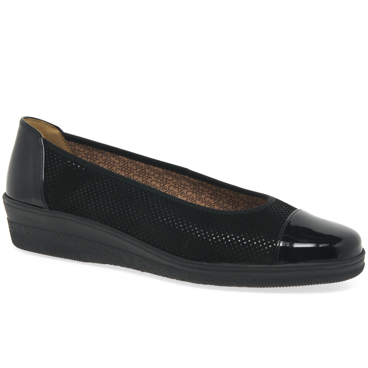 A wardrobe staple for wide fitting feet which will compliment smart and casual outfits season after season, Gabor's Petunia women's ballet flats are crafted in a choice of classic navy or black leather. An all-over spot print dresses up the smart leather, patent heel and toe caps adding shine to the versatile design. Feet slip into cosy cotton linings and smooth leather insoles, practicality provided by sturdy grip inducing PU soles with the feminine addition of low wedge heels.