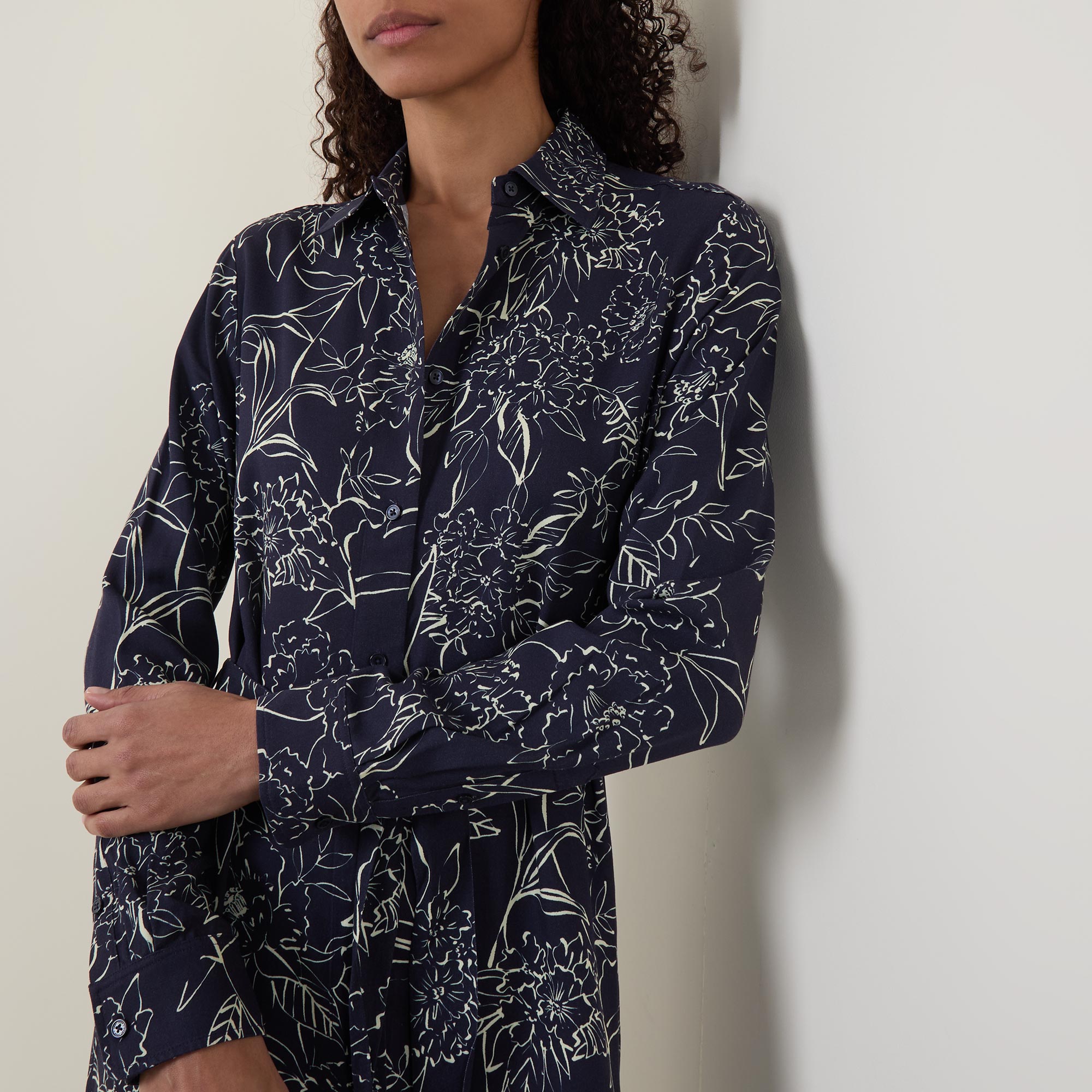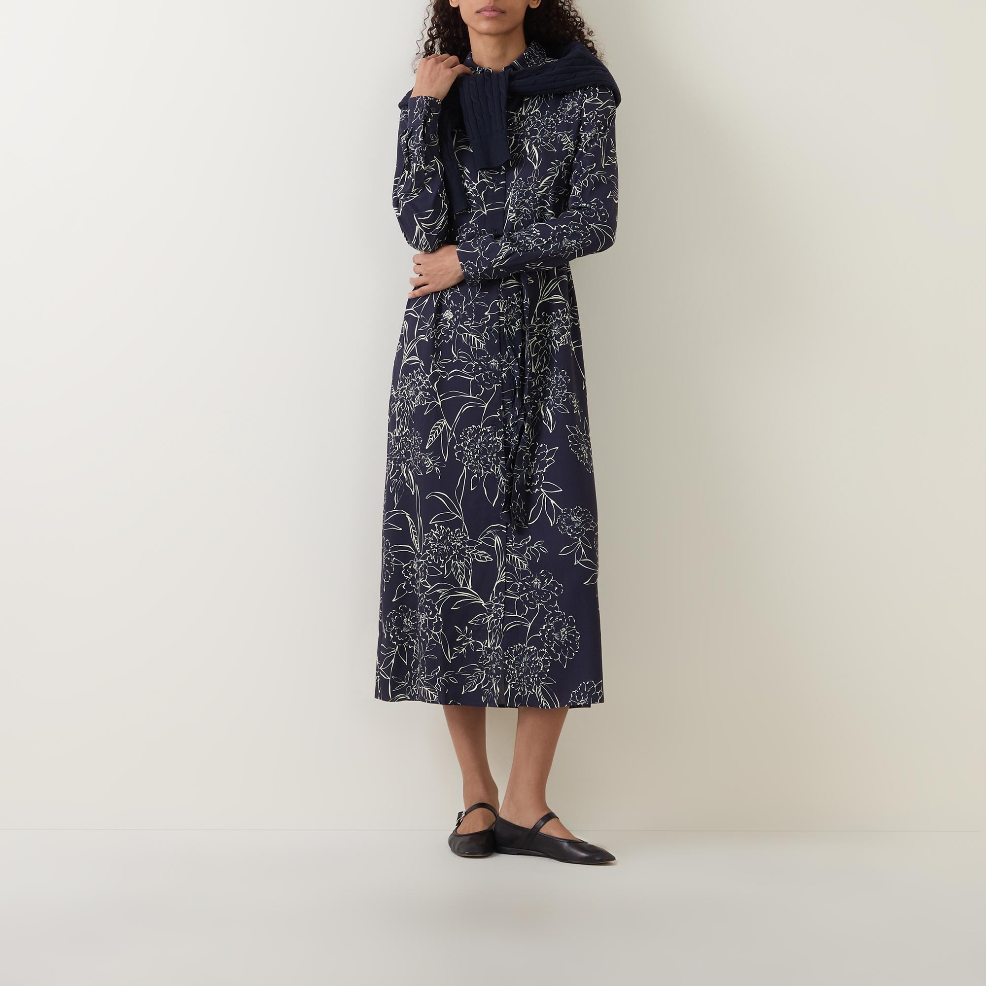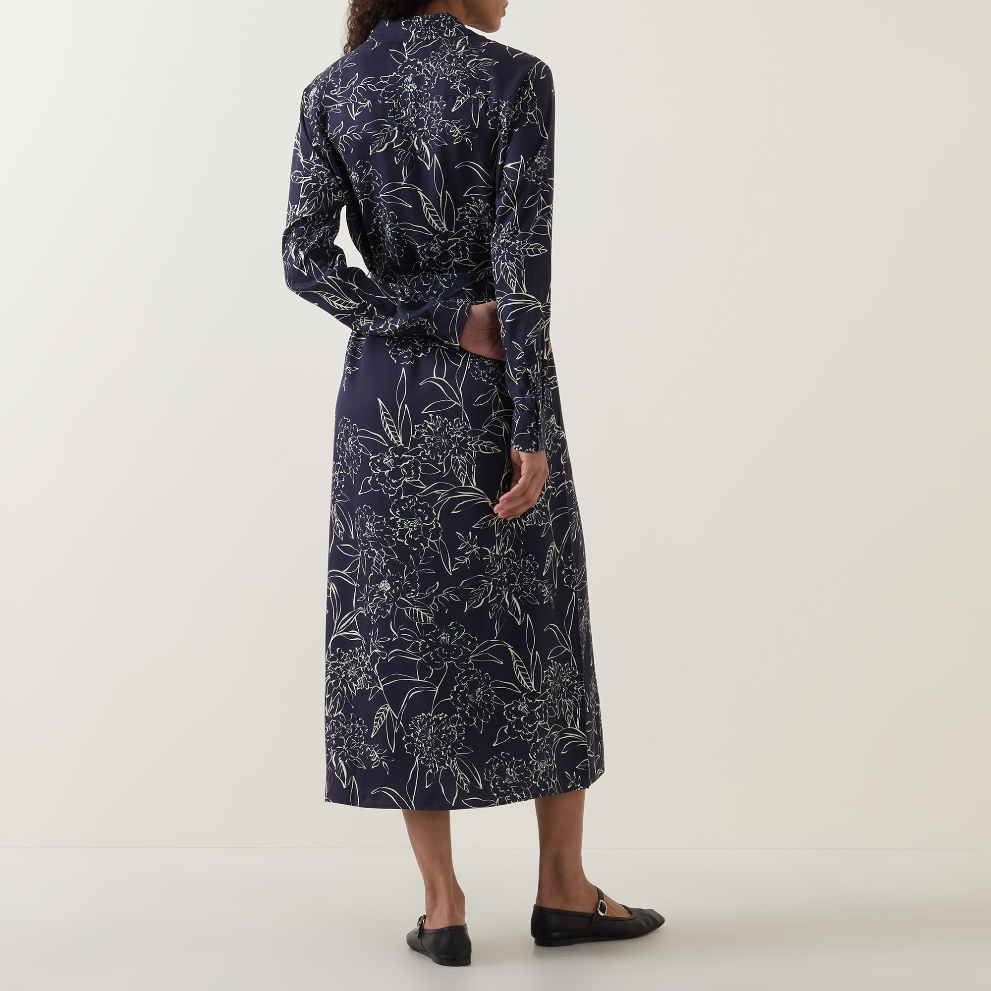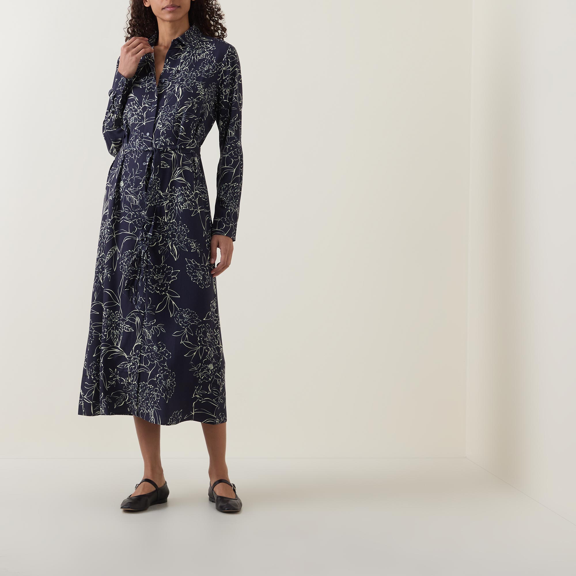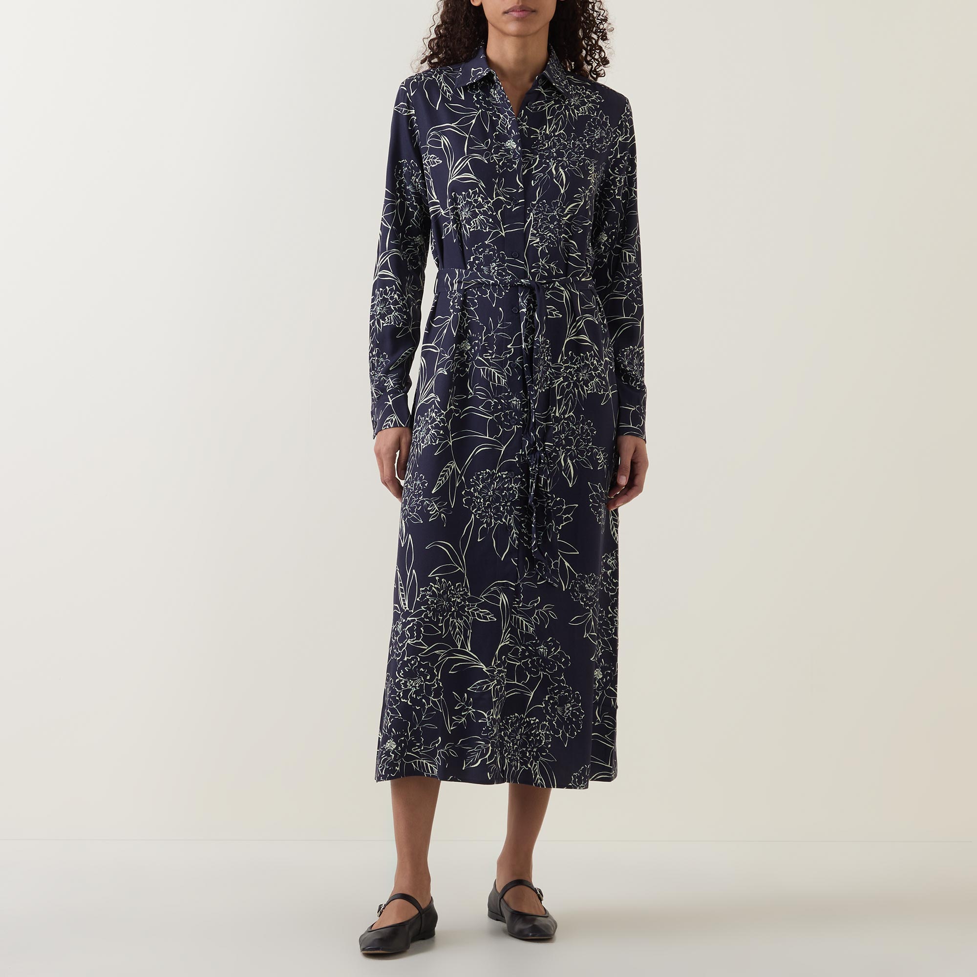 - Long sleeves, point collar, front button placket, floral pattern, self-fabric tie-fastening belt, flared silhouette, midi length