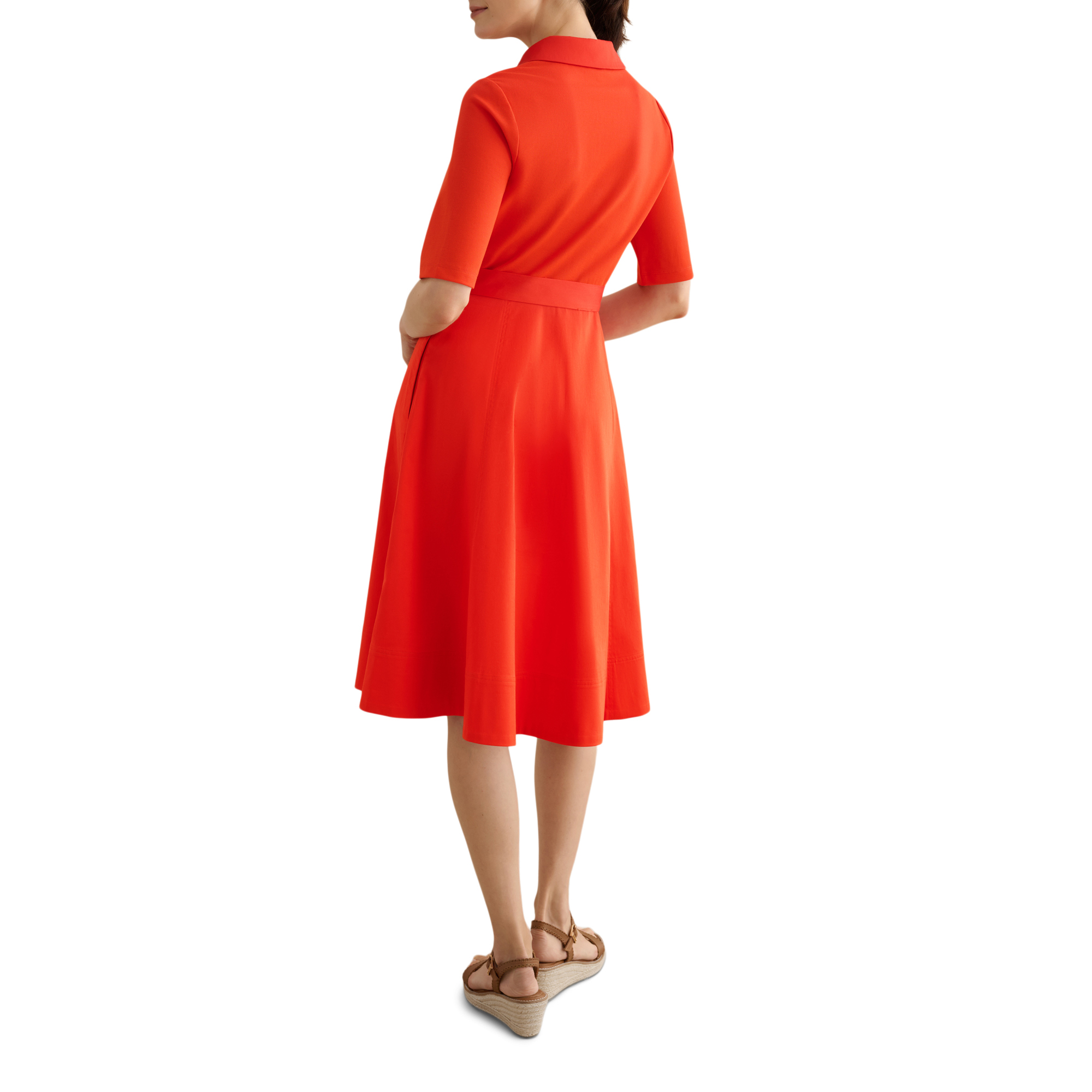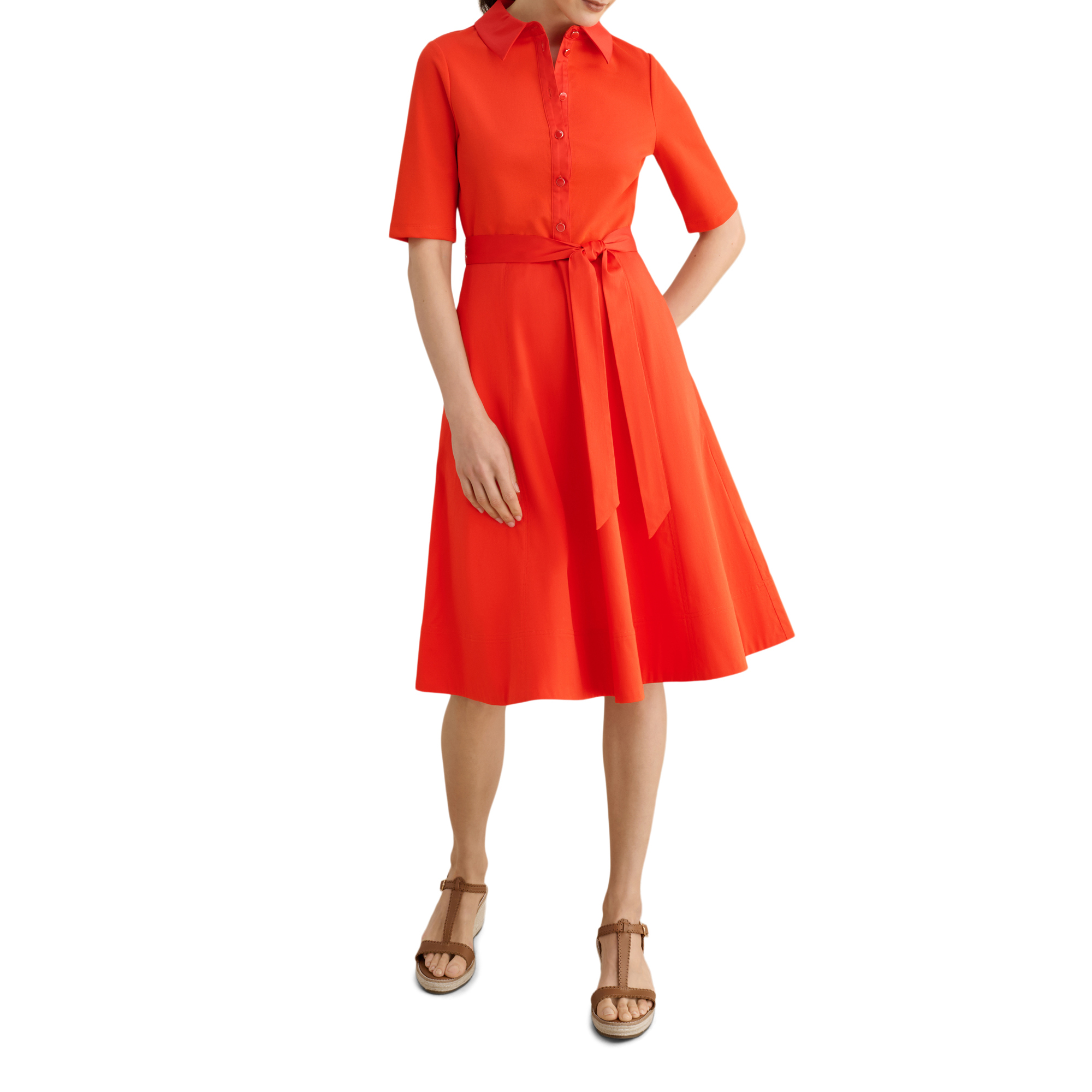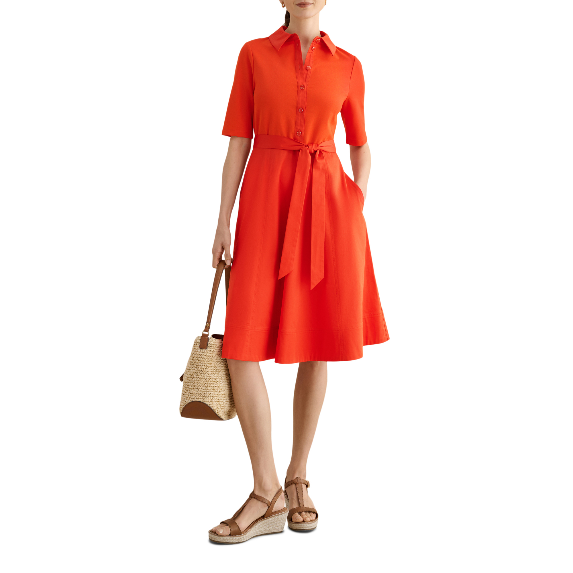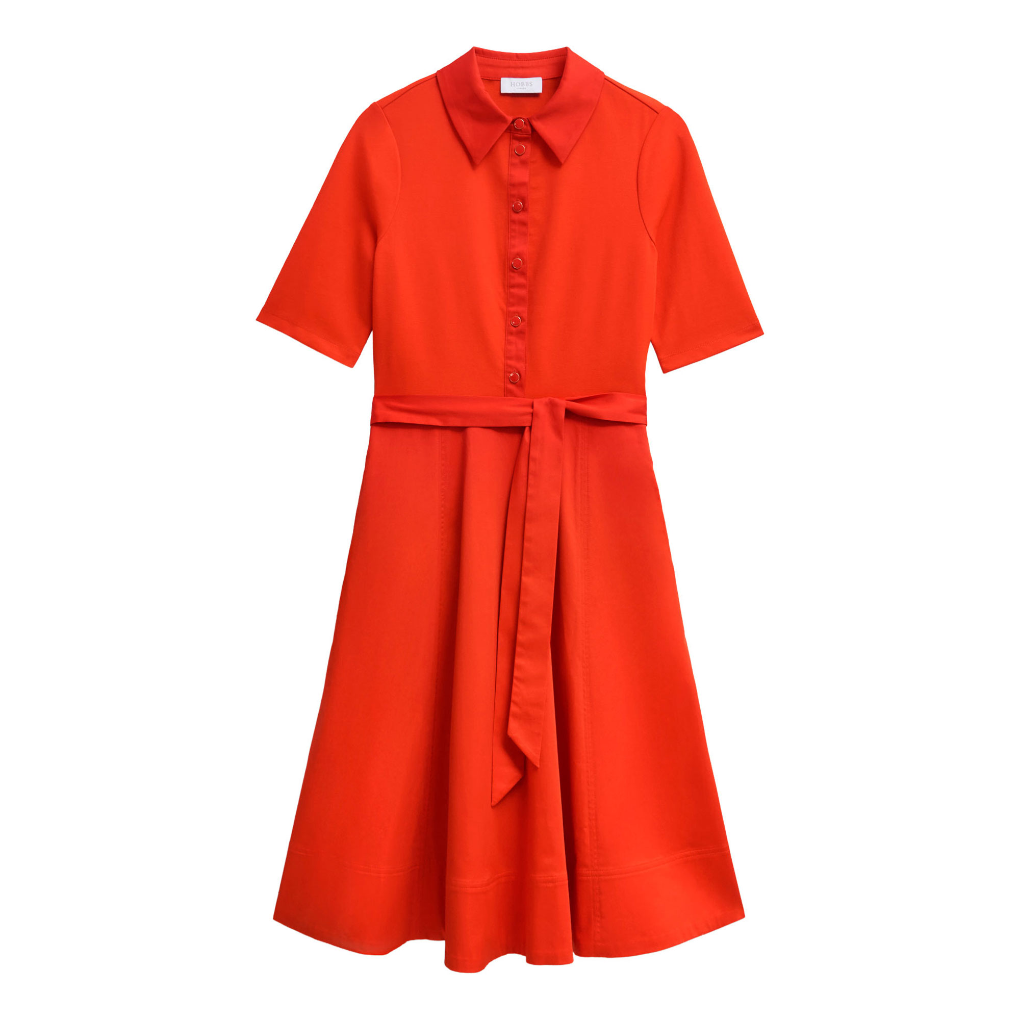 - Shirt silhouette, side pockets, soft jersey fabric, button-through bodice, tie waist, collared neckline, midi length, A-line style, woven, short sleeves