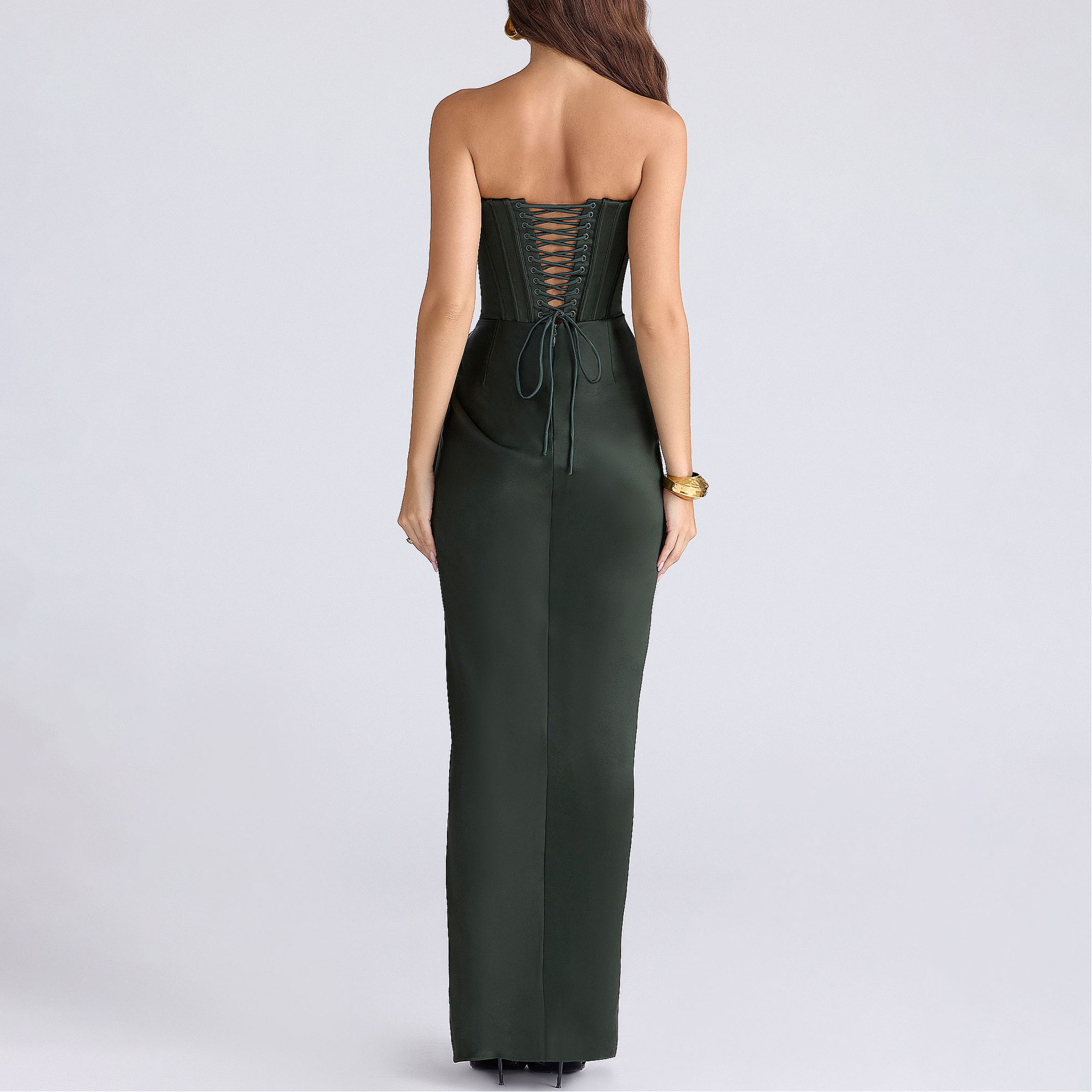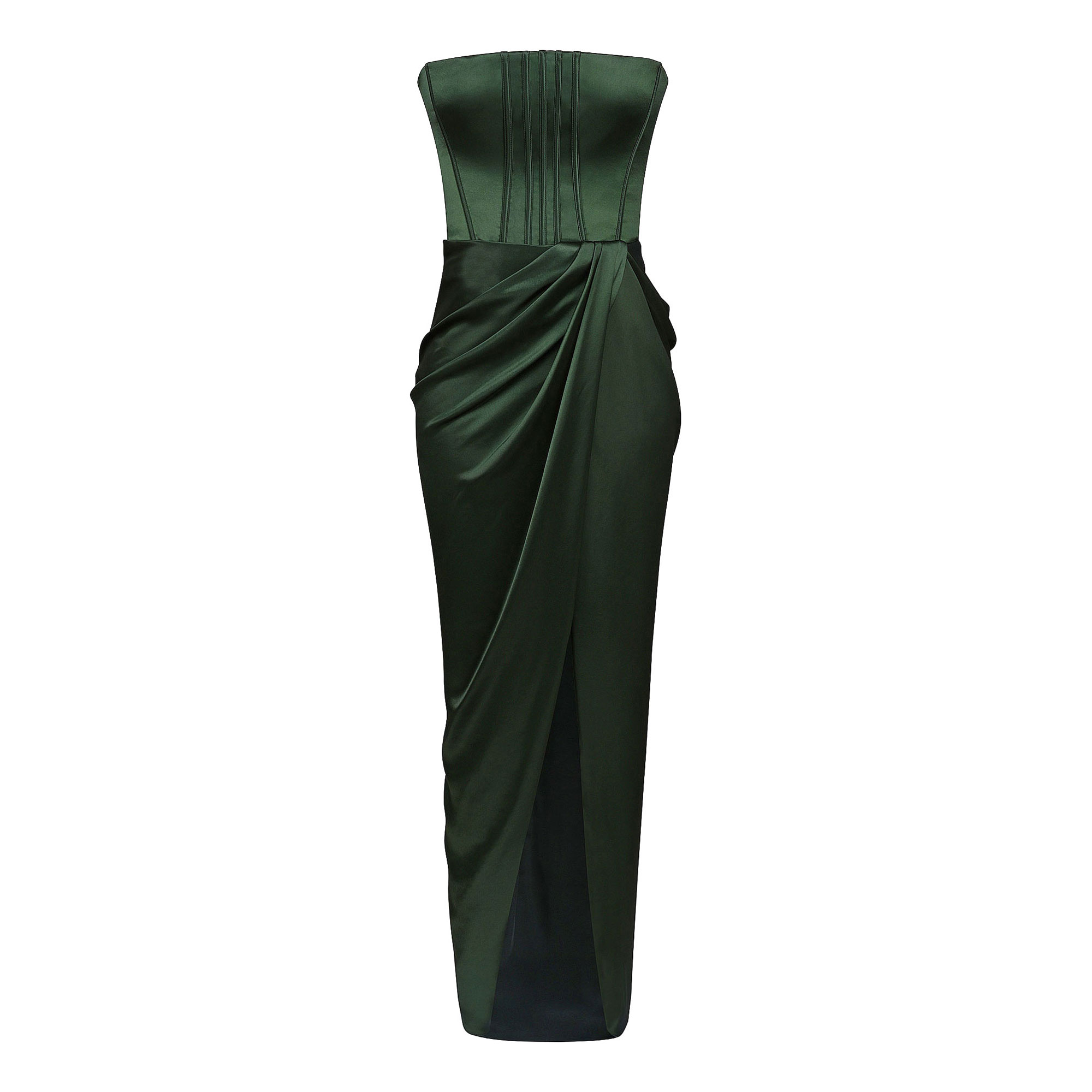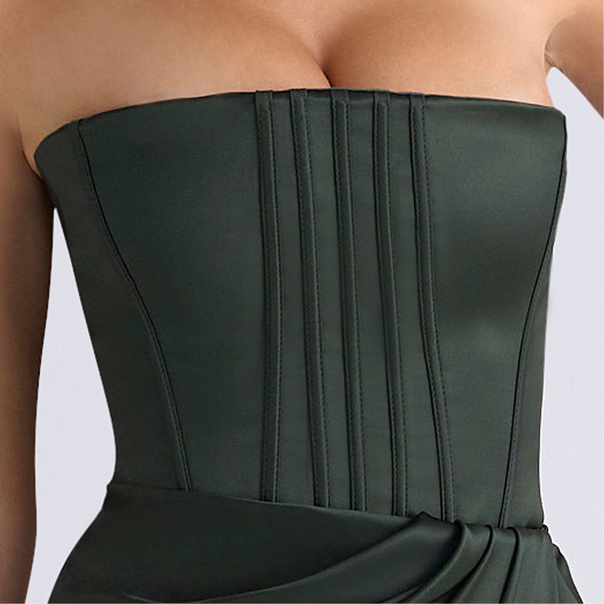 - Draping, structural corsetry, satin fabric, stretch-fused lining, strapless bustline, tailored corset, signature lace-up construction, ruched detailing, maxi length