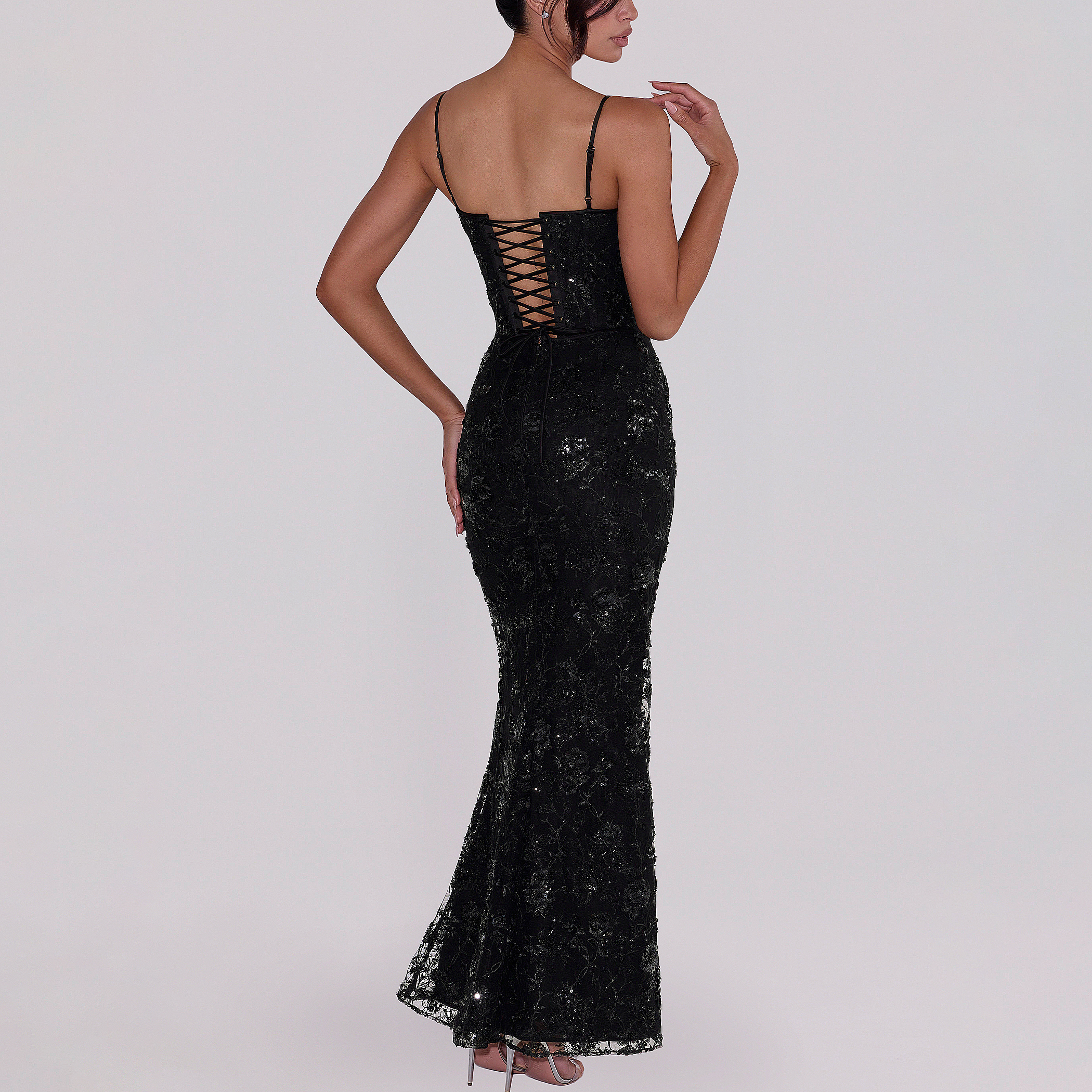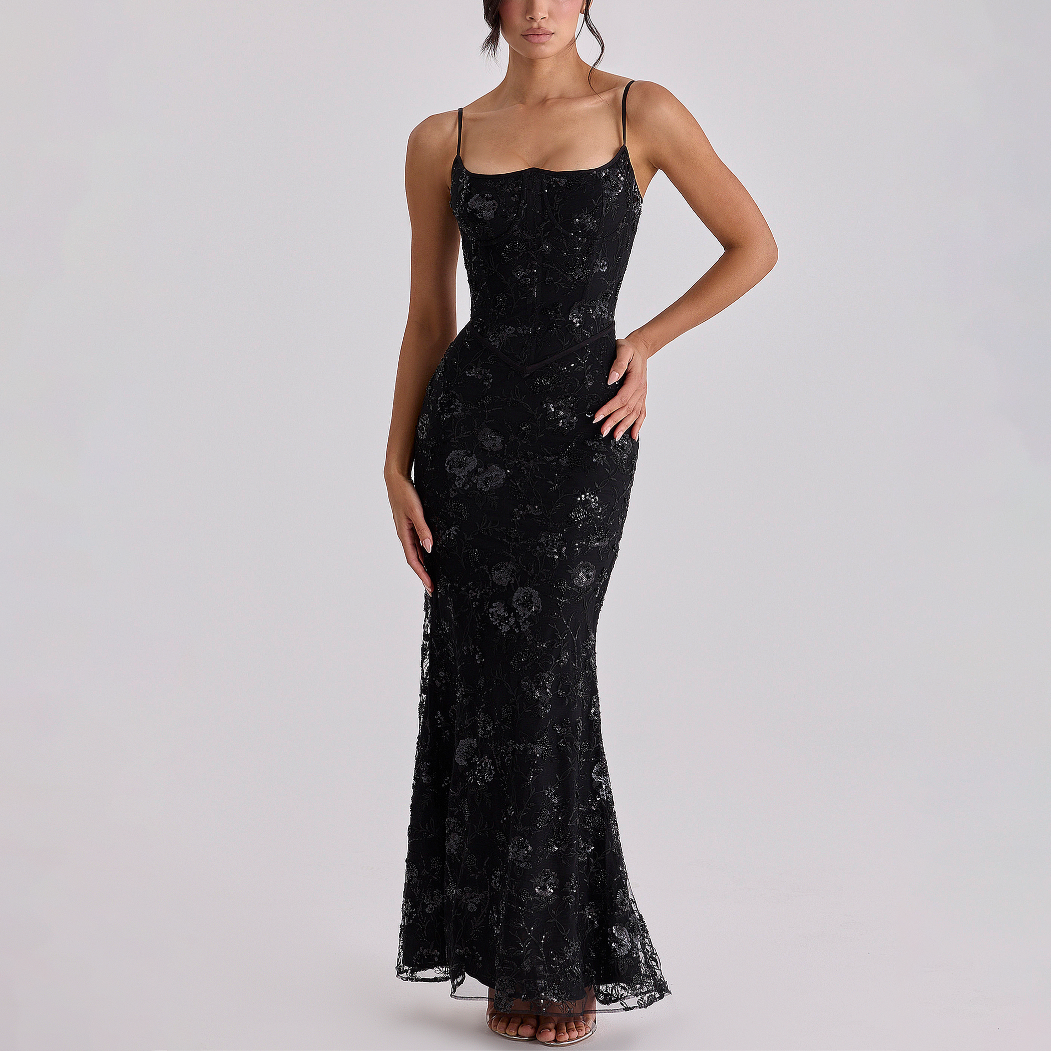 - Delicate embellished florals, sparkling beads on a sheer tulle overlay, power mesh base, signature corsetry, laces at the back, defined neckline and waistline, maxi length