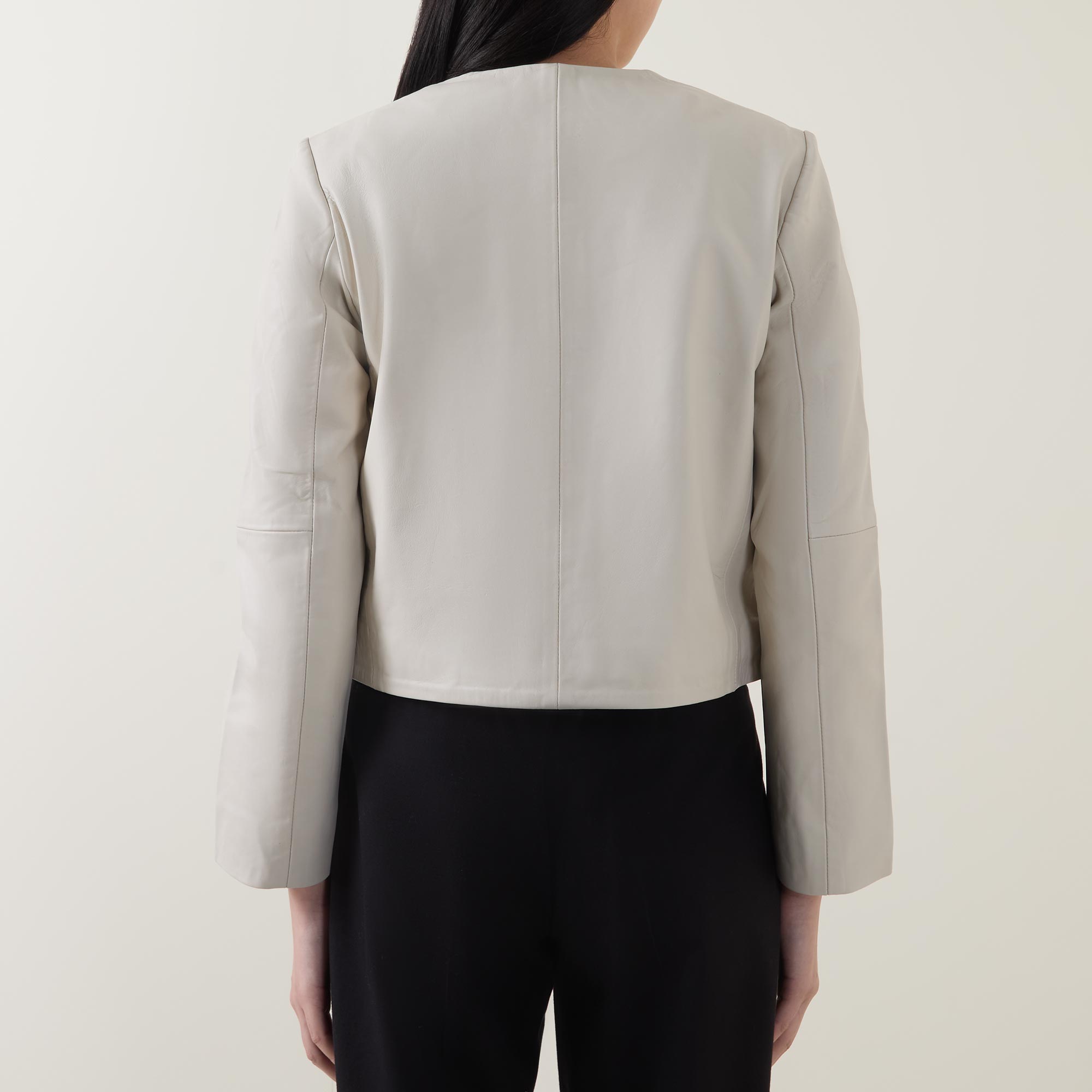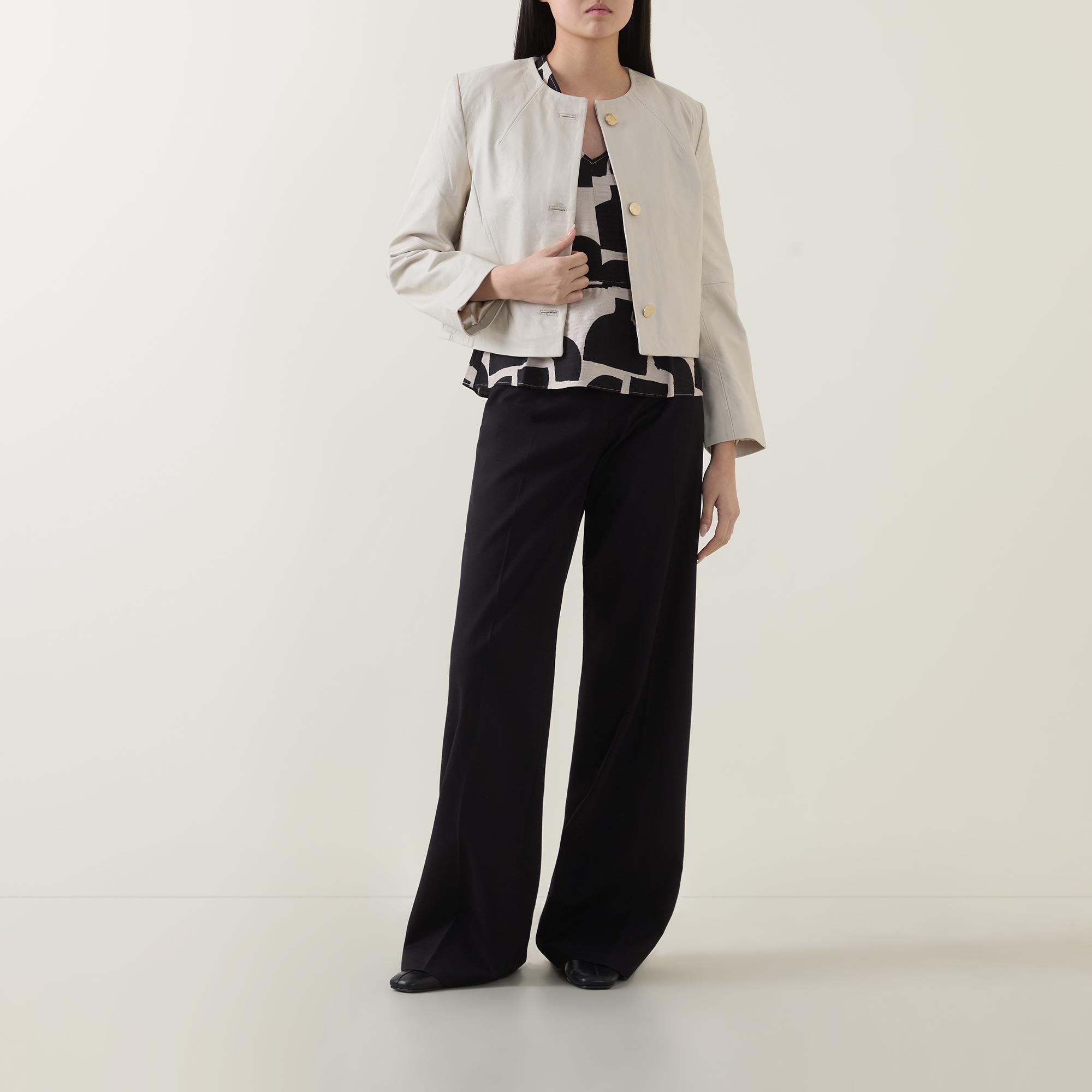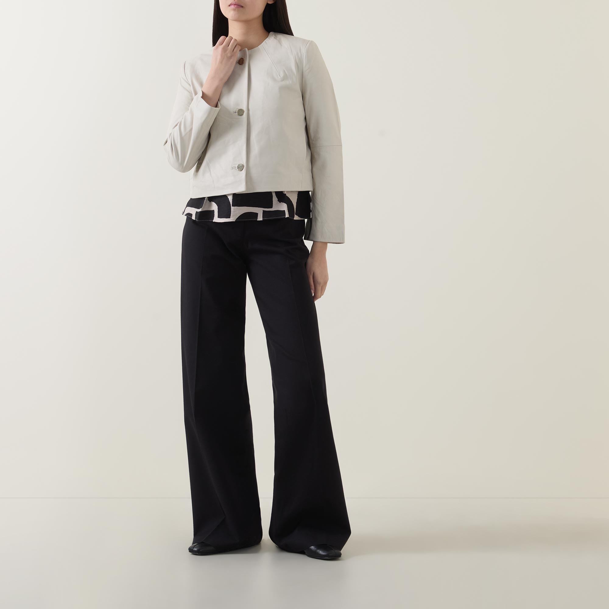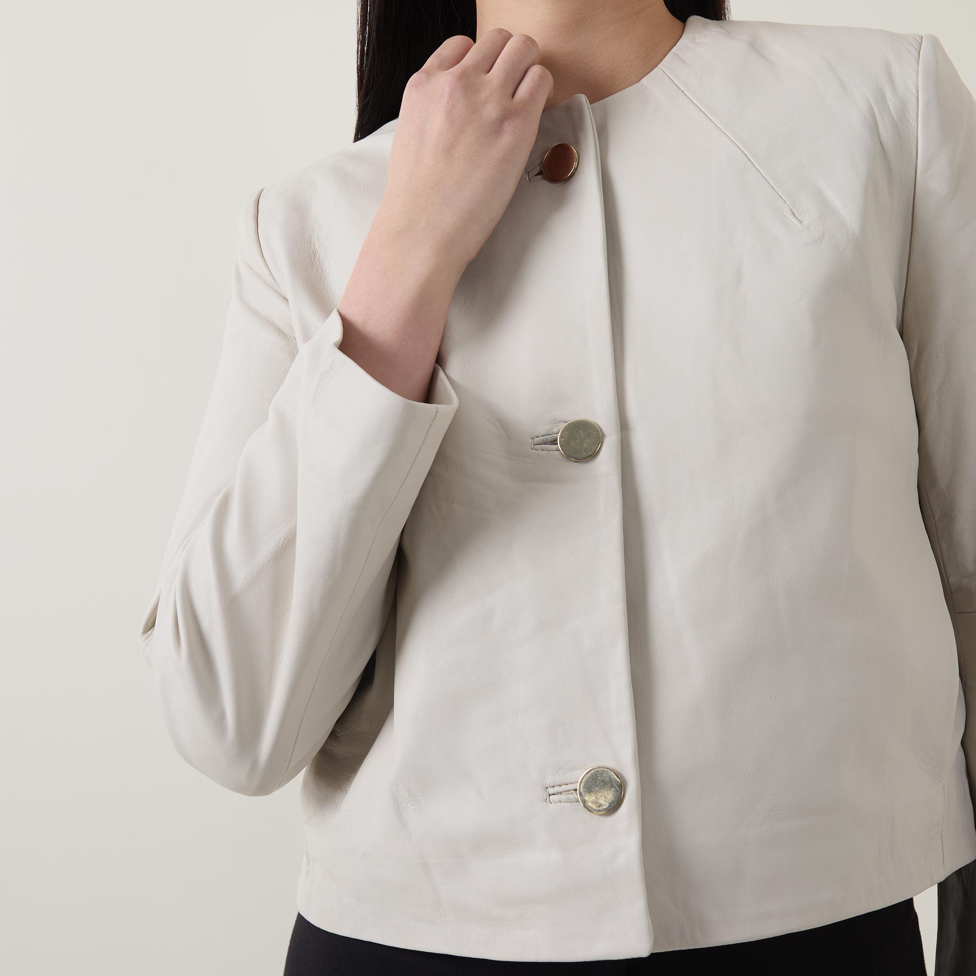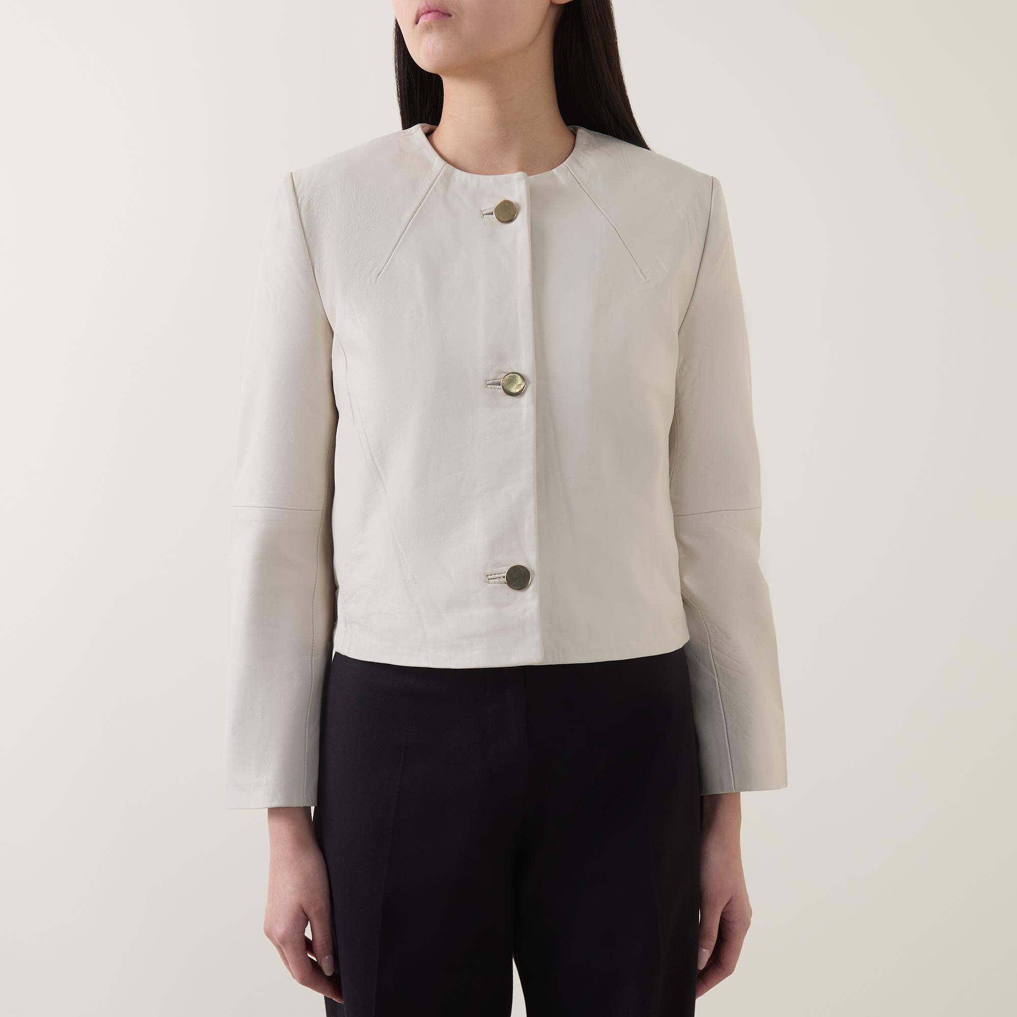 - Round neckline, button fastening, long sleeves, seam details, cropped length