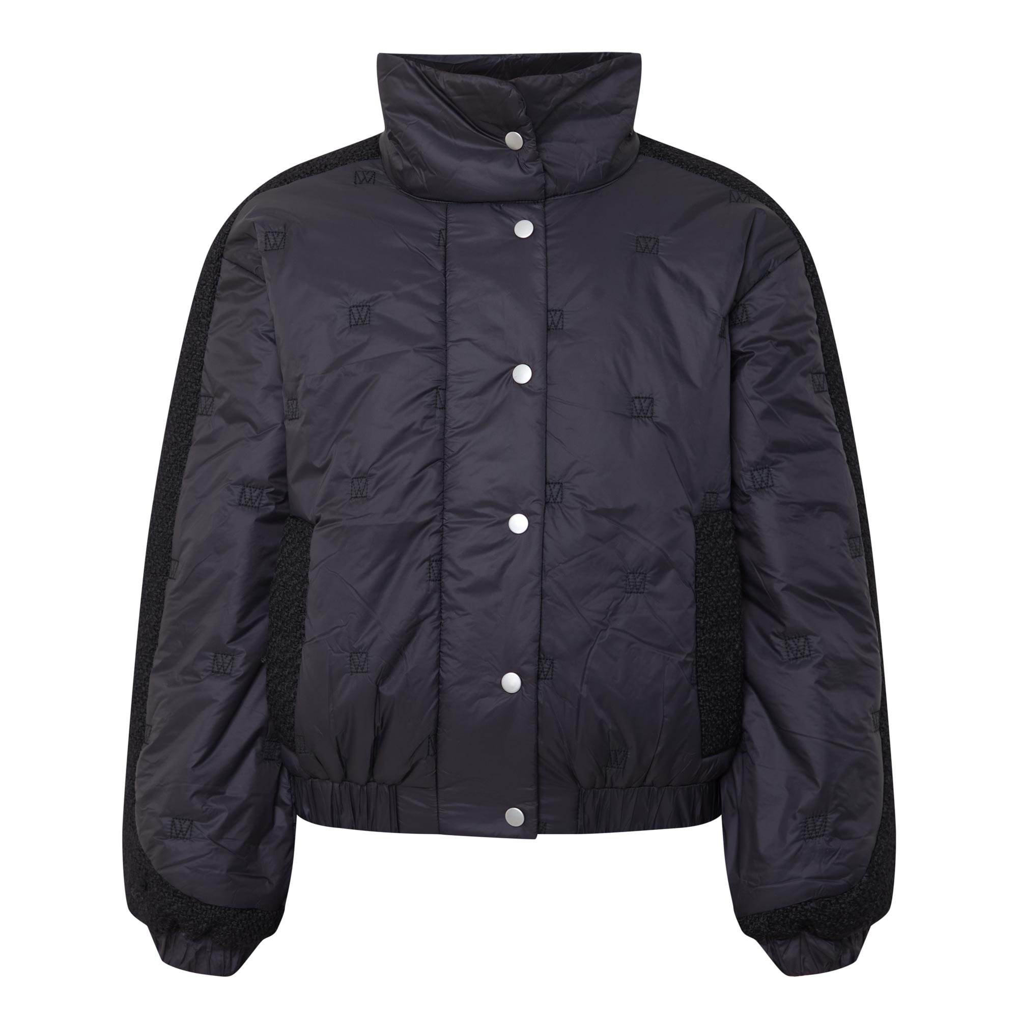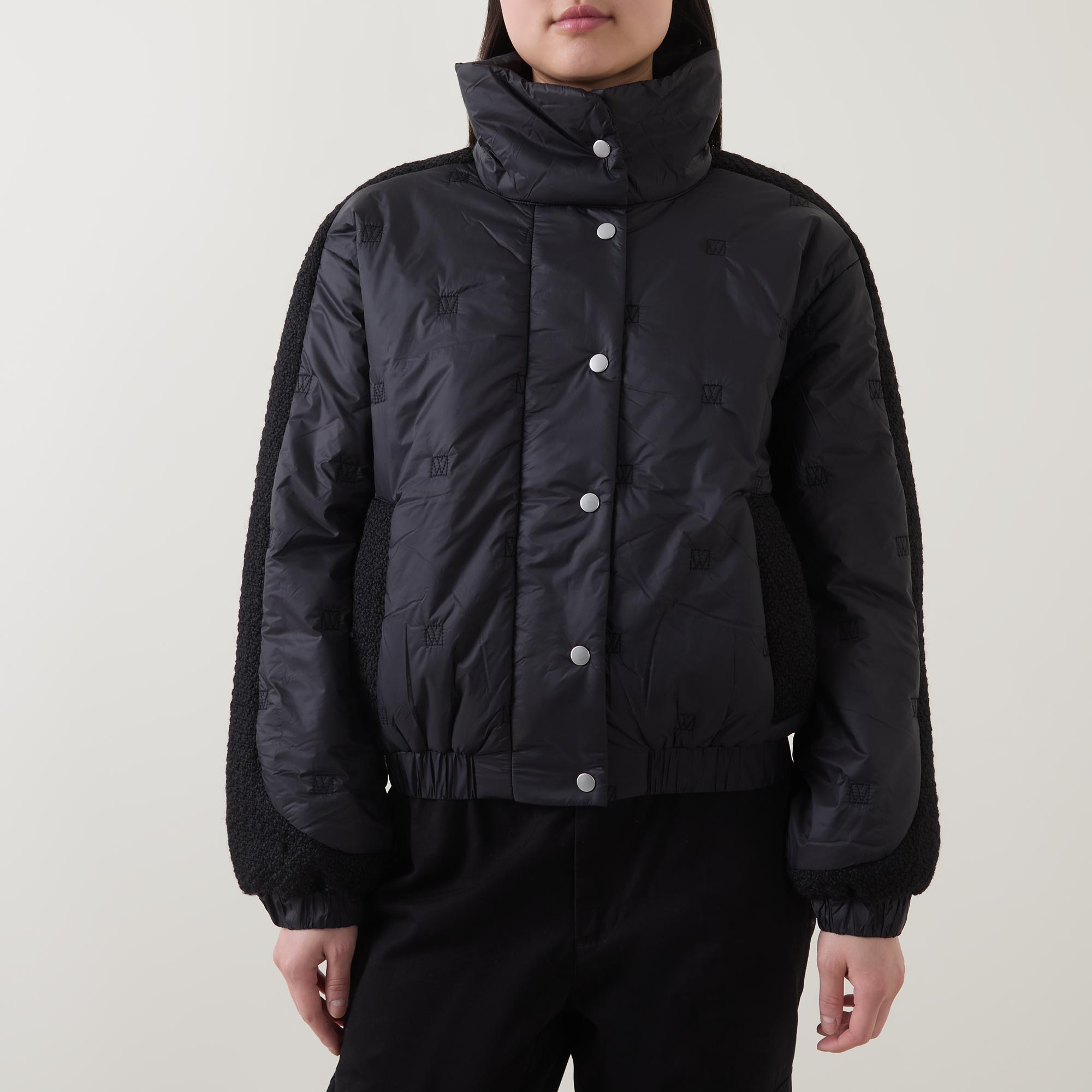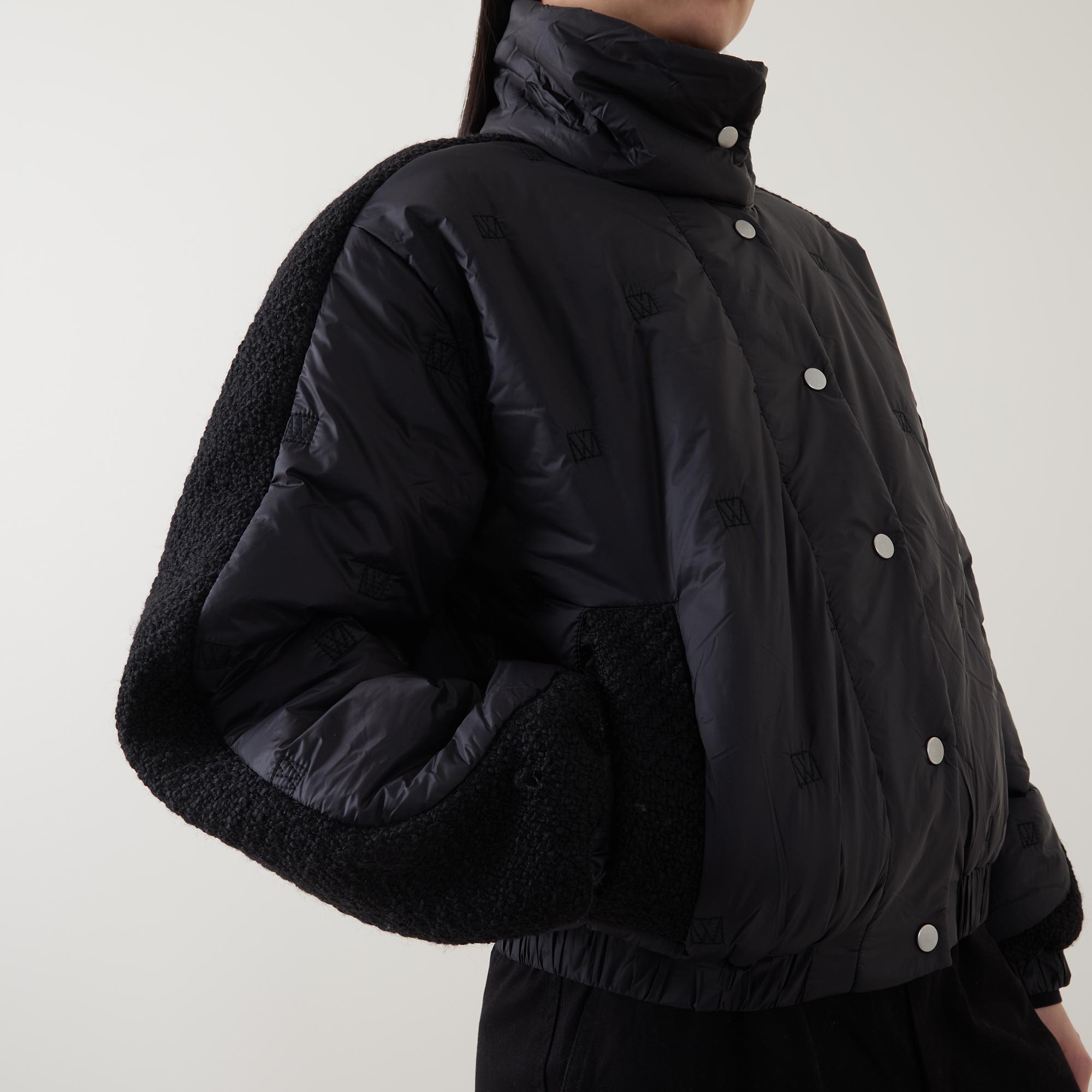 - Boxy fit, high stand collar, snap button fastenings, quilted construction, contrast textured panels alongside sleeves and the sides, elasticated hem