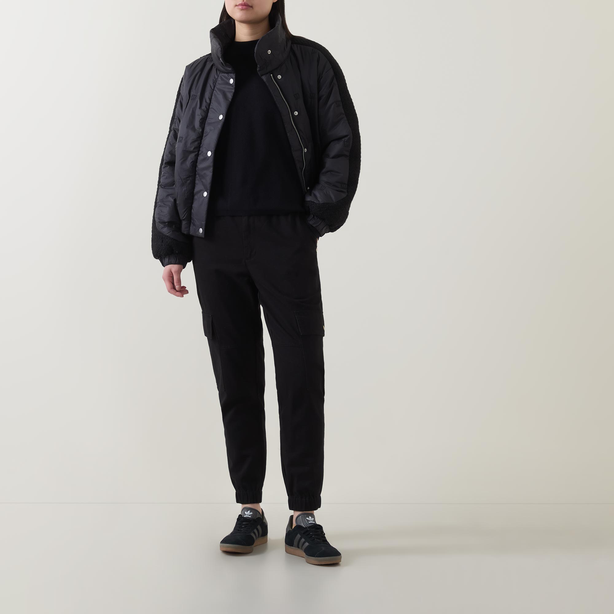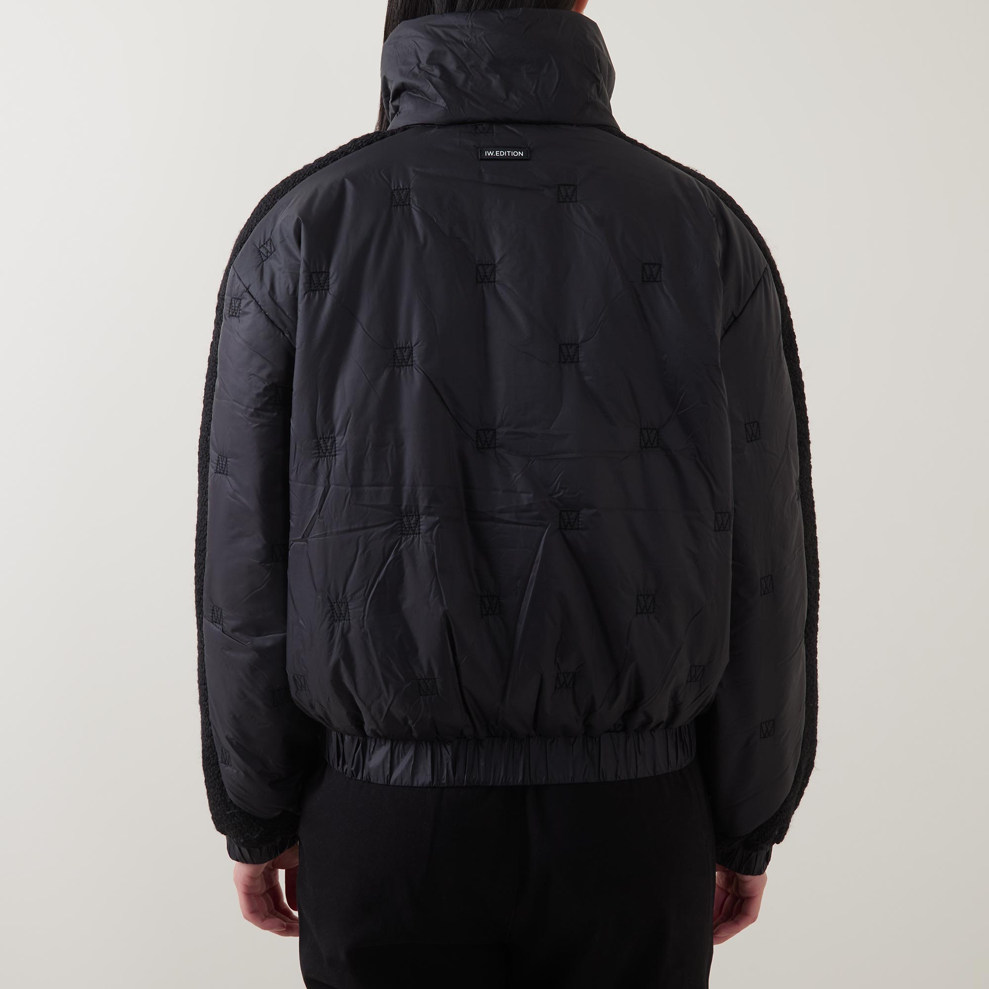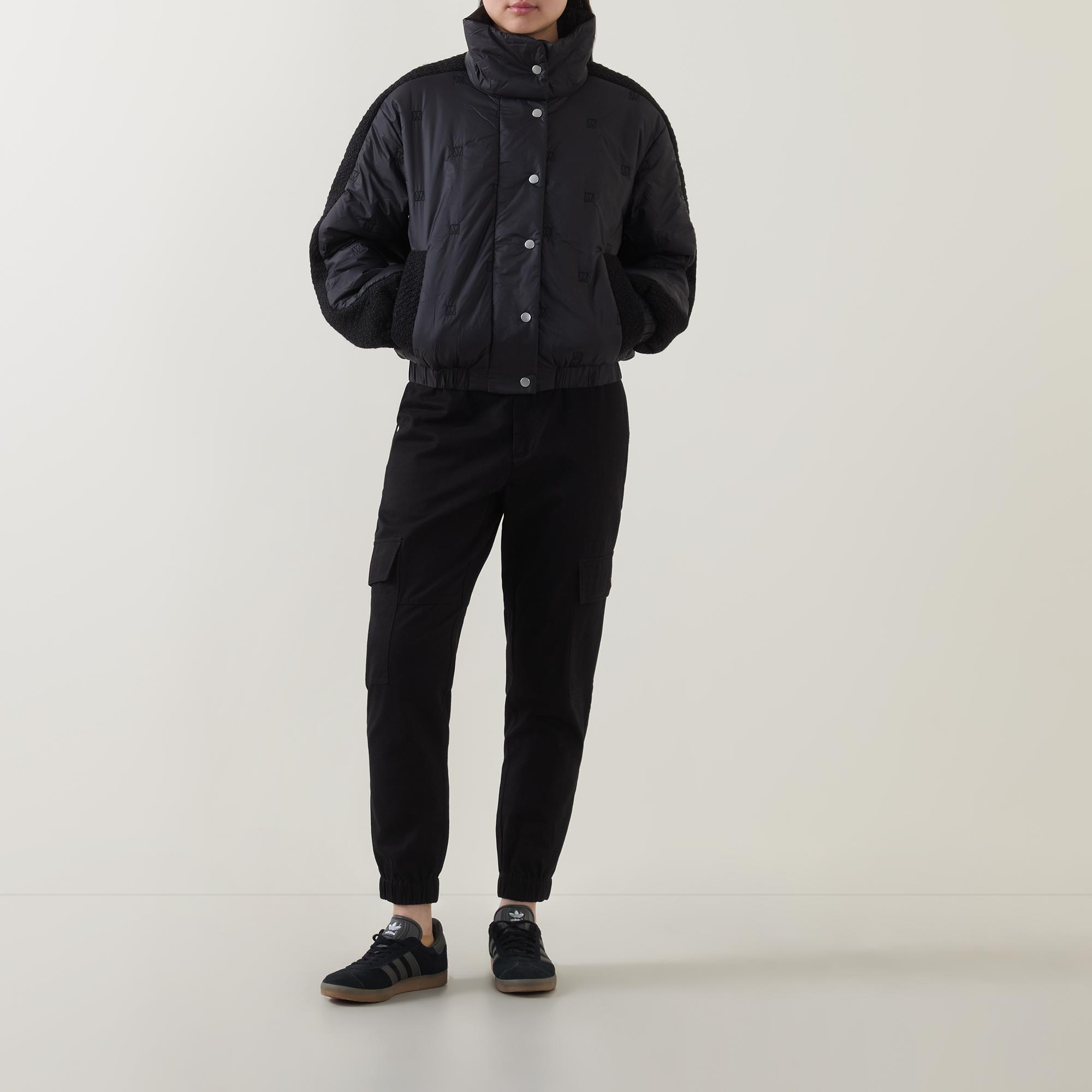 - Boxy fit, high stand collar, snap button fastenings, quilted construction, contrast textured panels alongside sleeves and the sides, elasticated hem