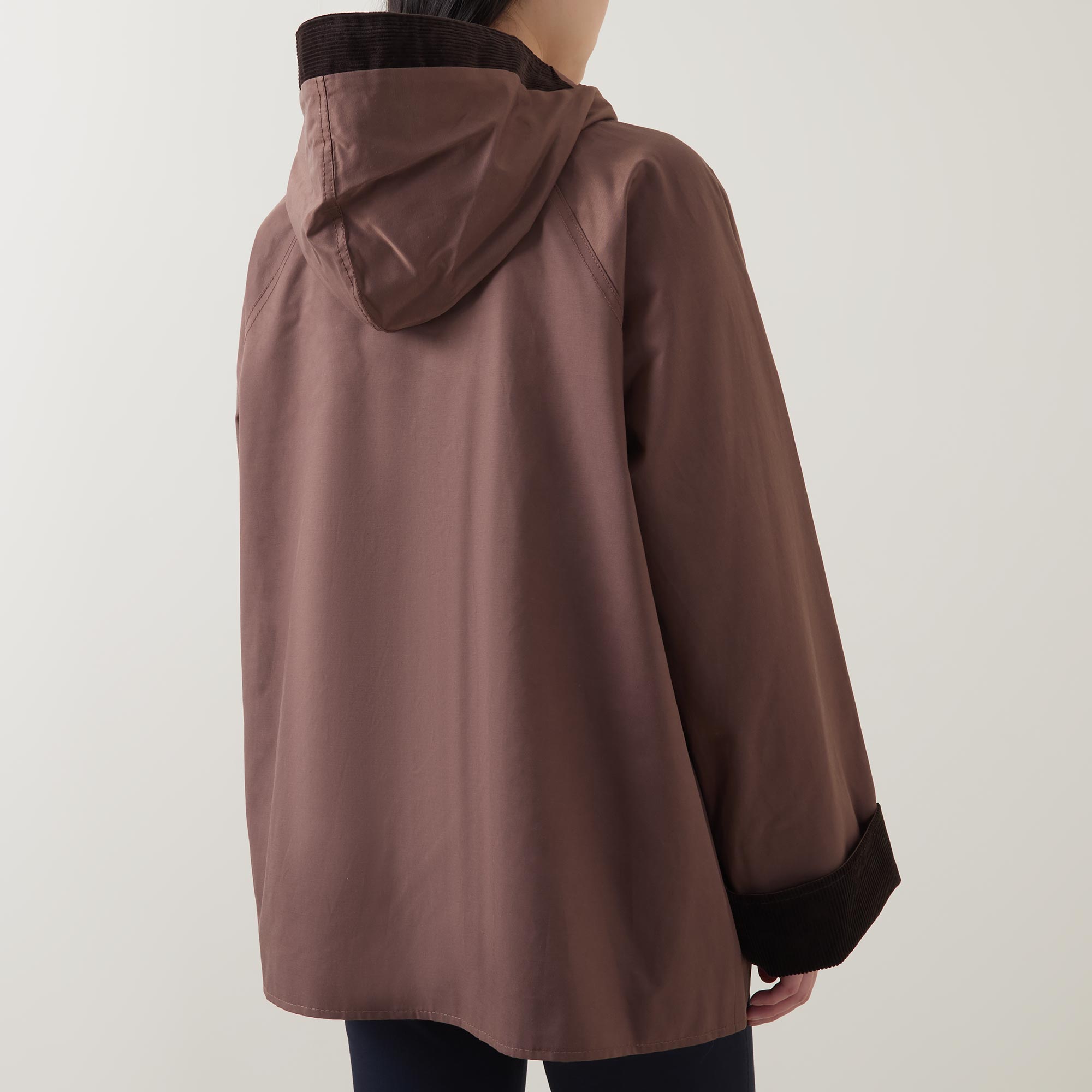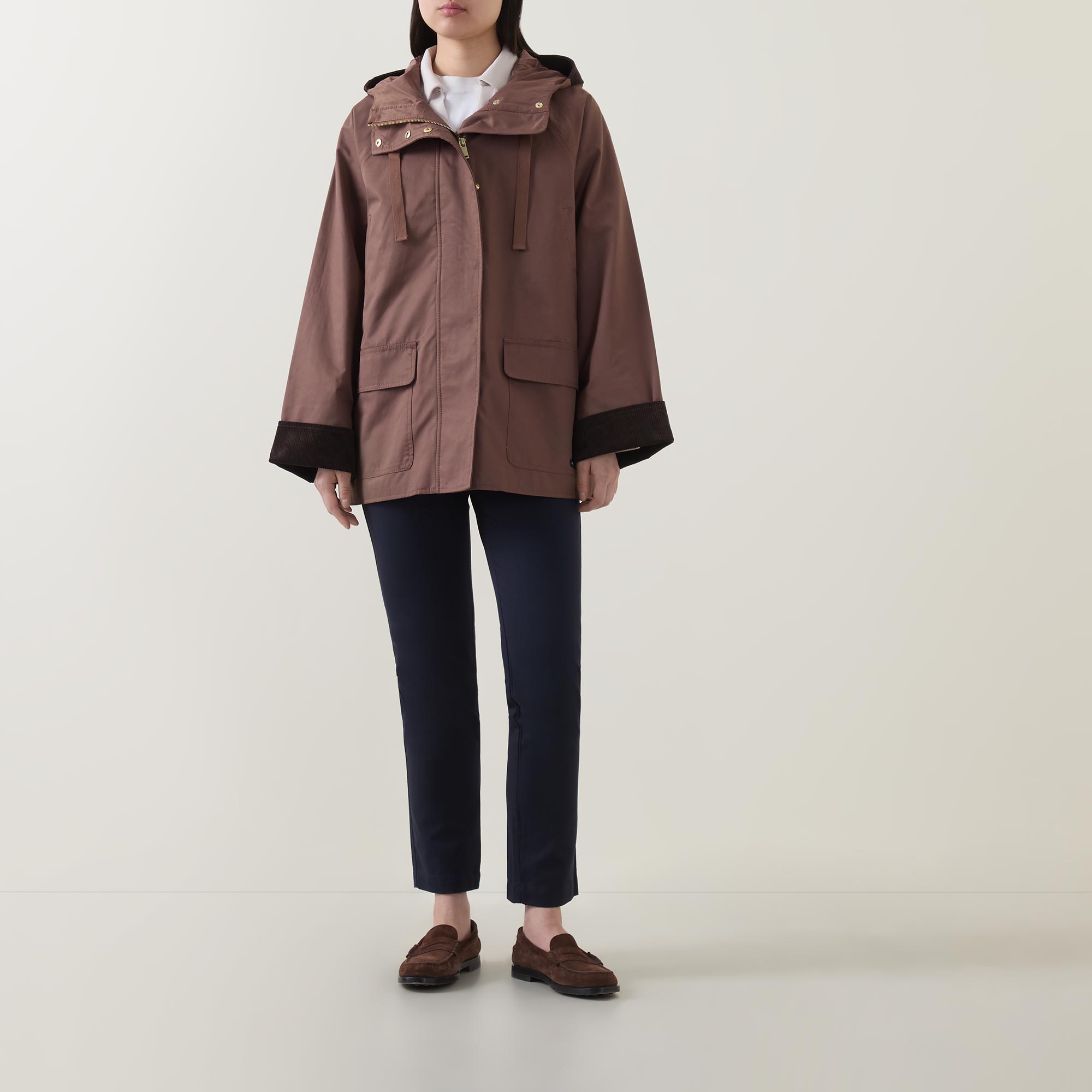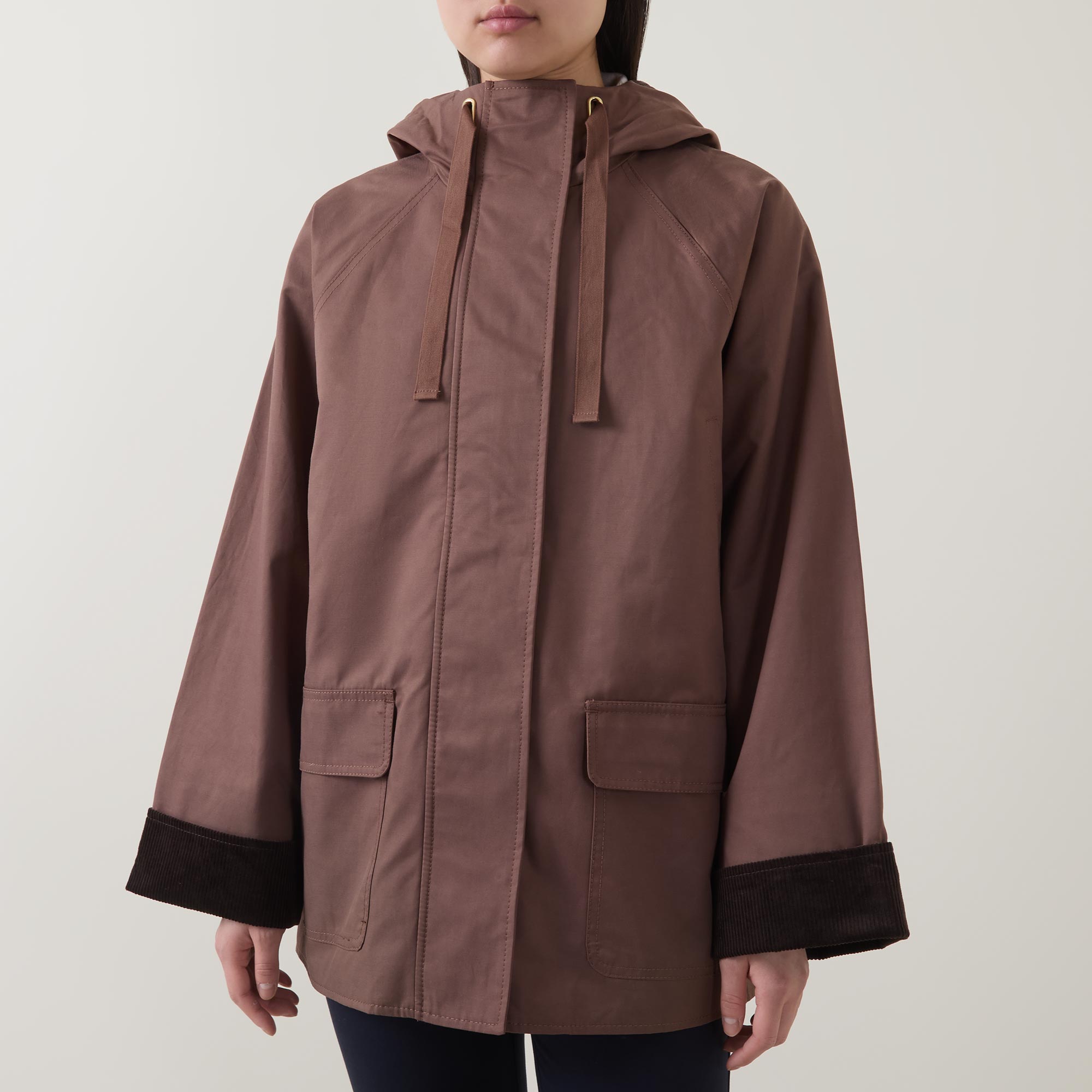 - Boxy fit, stand collar, long sleeves, concealed zip and snap button placket, two flap pockets, hood, relaxed fit