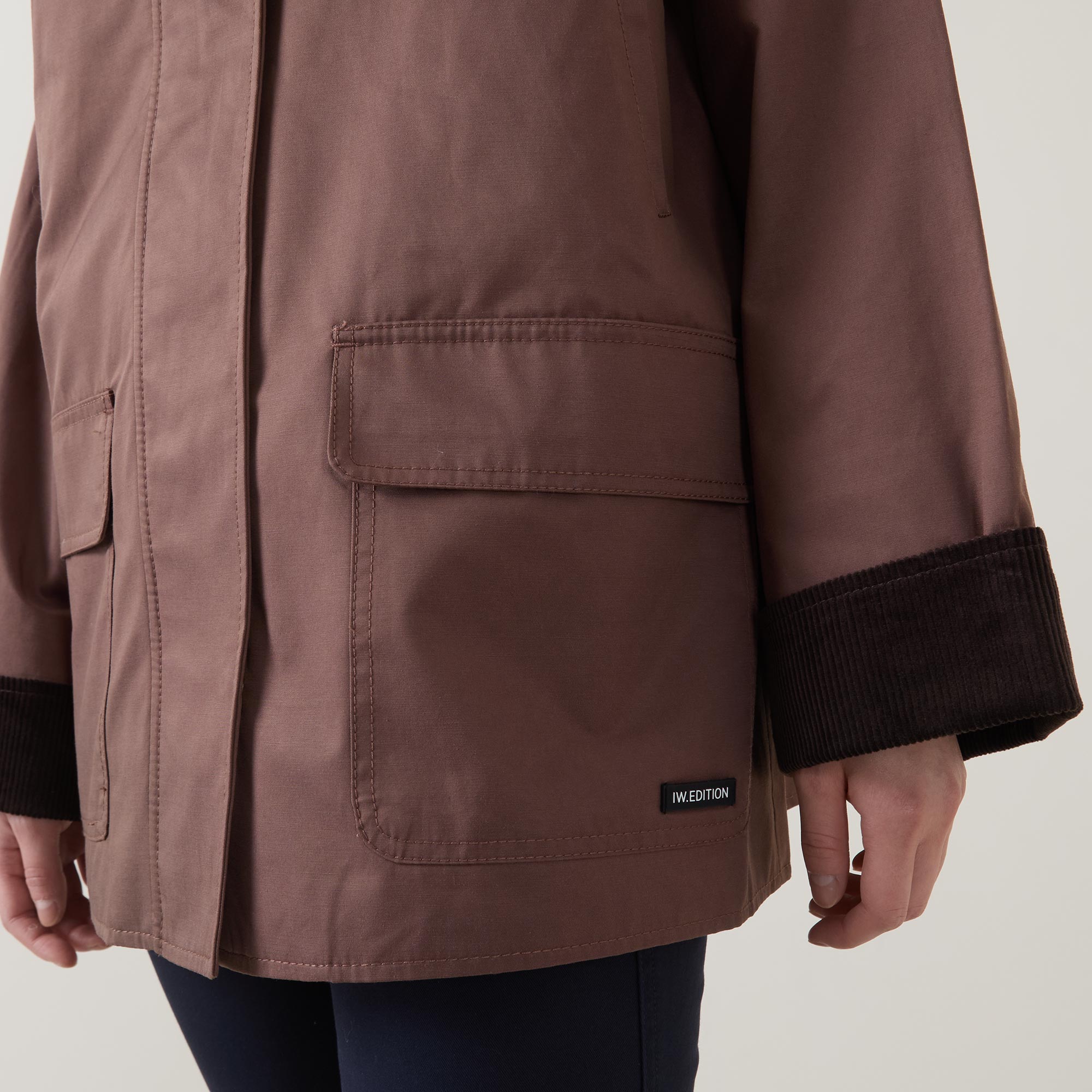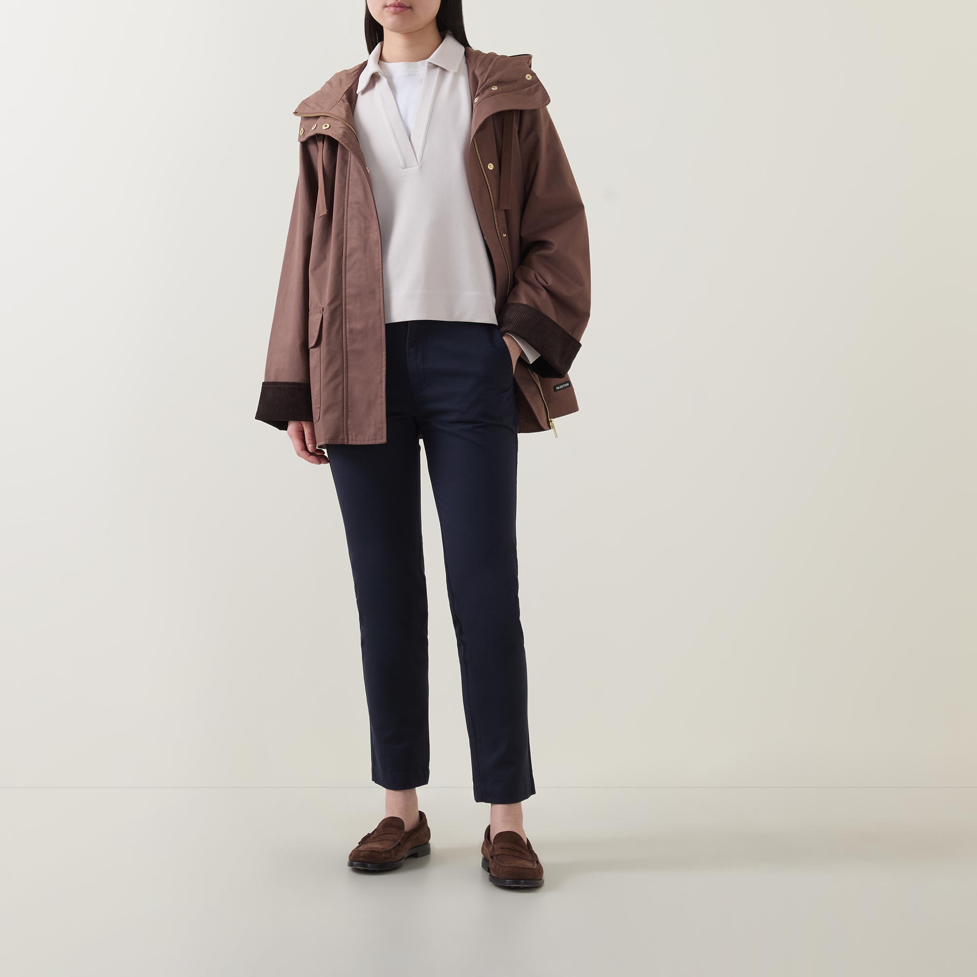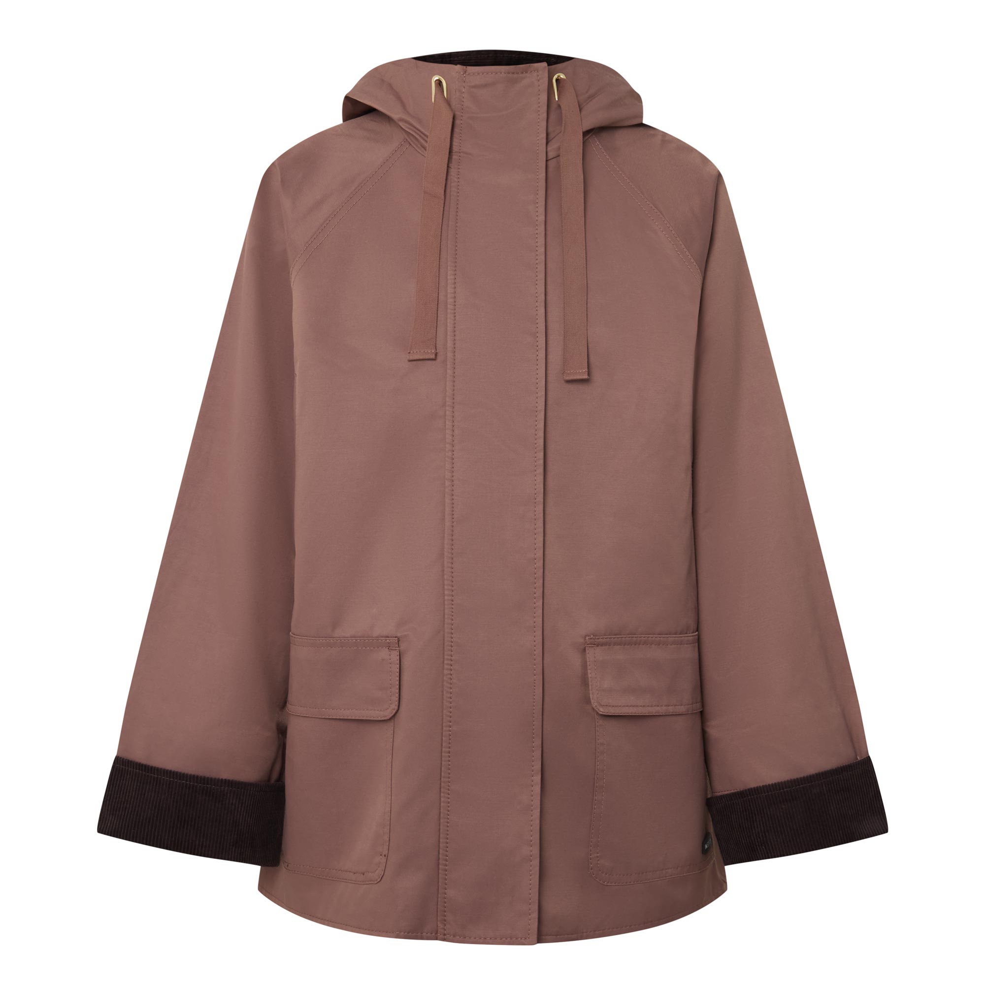 - Boxy fit, stand collar, long sleeves, concealed zip and snap button placket, two flap pockets, hood, relaxed fit