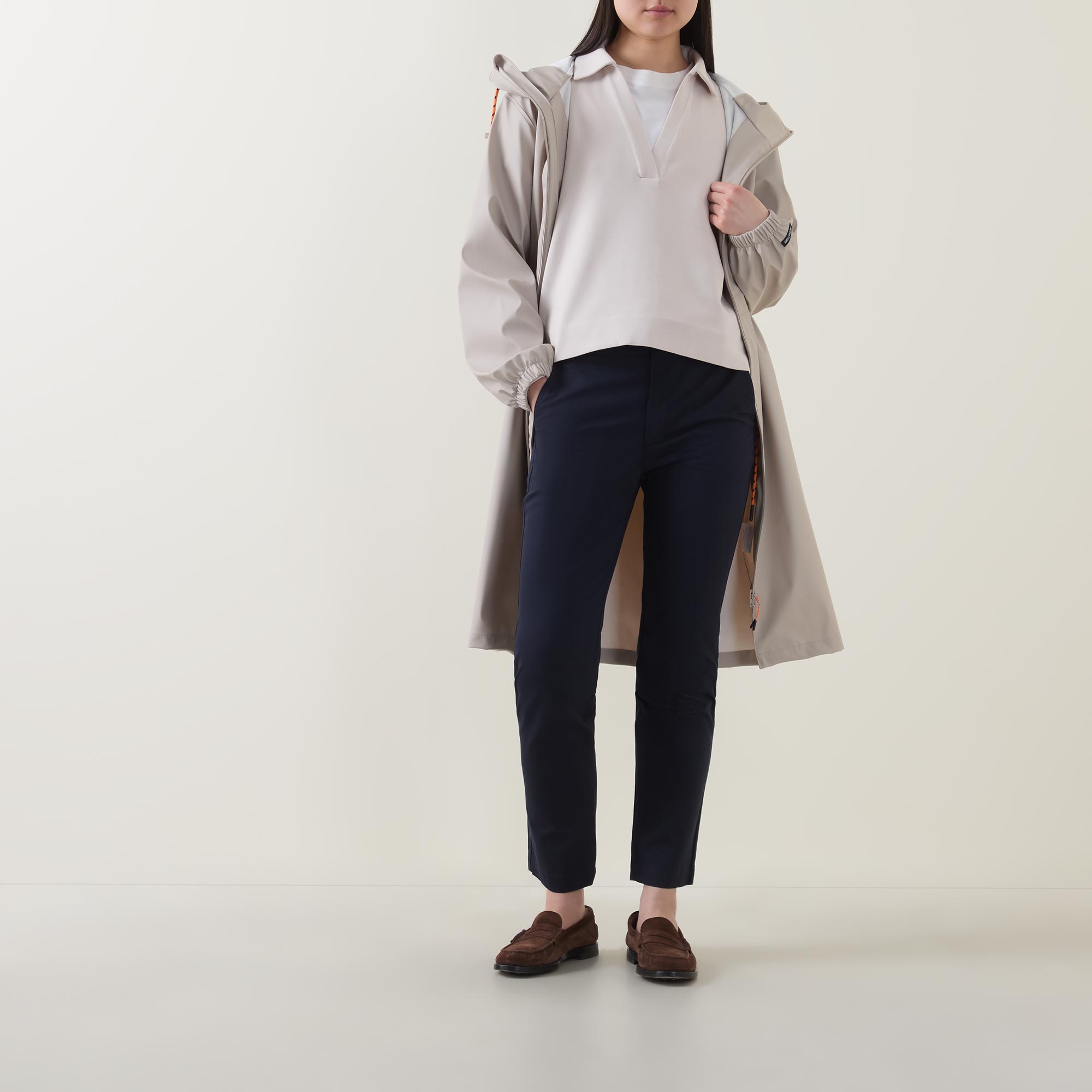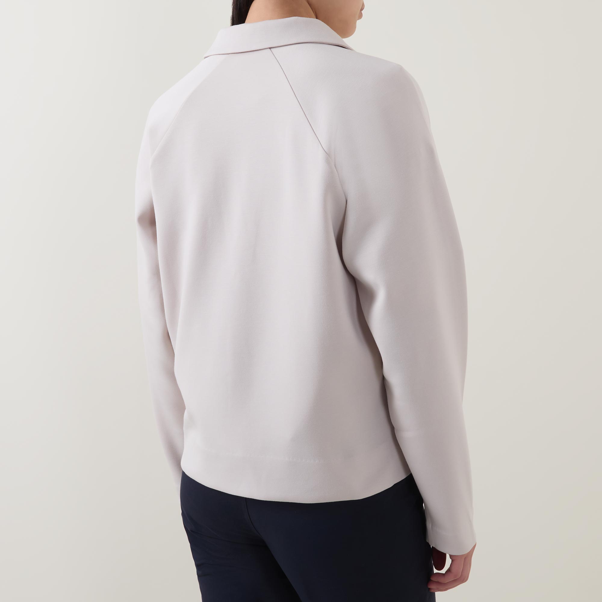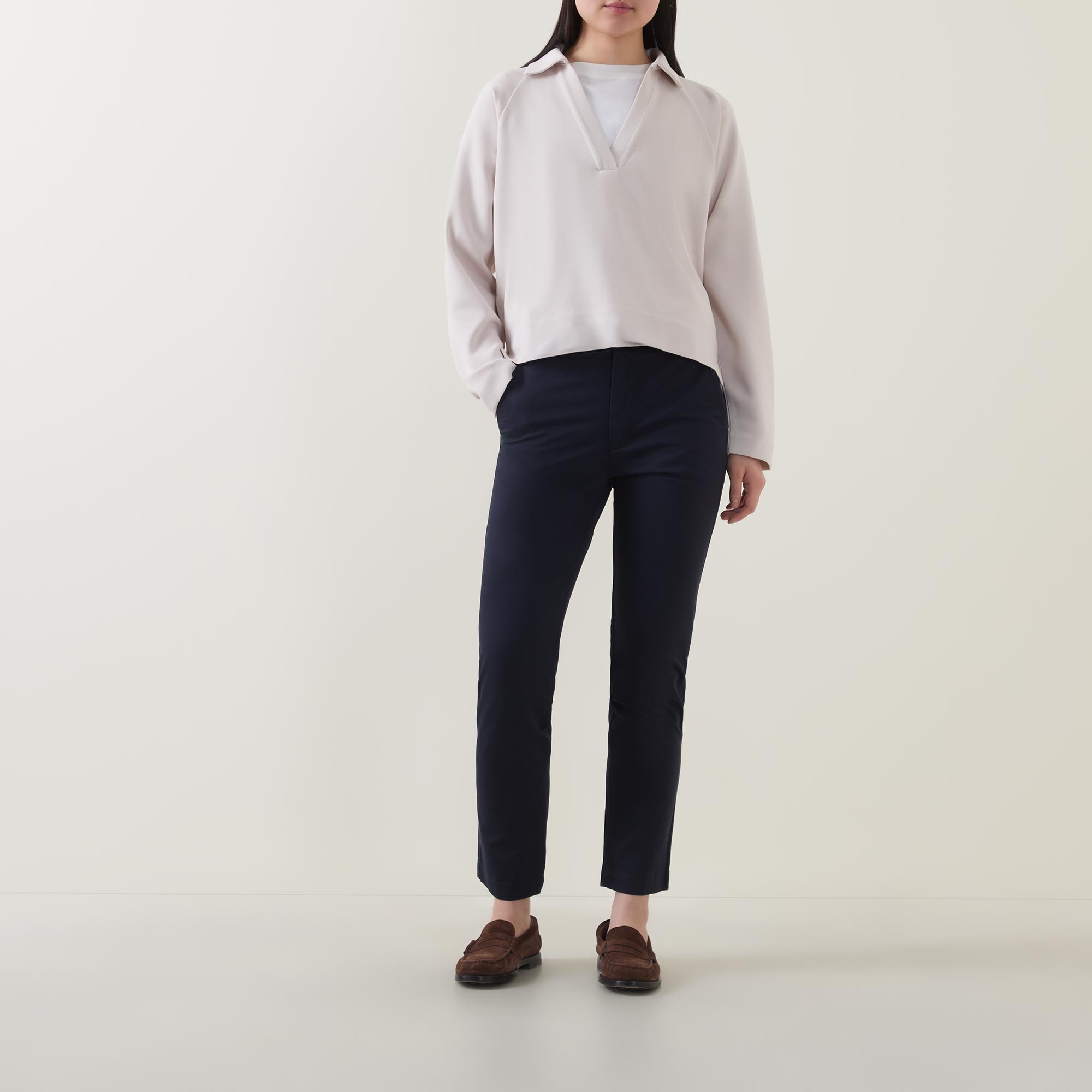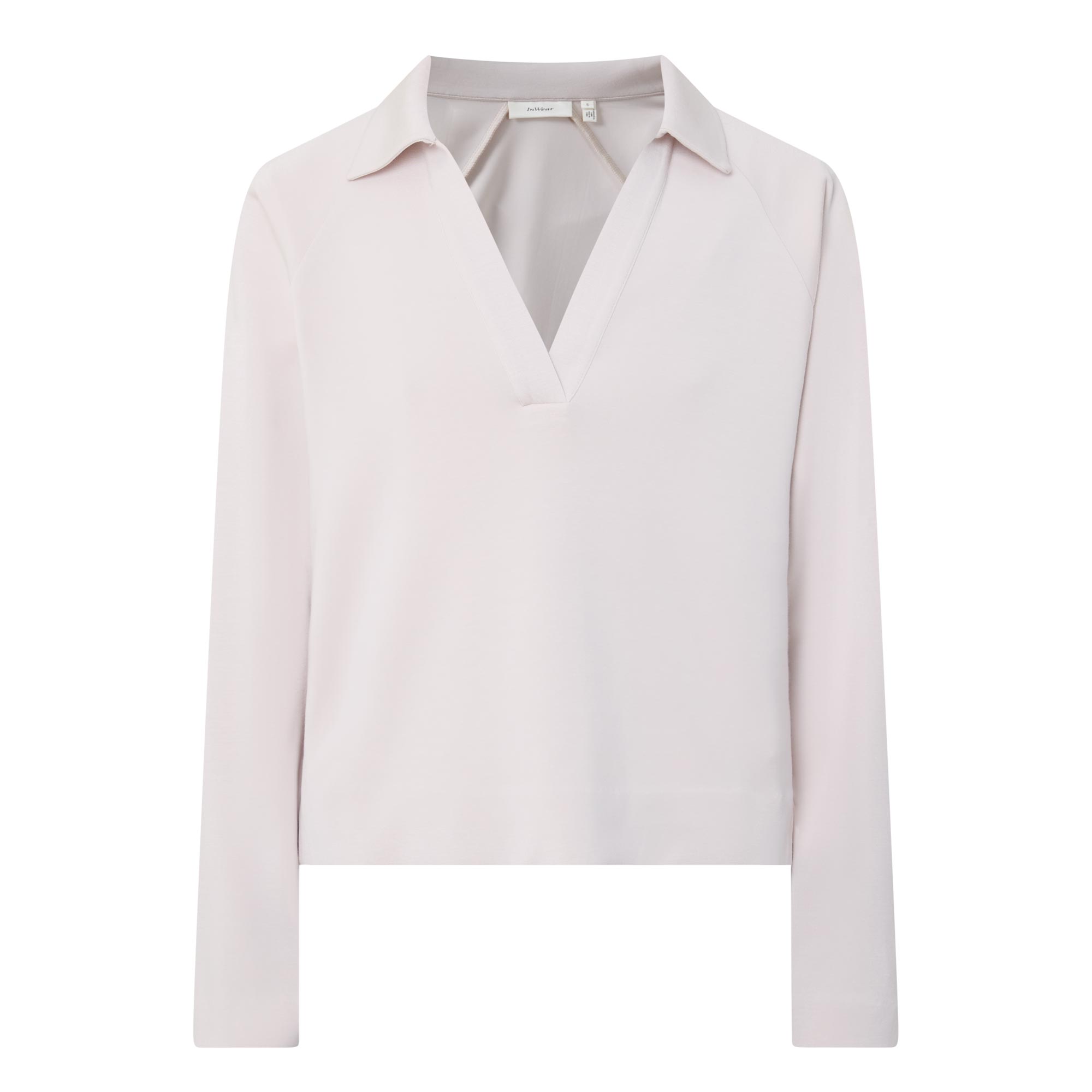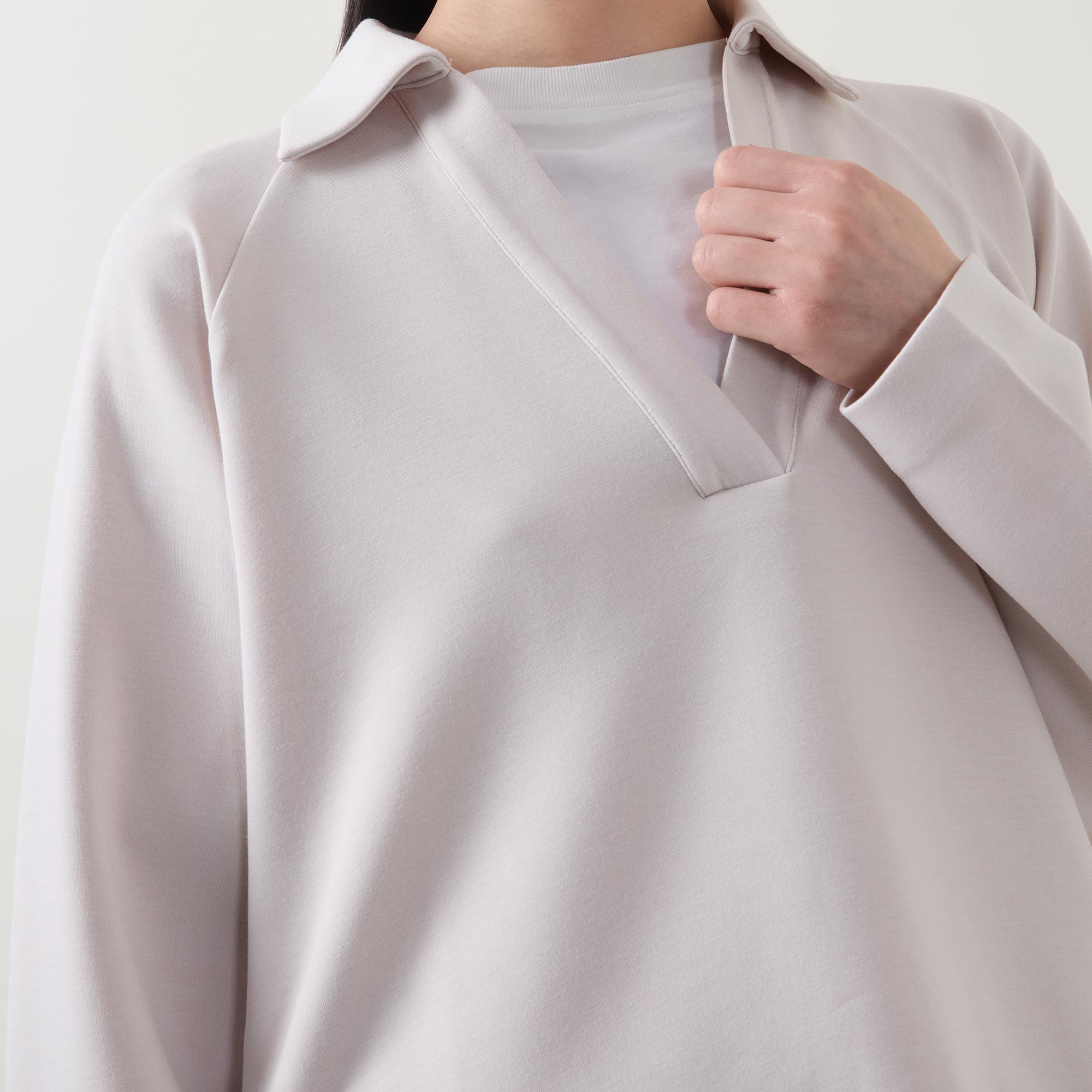 - Long sleeves, V-neck, polo collar, relaxed fit, stretch fabric