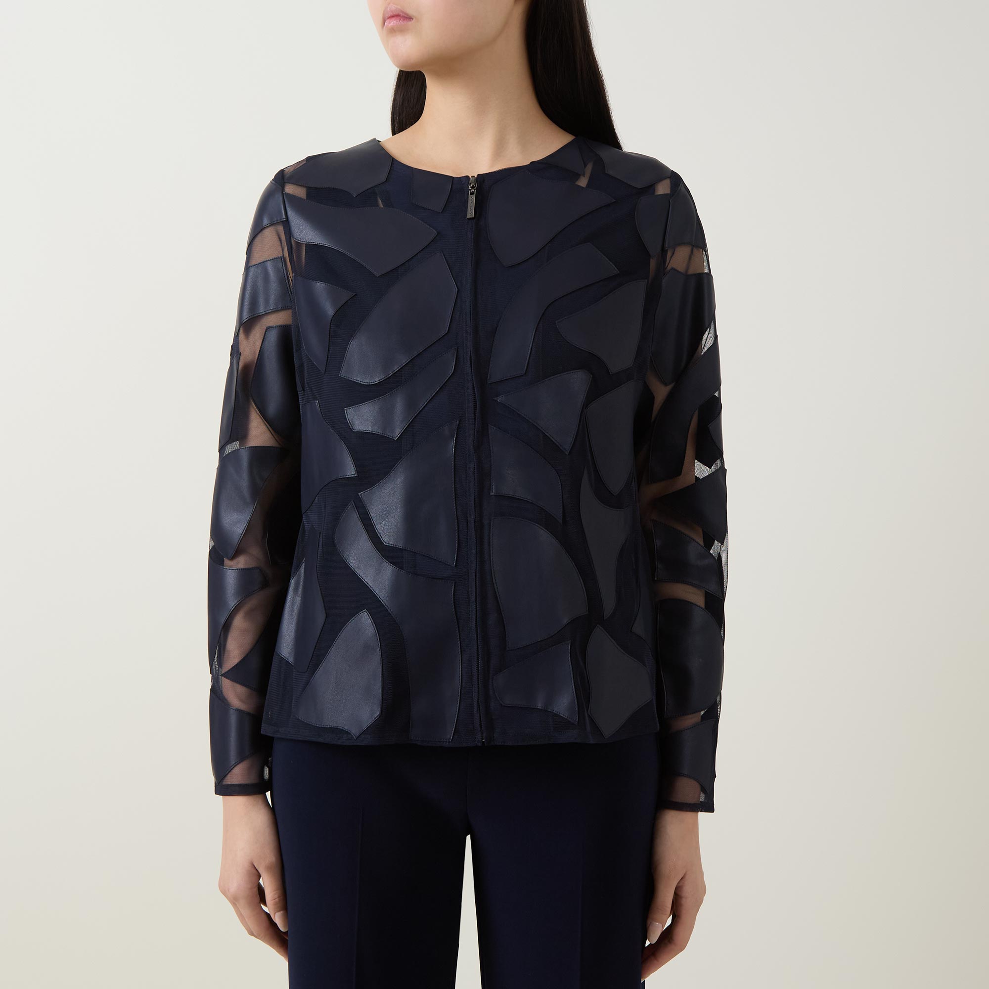 - Laser cut details, round neck, long sleeves, zip fastening