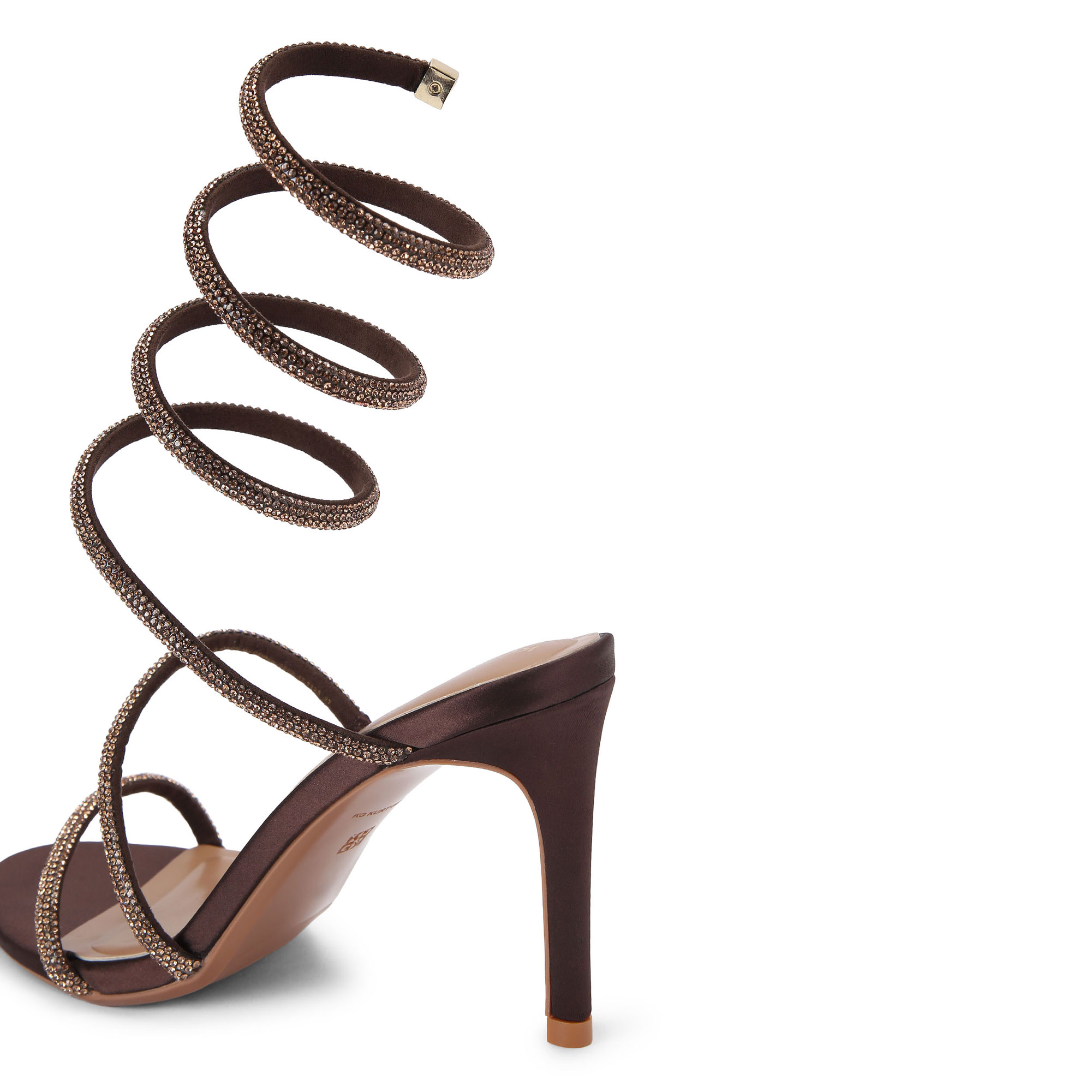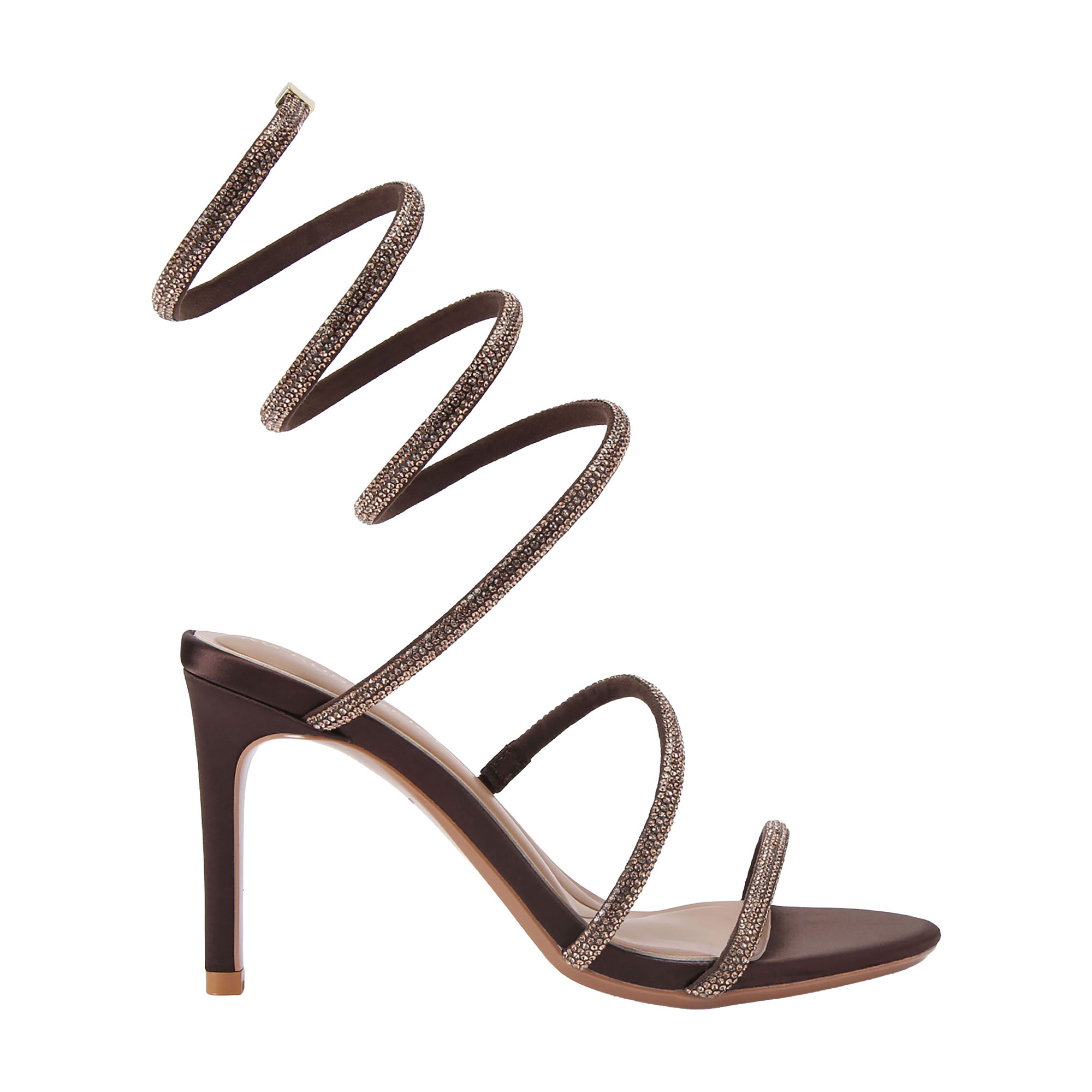 - Satin finish, spiral straps, bronze-tone crystal embellishment, high stiletto heel