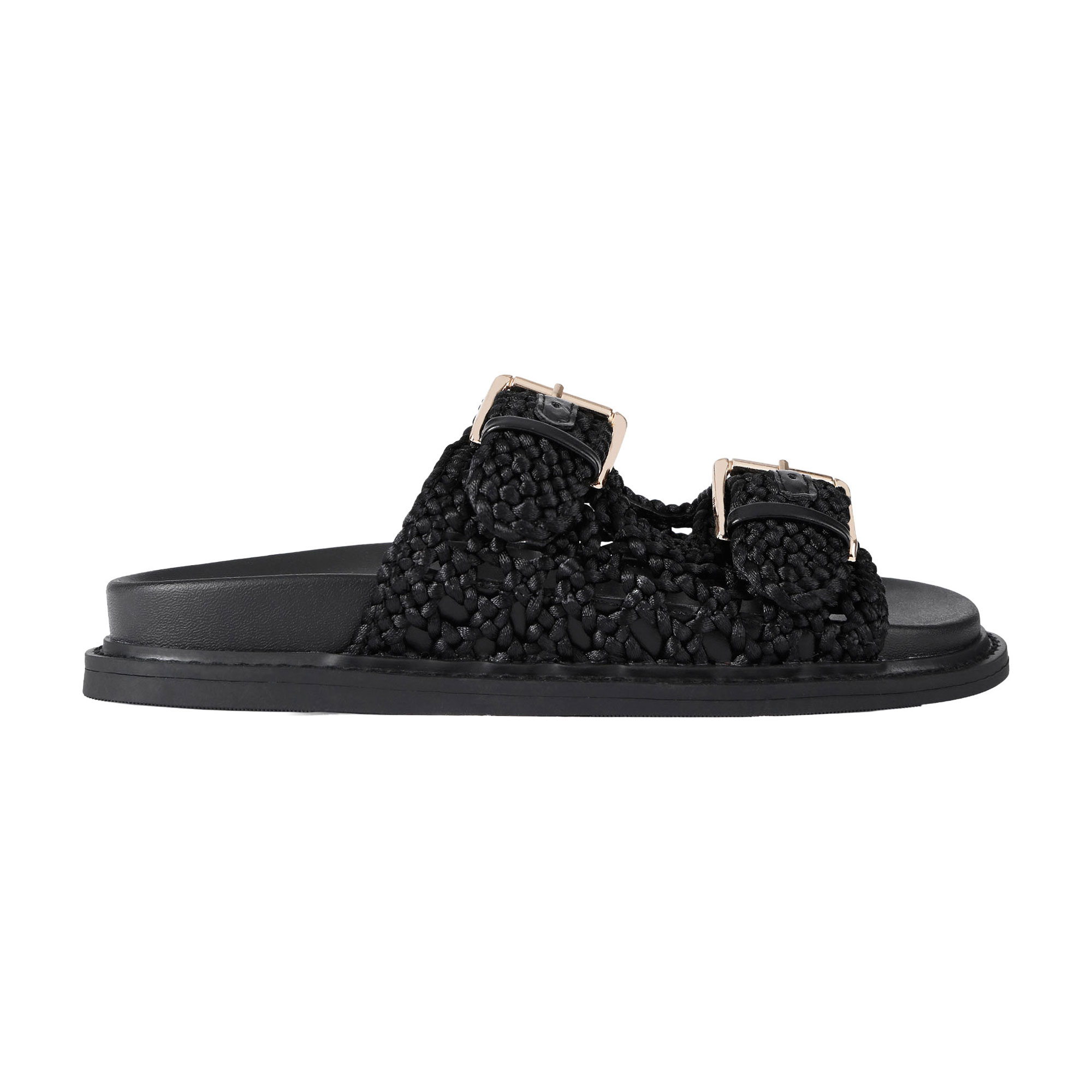 • Rope fabric which is woven into straps, buckles across each of the foot straps, moulded footbed