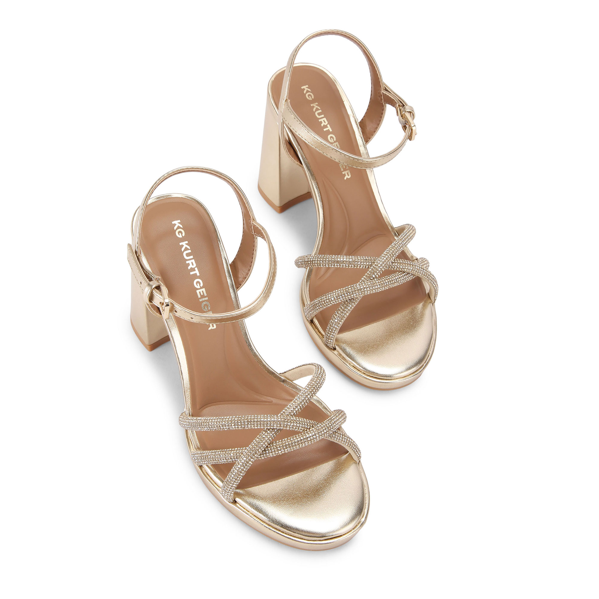 - Platform heel, strappy upper, crystal embellished toe straps, ankle strap fastening, gold-tone hardware