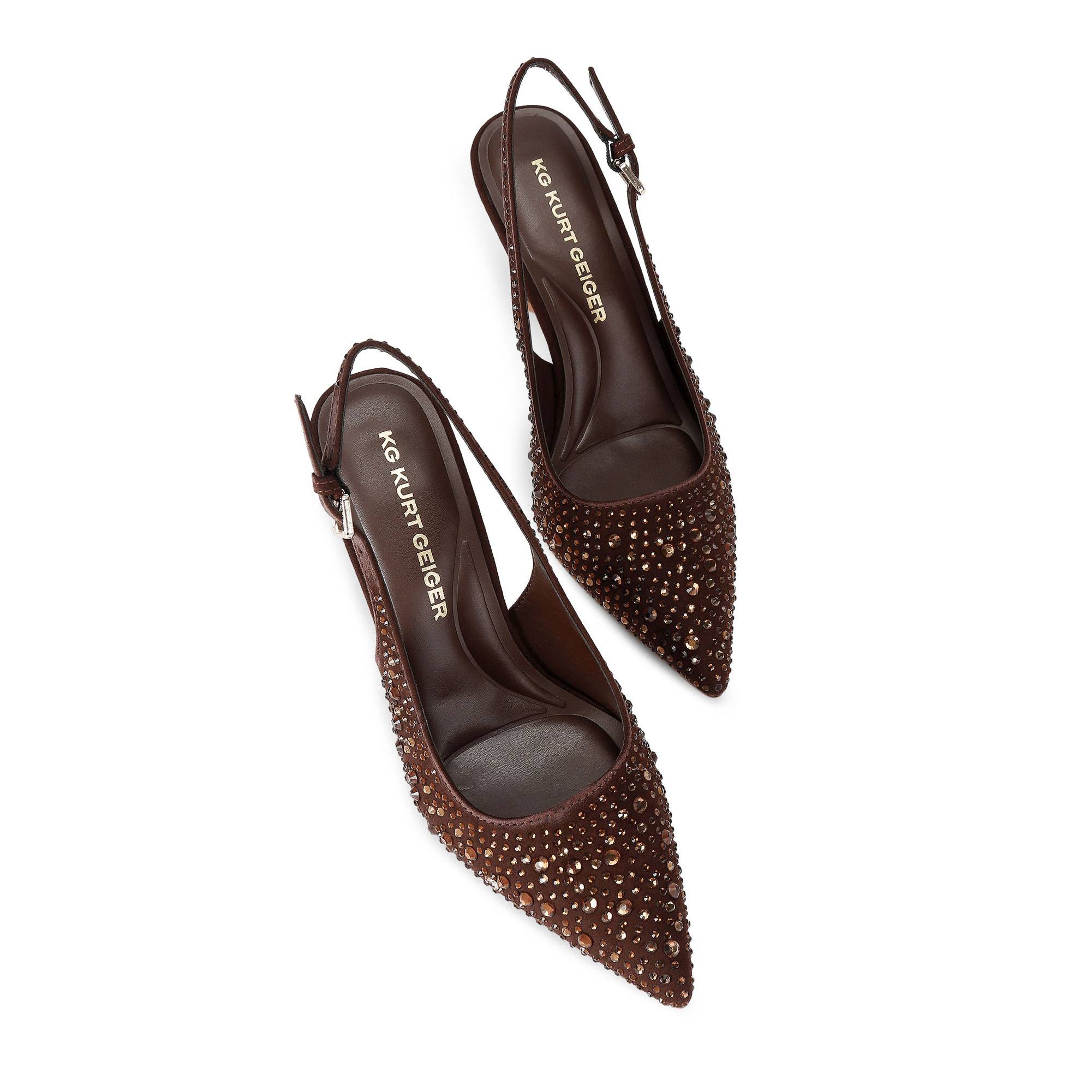 • Crystal embellishment, pointed toe, high curved heel