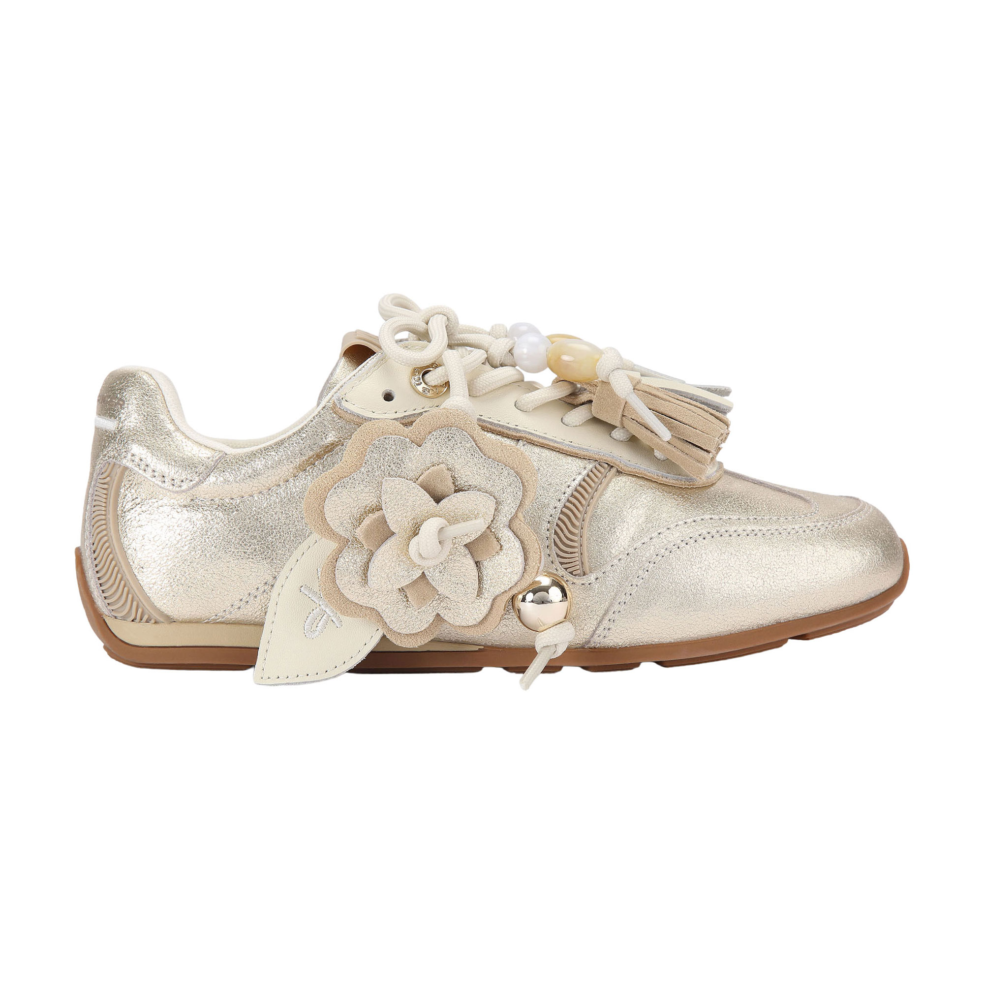 - Sneaker style, metallic upper, tassel lace detailing, 3D leather flower charm with beaded detailing