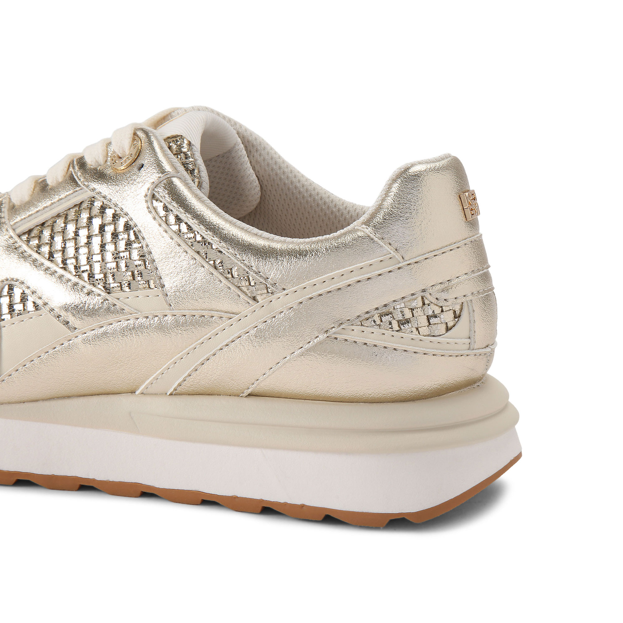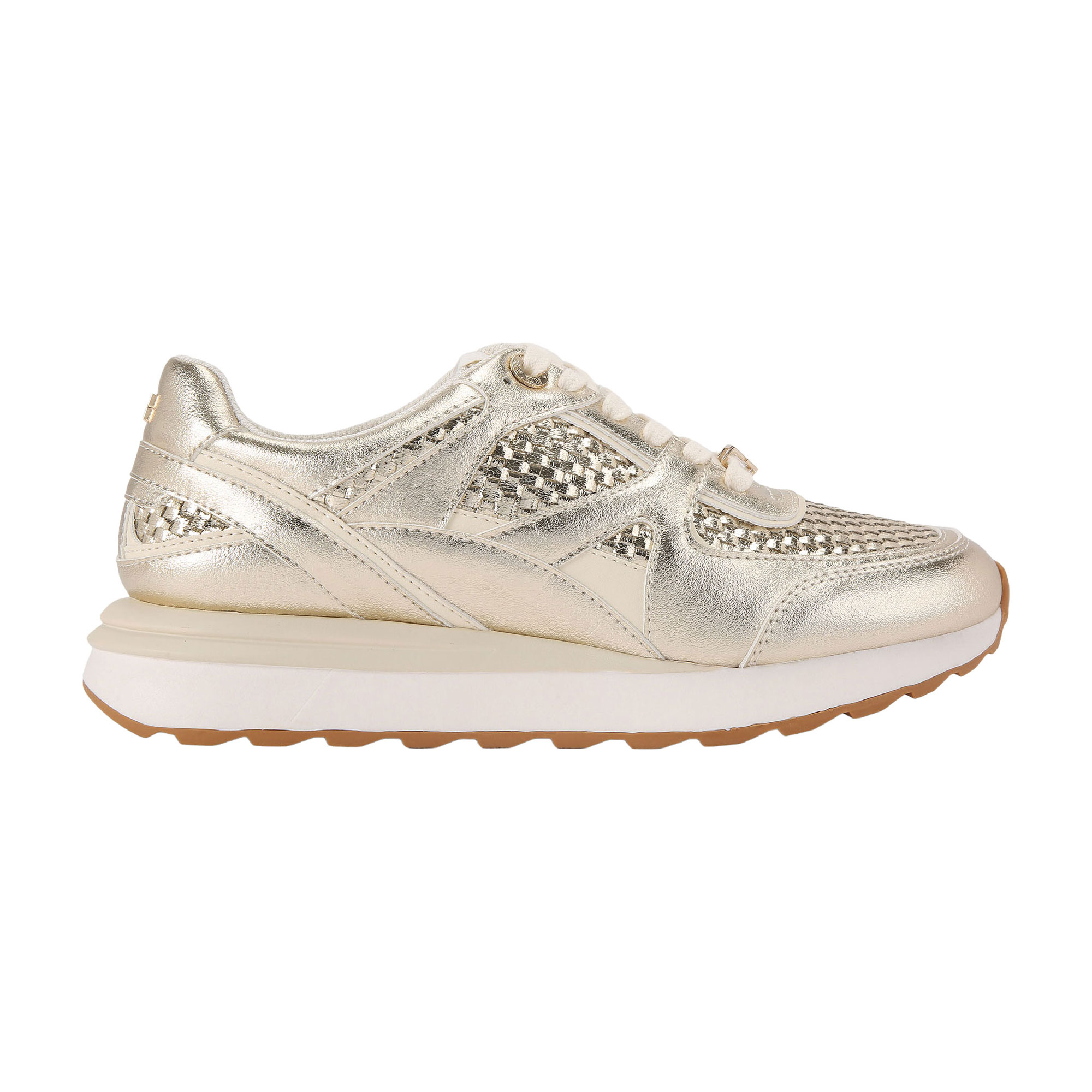 • Metallic woven upper, lace-up front, gold tone logo detail