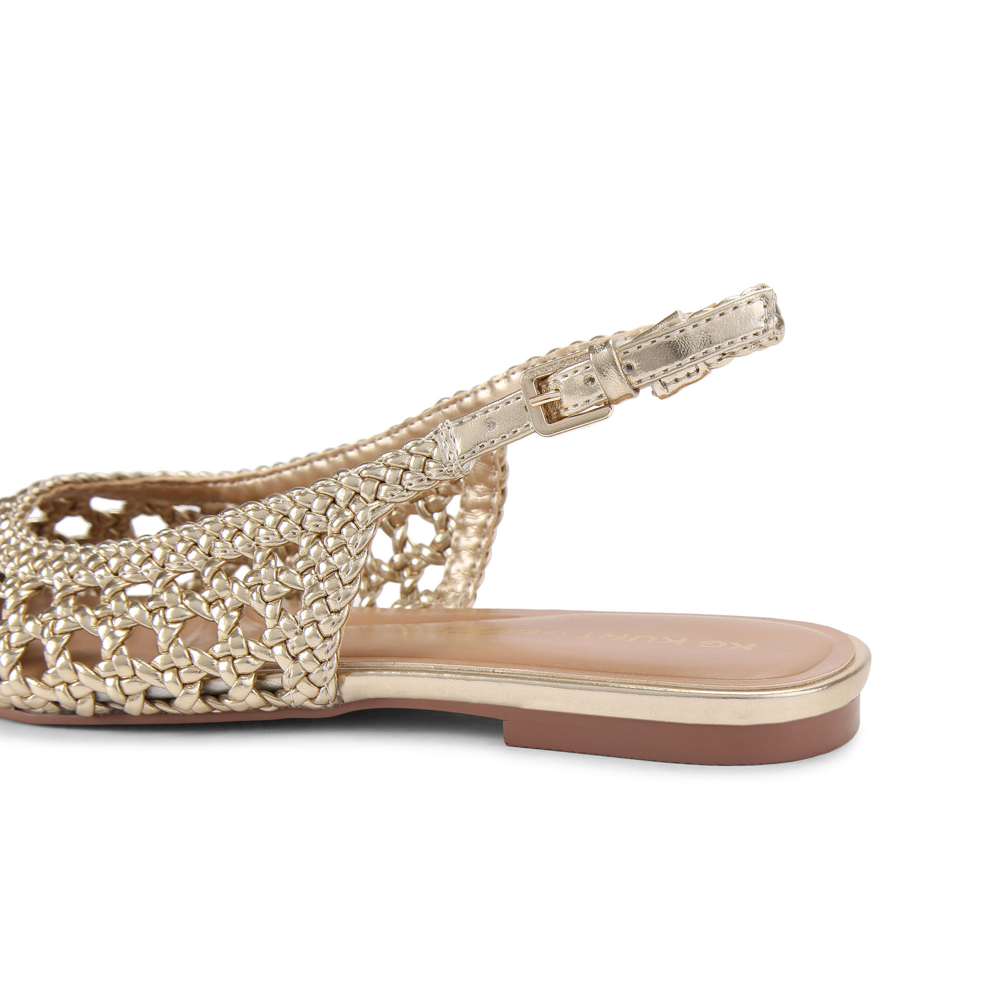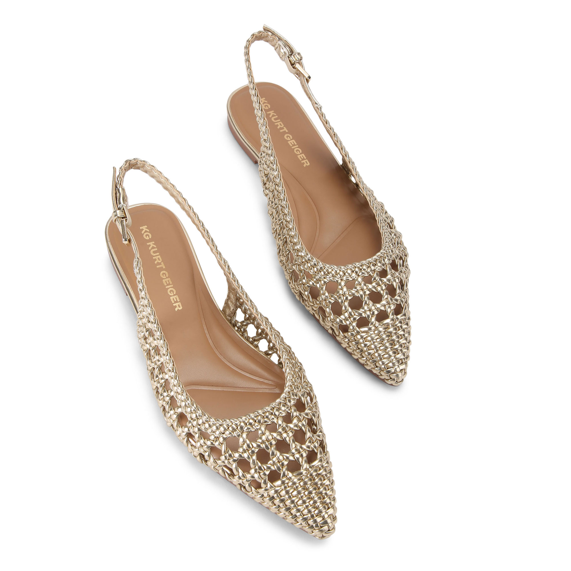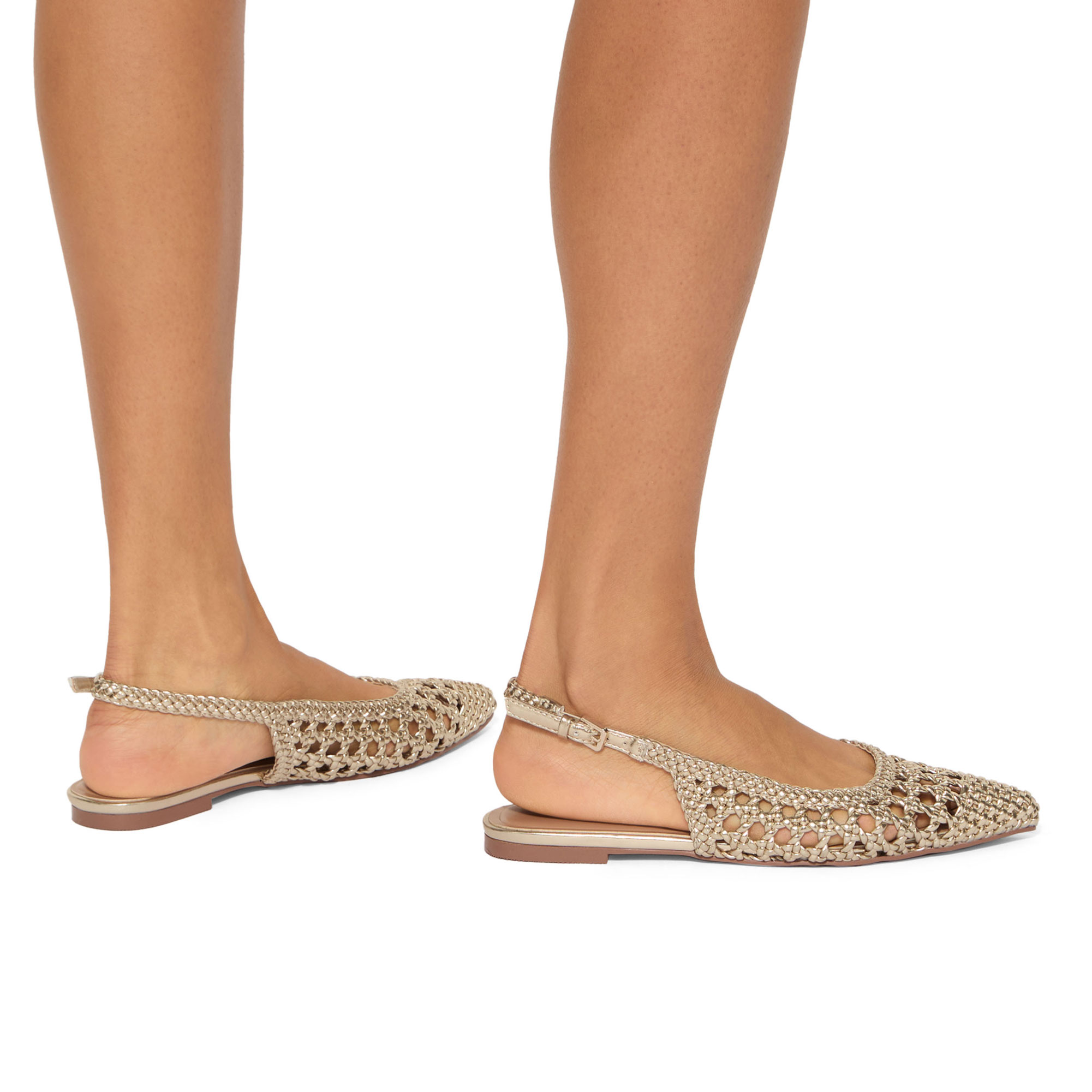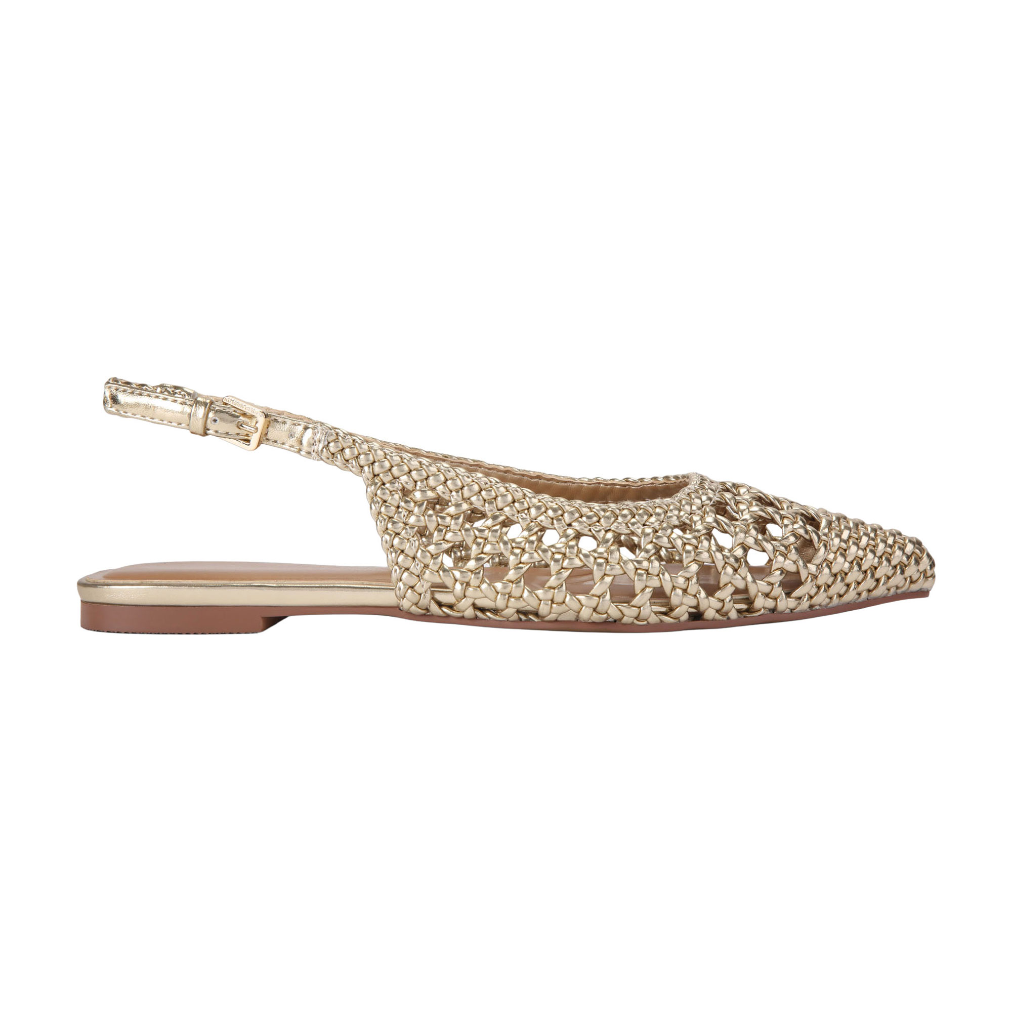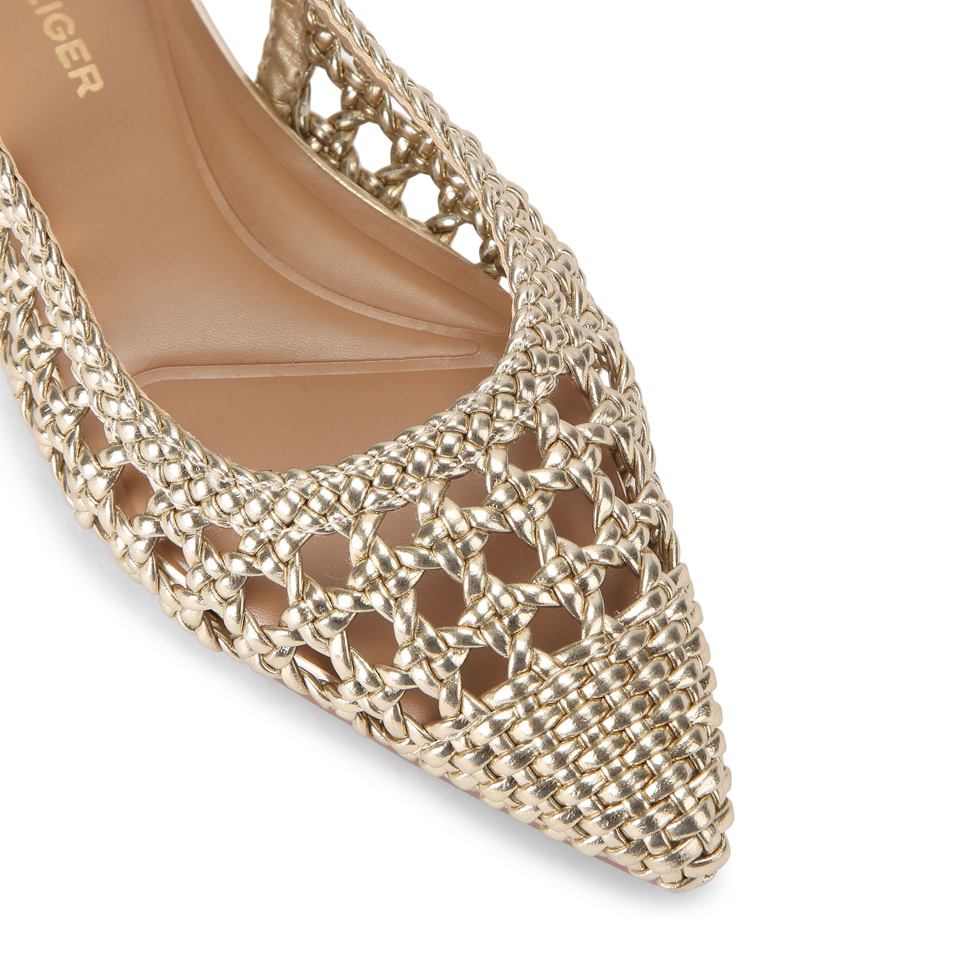 • Braided upper, pointed toe, ankle strap, gold buckle