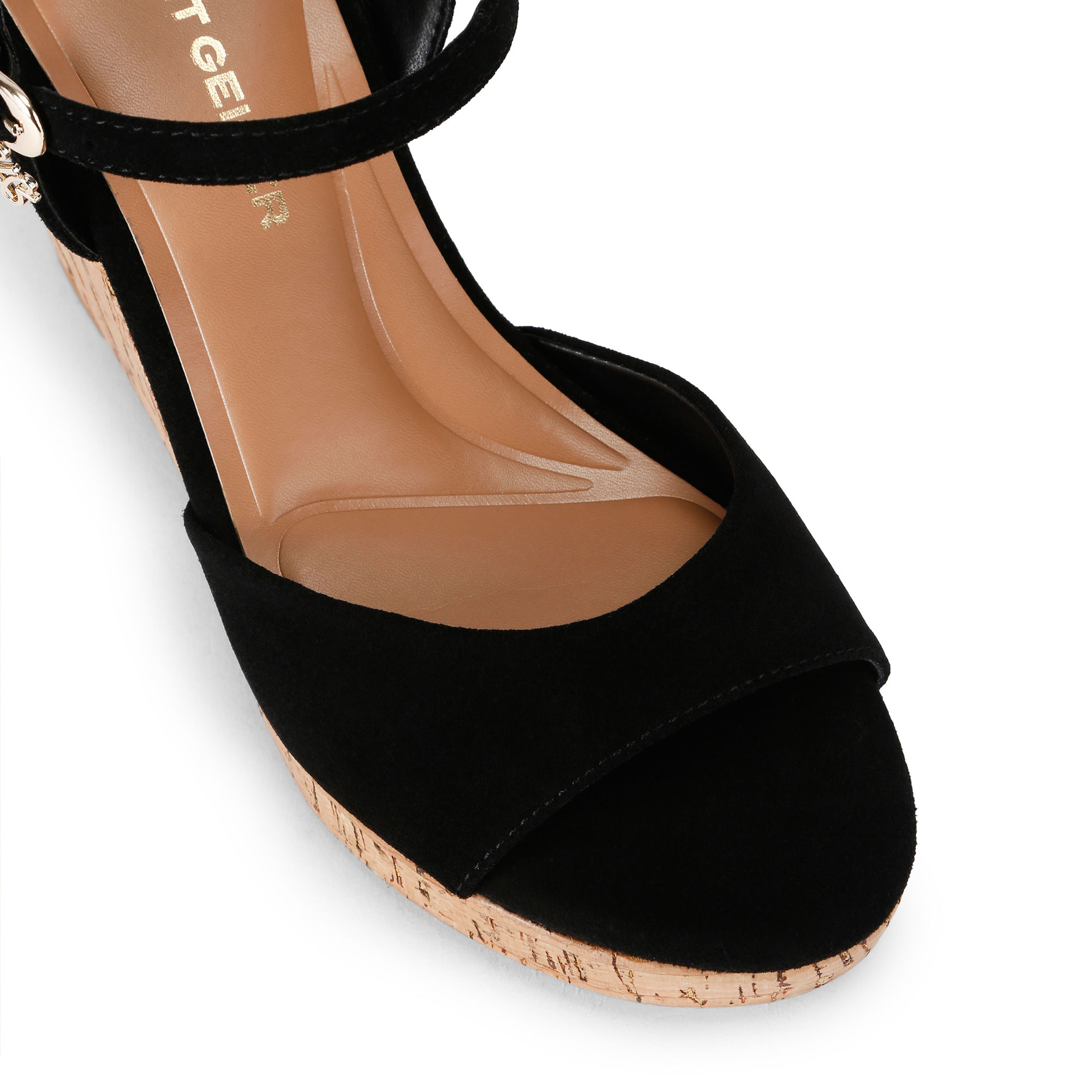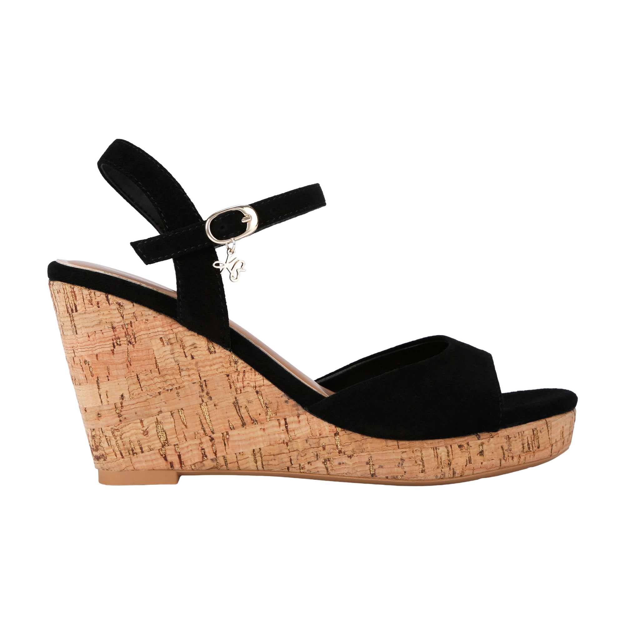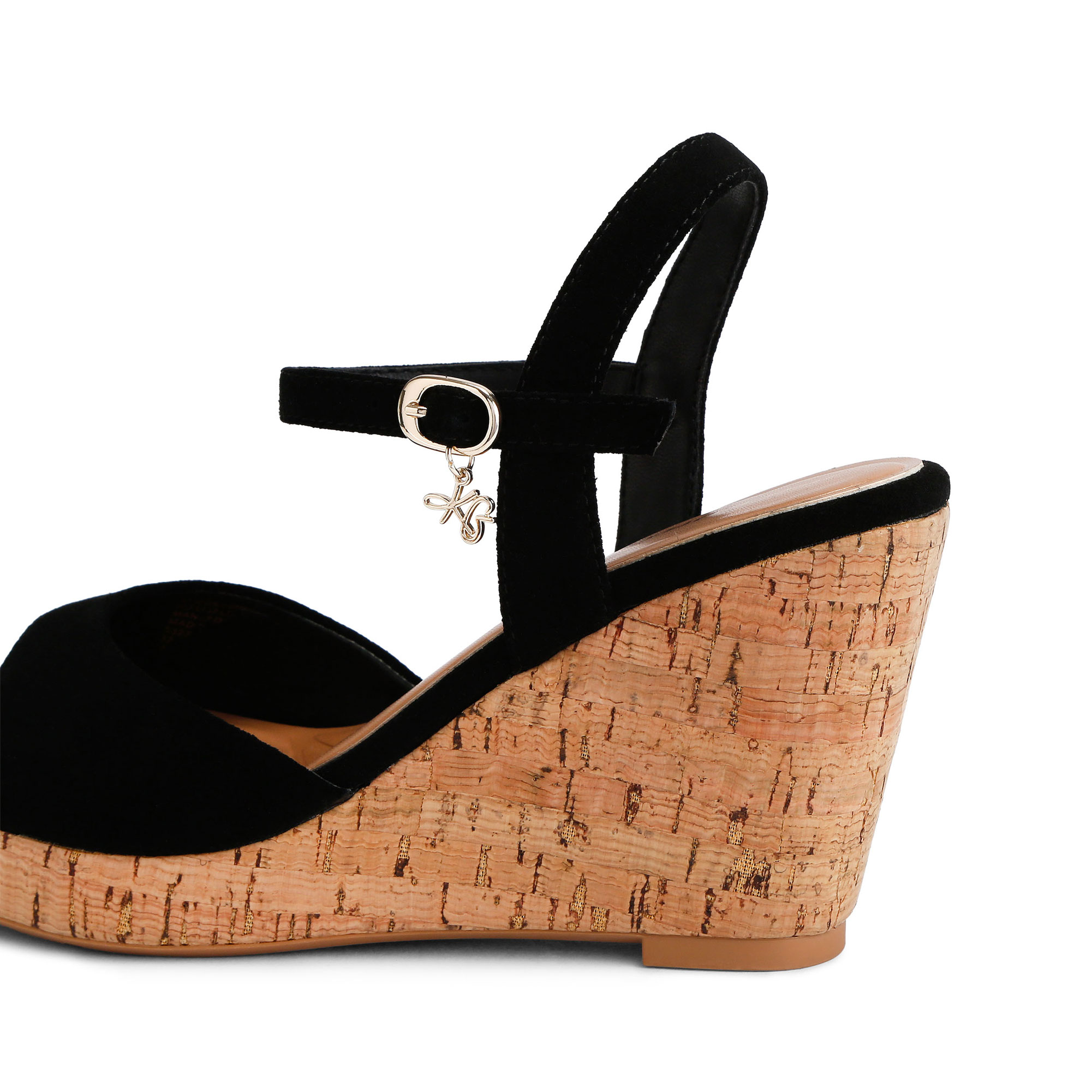 • Open toe, cork style wedge heel with metallic specks
