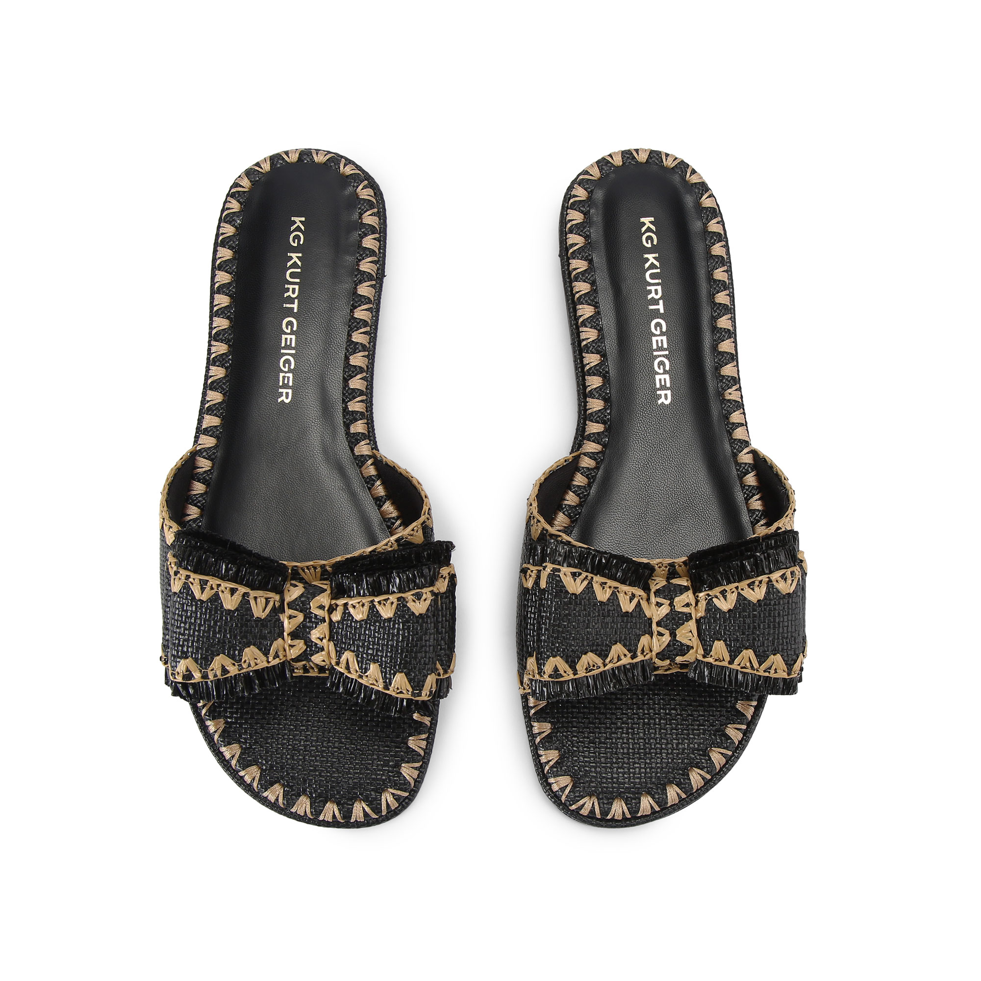 • Raffia, neutral stitching, bow detail on strap, slip on style, two-tone finish