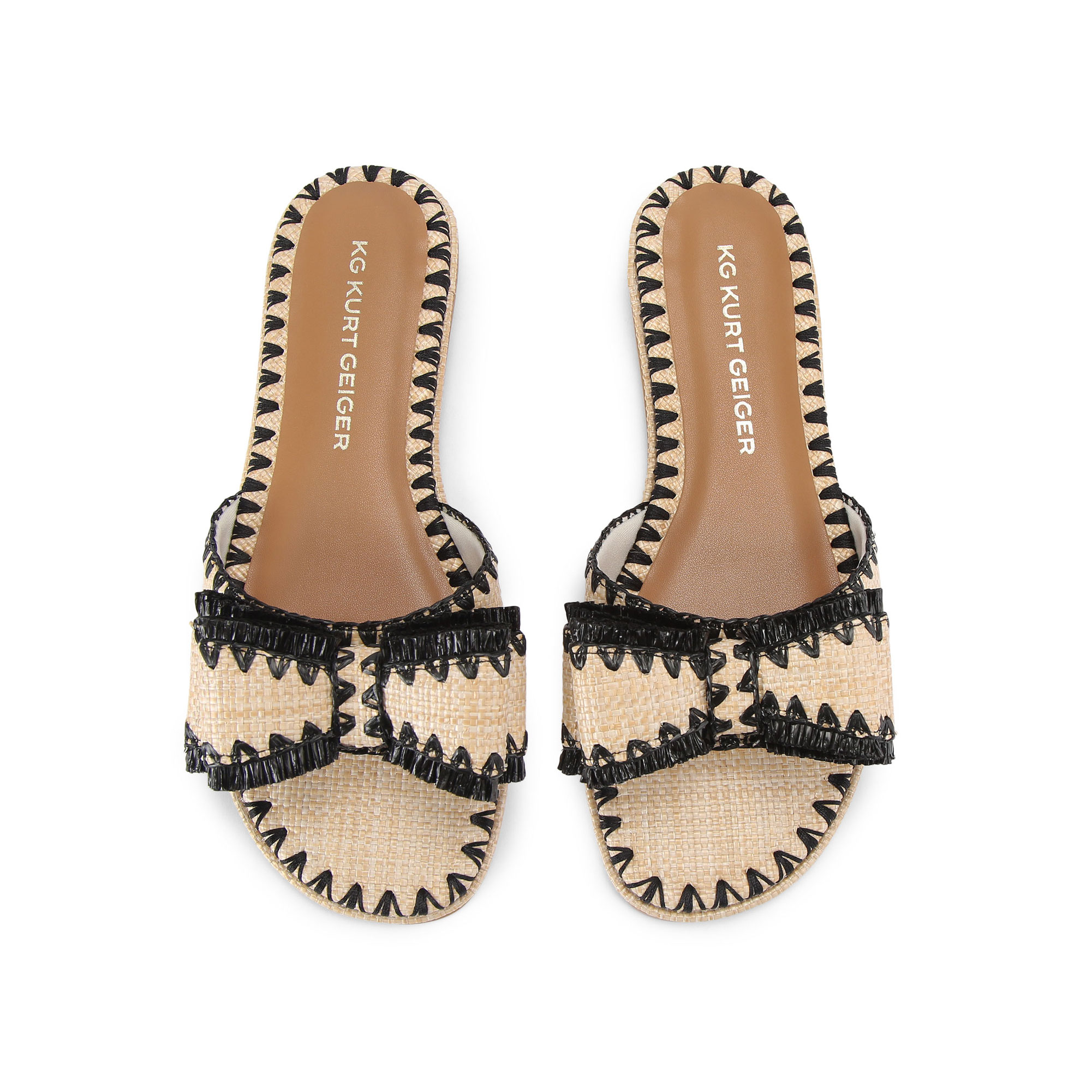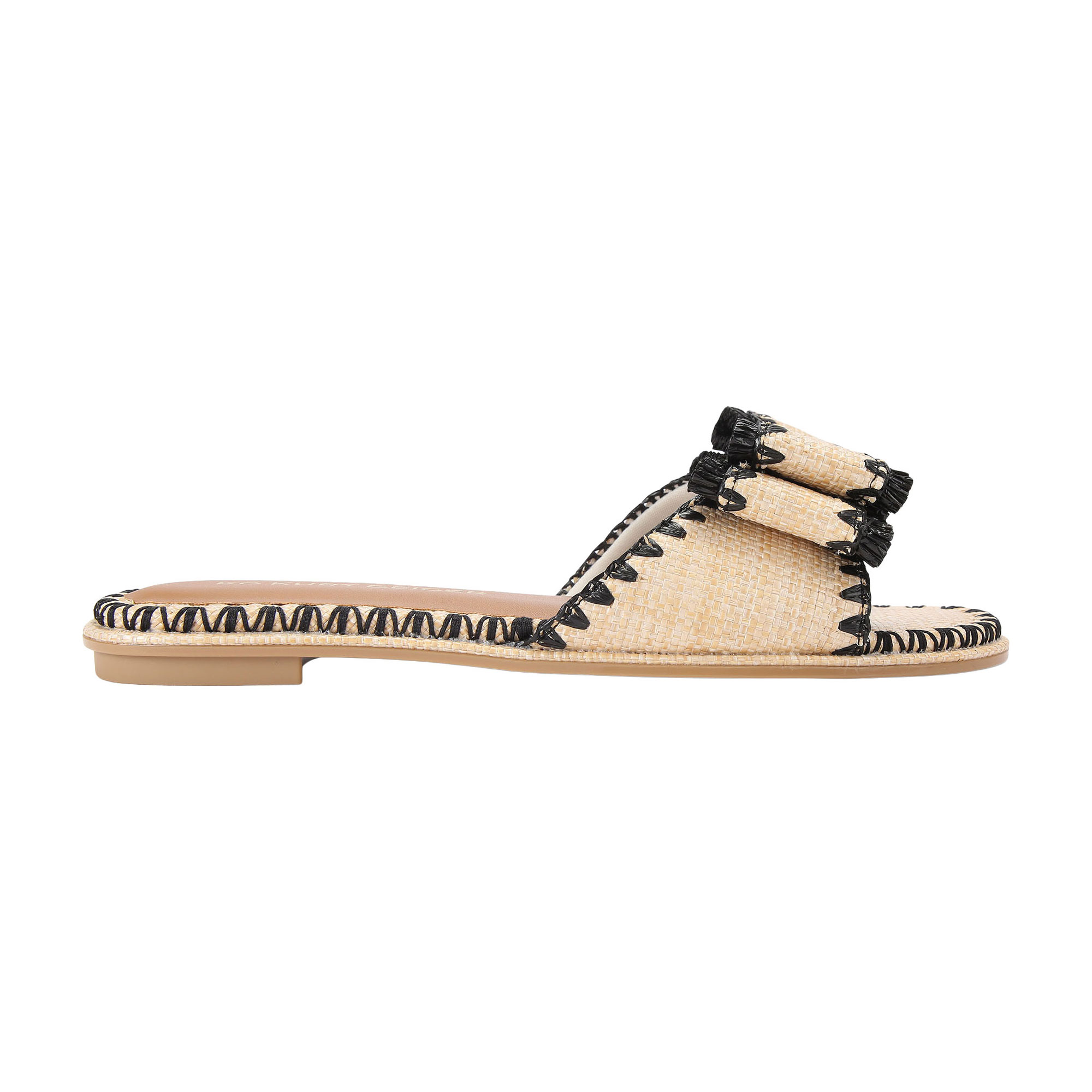 - Raffia, neutral stitching, bow detail on strap, slip on style, two-tone finish