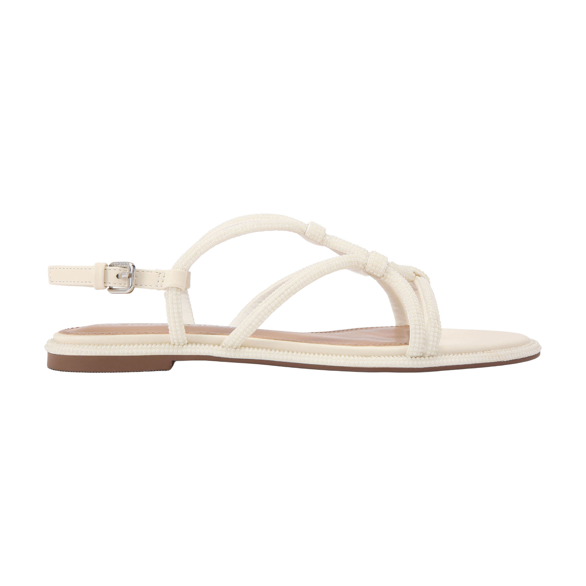 - Faux crystal embellishment across upper straps, logo buckle on ankle strap