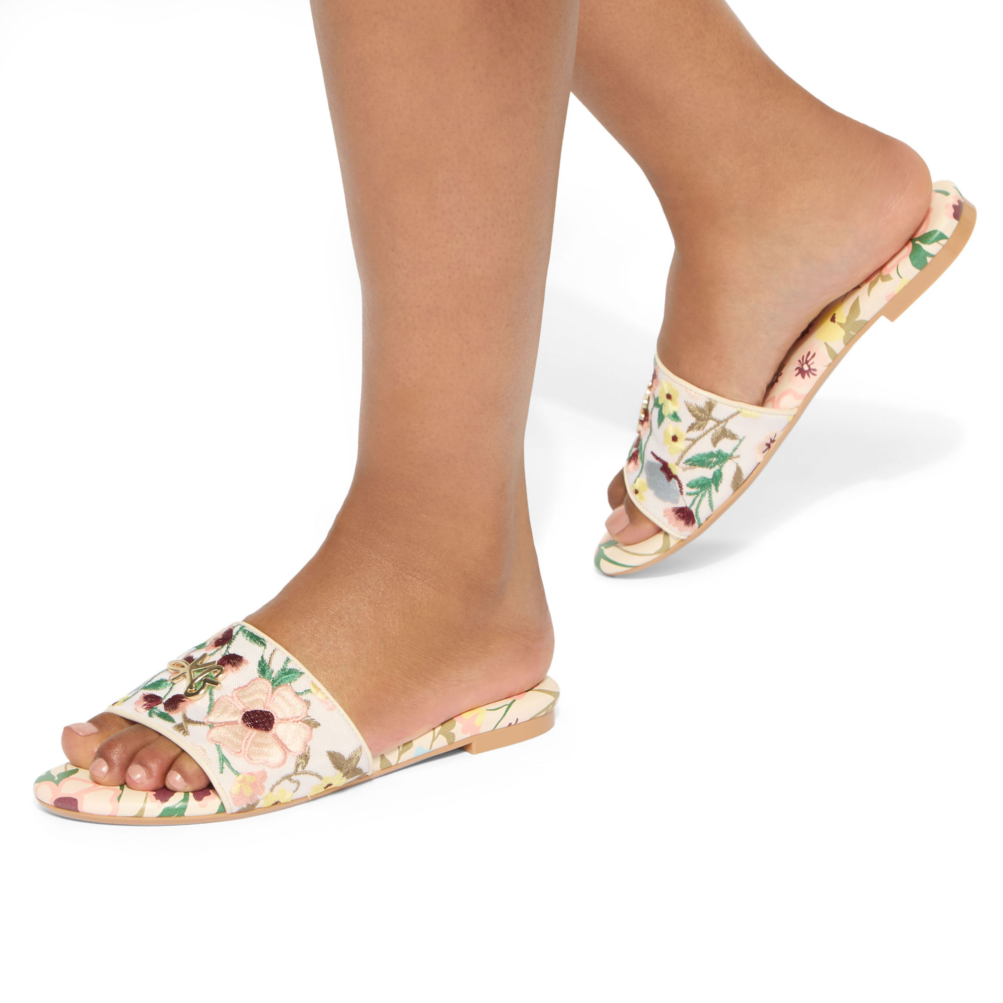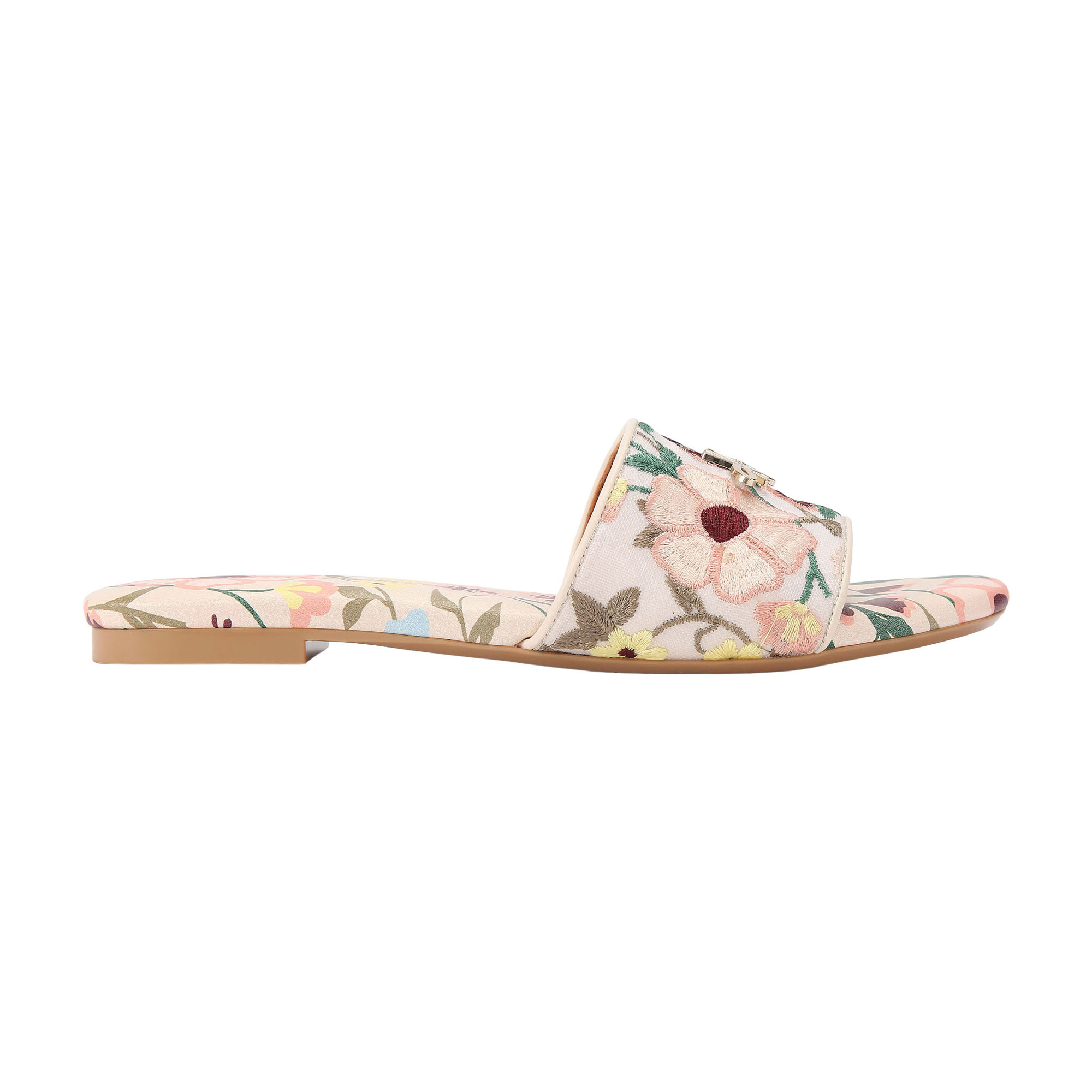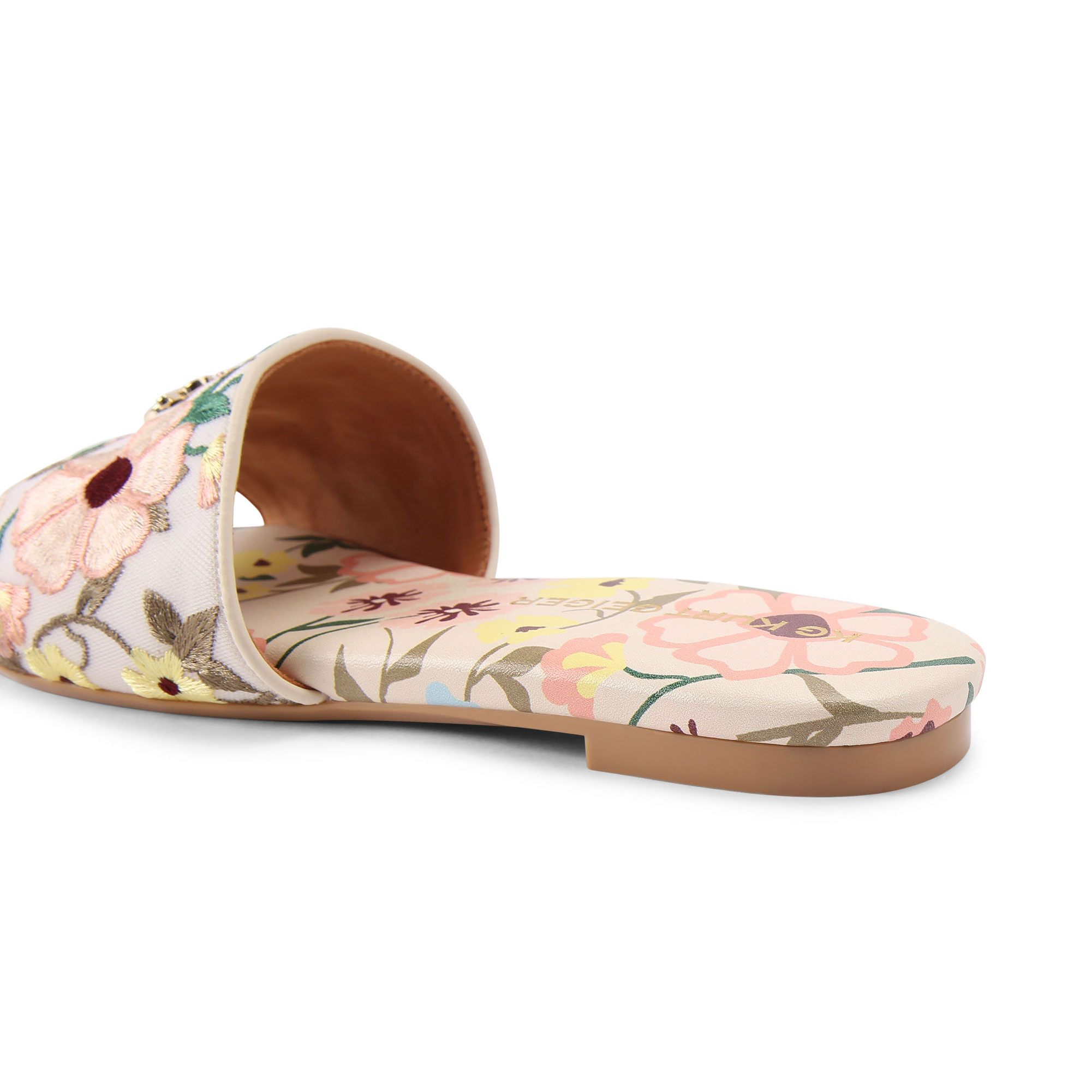 - Fabric construction, embroidered floral design, upper strap, flat sole