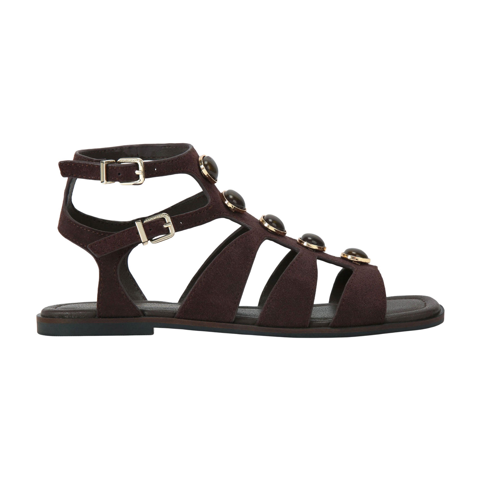 - Gladiator style, five stone studs down the centre, ankle straps fastened with silver buckles