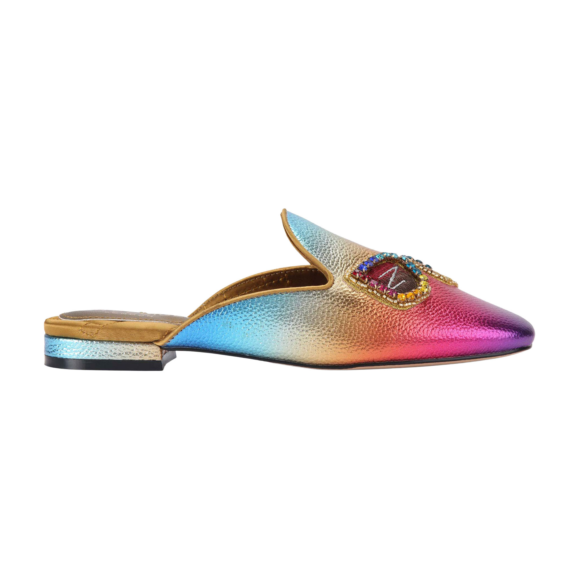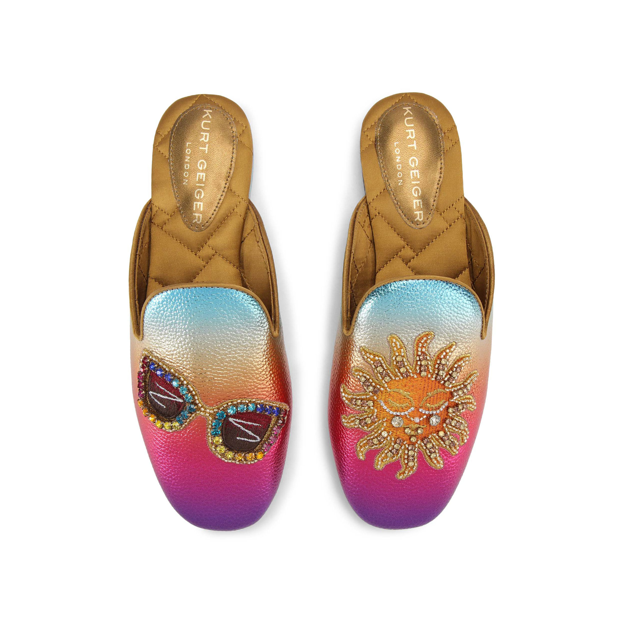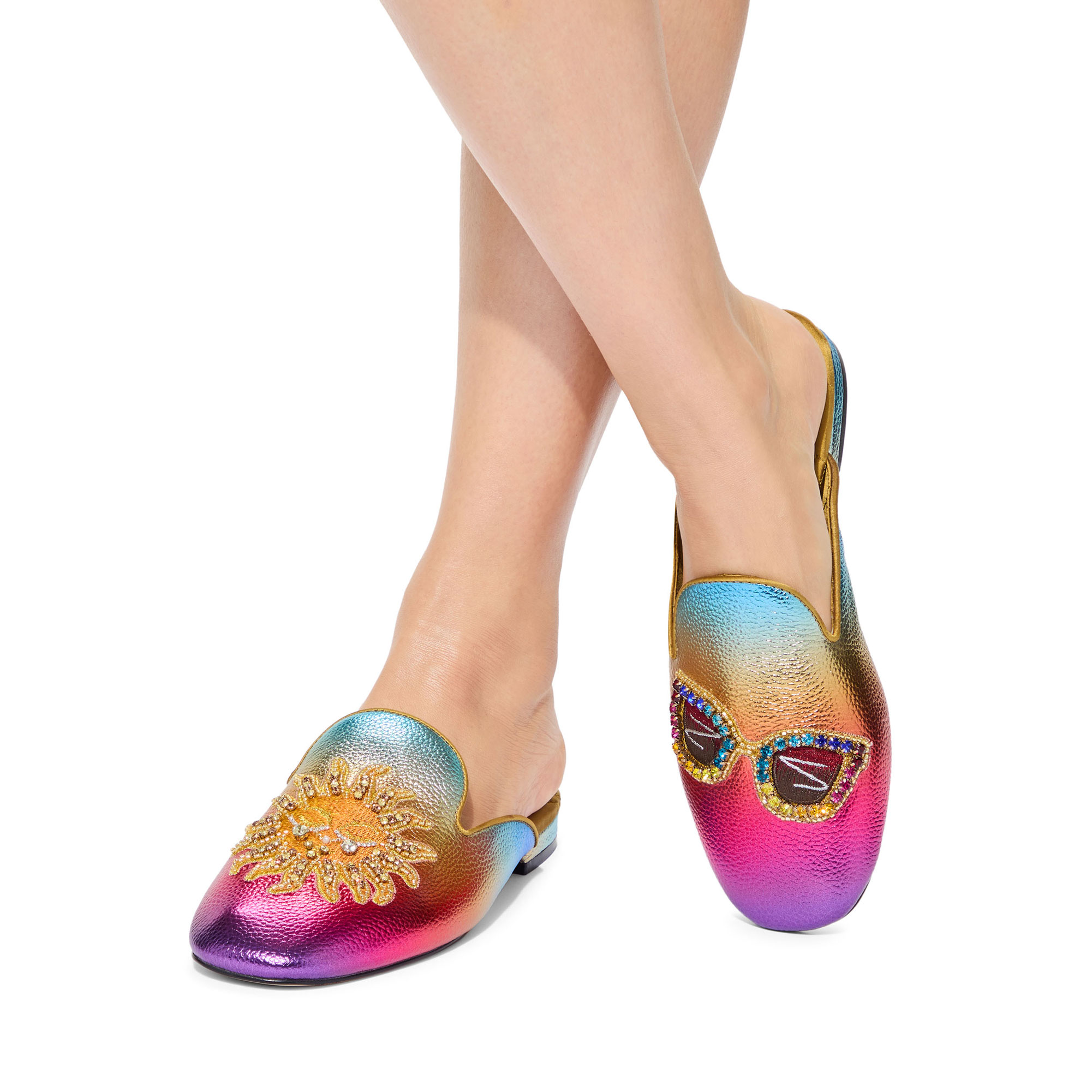 • Ombré metallic pebble grain leather, embellished sunglasses on the toe of one shoe and an embellished sun on the other