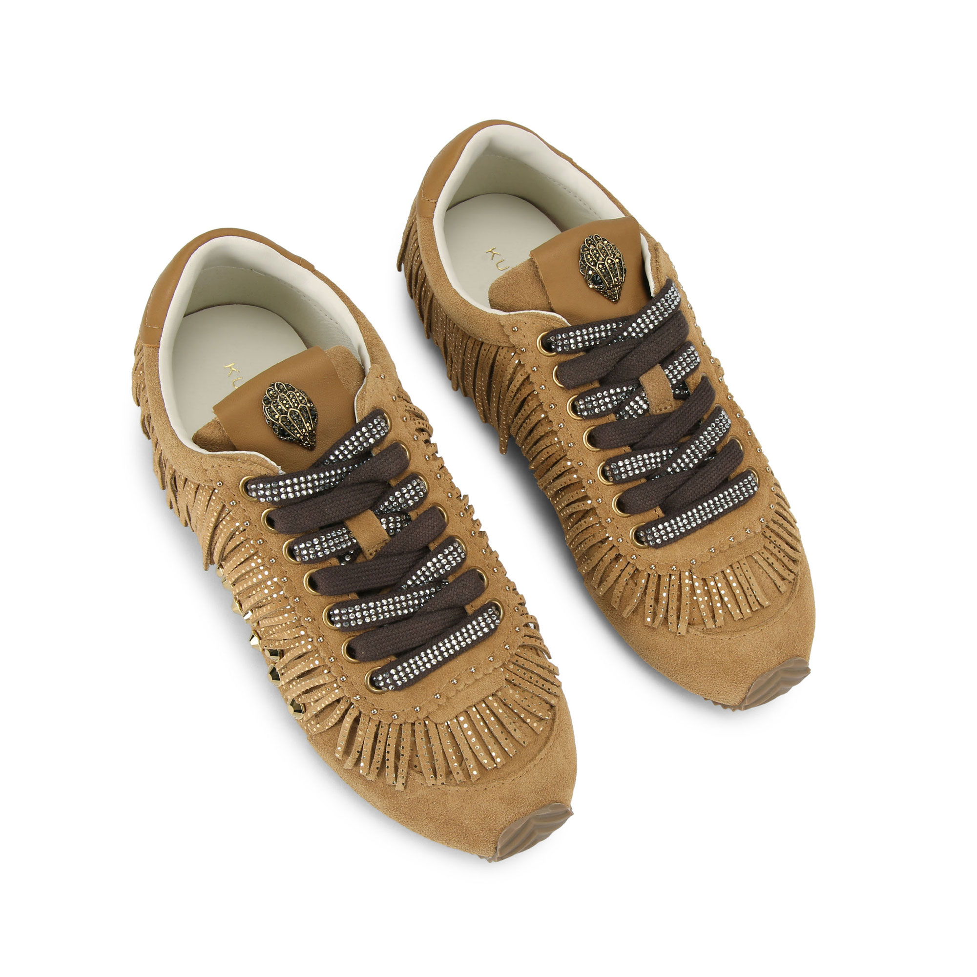 - Fringe detail, crystal embellished laces, antiqued brass eagle head on the tongue