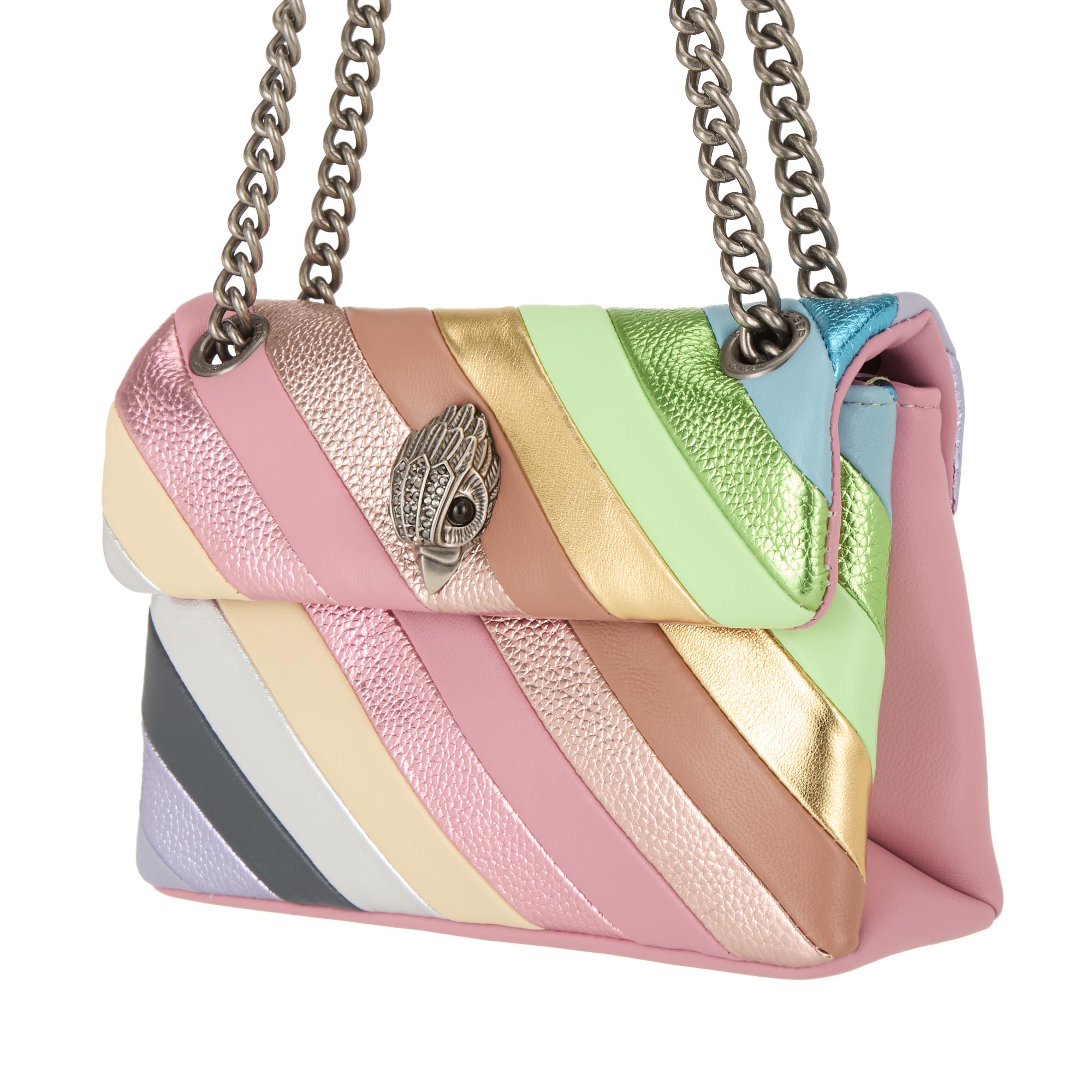 - Diagonal stripe design, chain strap, magnetic flap closure, signature eagle head embellishment, rear logo branding, metallic rainbow design, grained finish