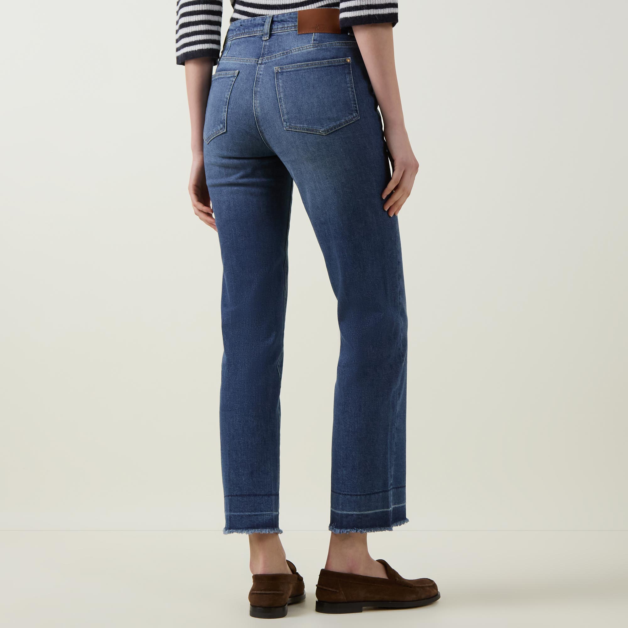 - Mid rise, straight leg, cropped length, belt loops, concealed fly and button fastening, two front flap pockets with button fastenings, two rear patch pockets, frayed hems, tonal stripe detailing, logo patch, pressed creases, mid wash finish