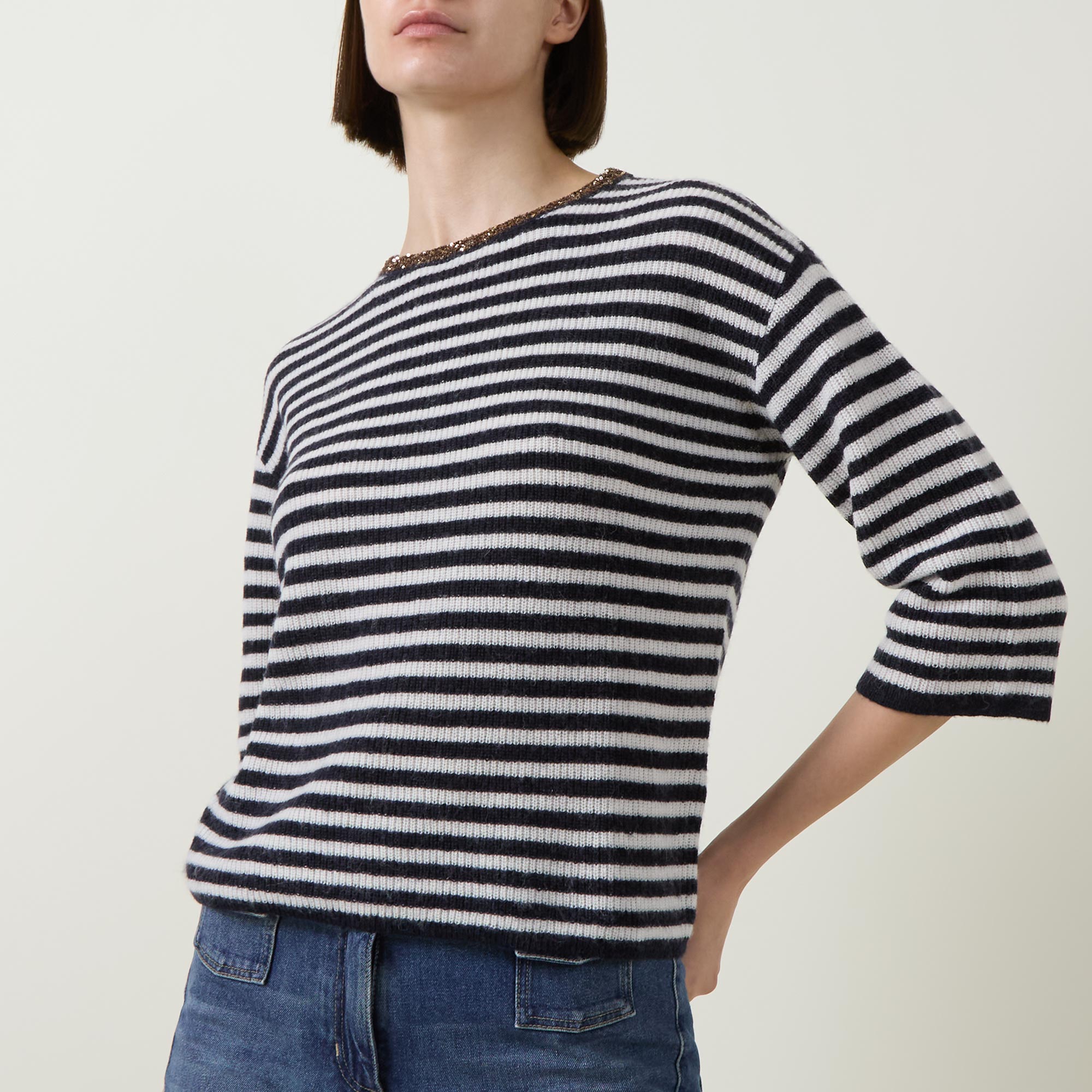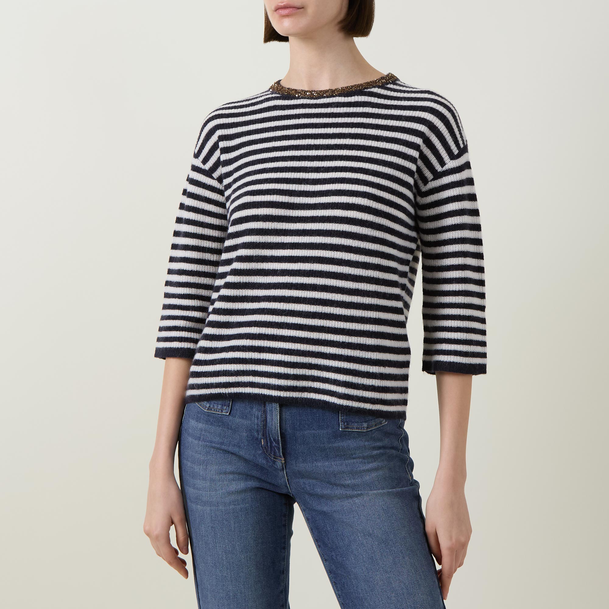 • Crew neckline, embellished detailing, dropped shoulders, half length sleeves, straight hem, ribbed design, striped pattern, knit construction