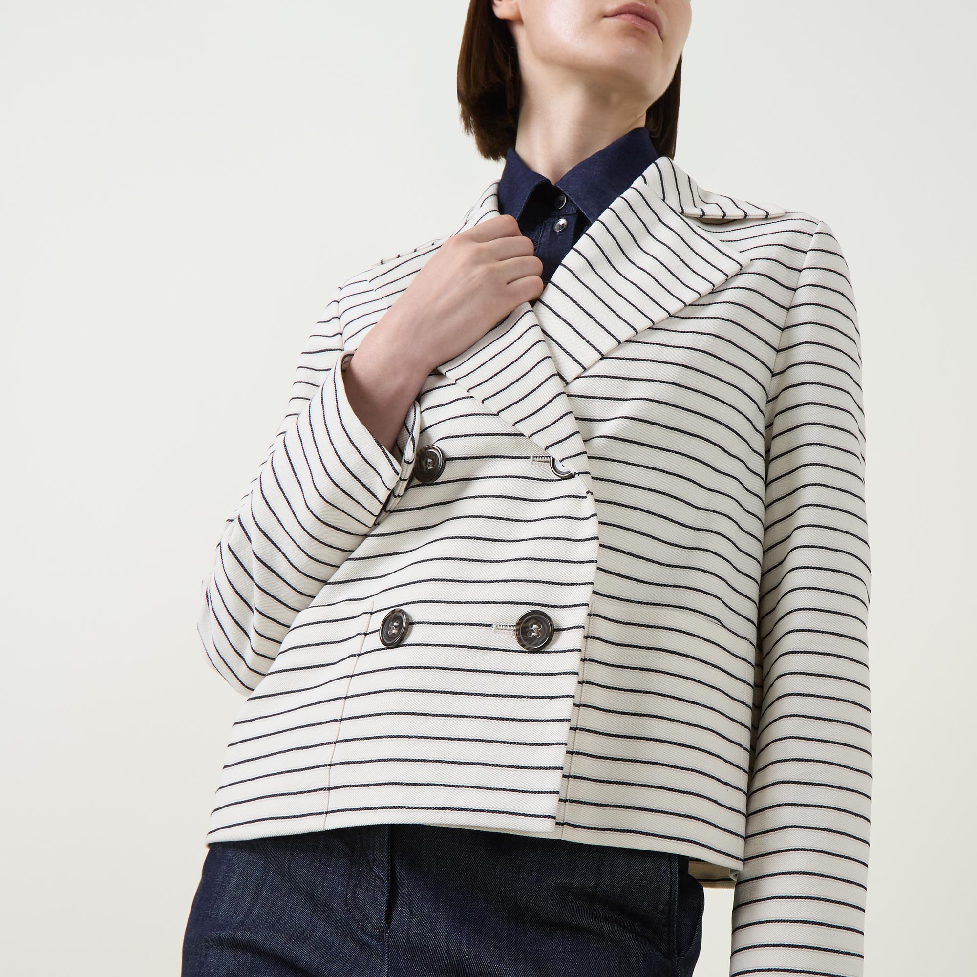 - Double breasted design, notch lapel collar, long sleeves, split cuffs, front button fastening, straight hem, cropped length, striped pattern