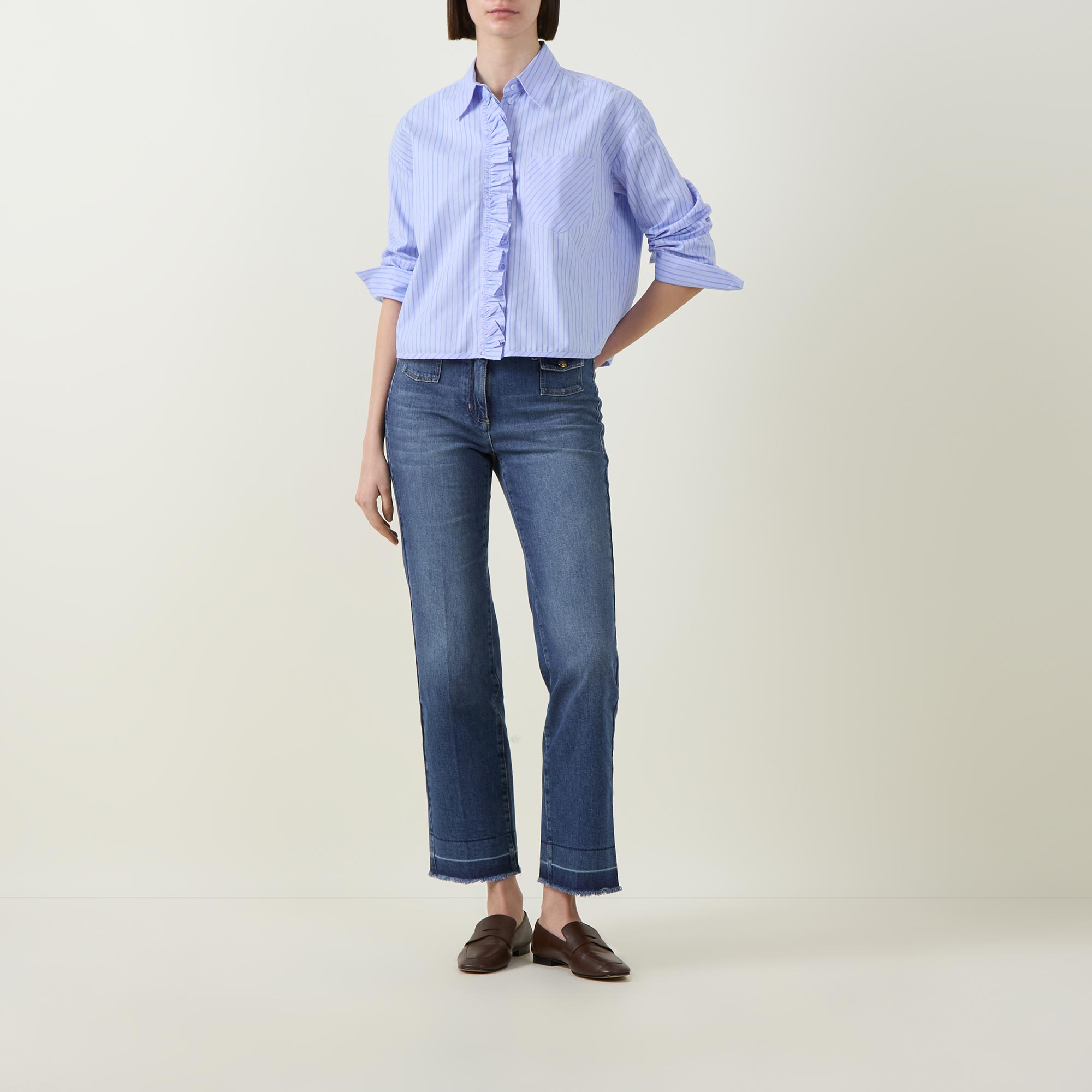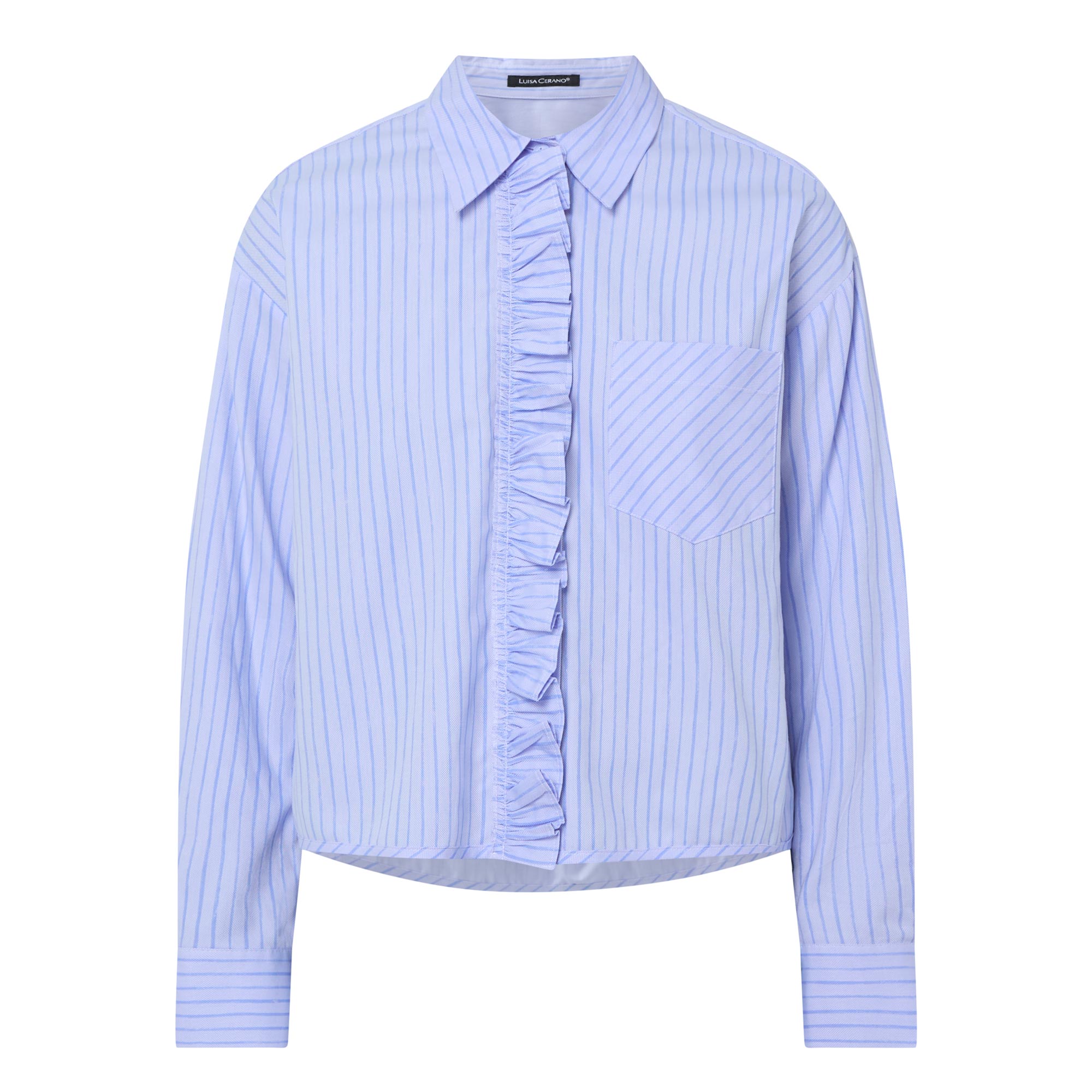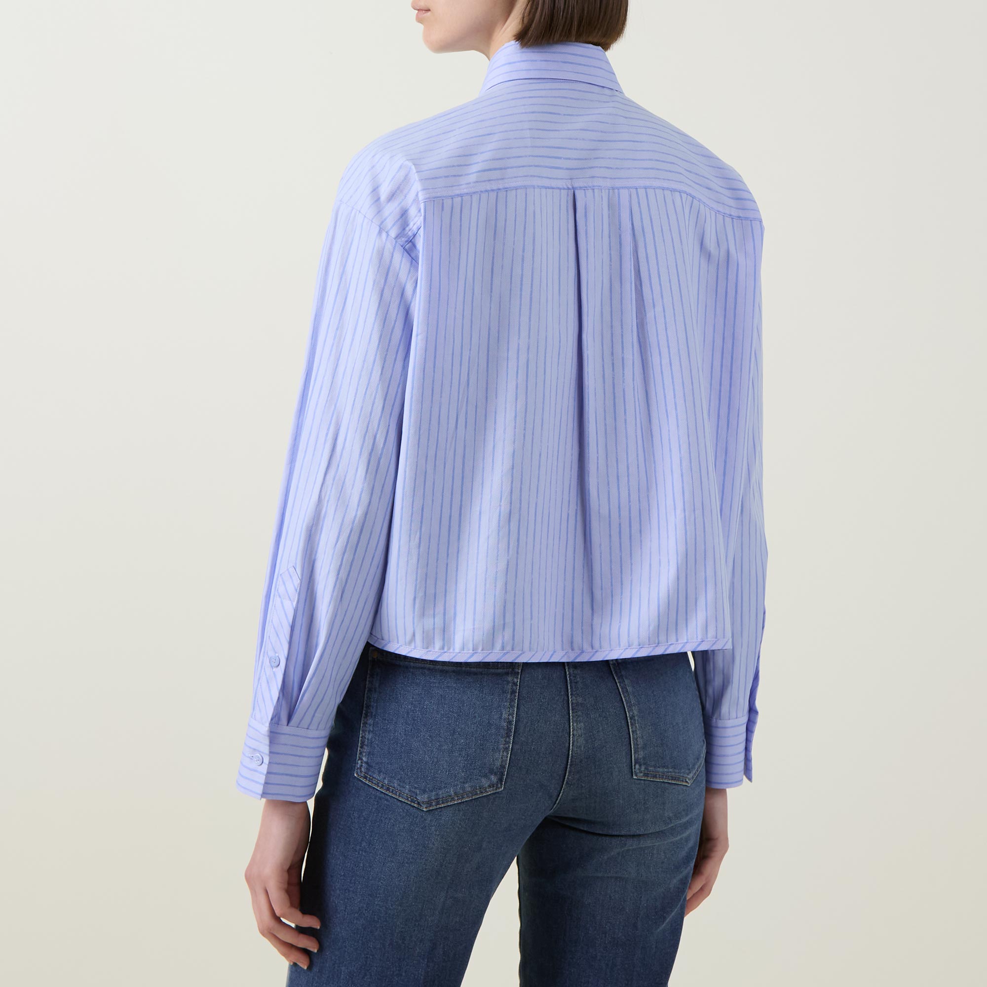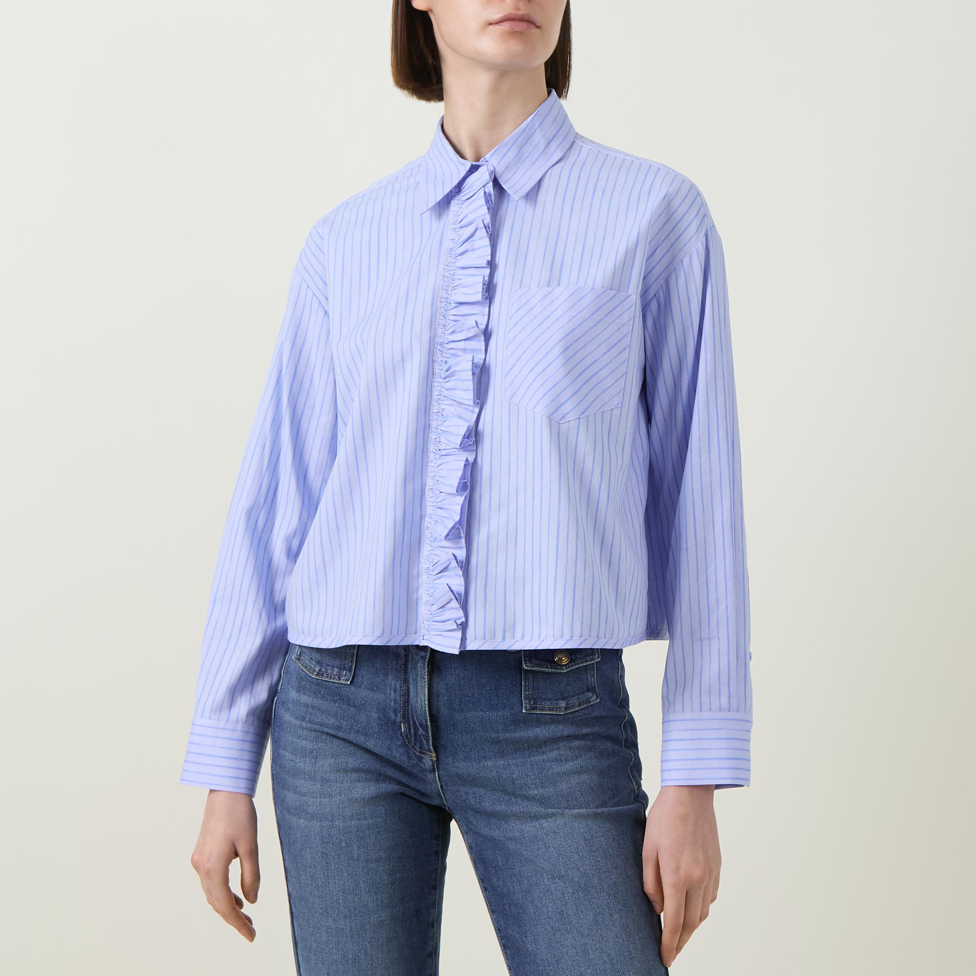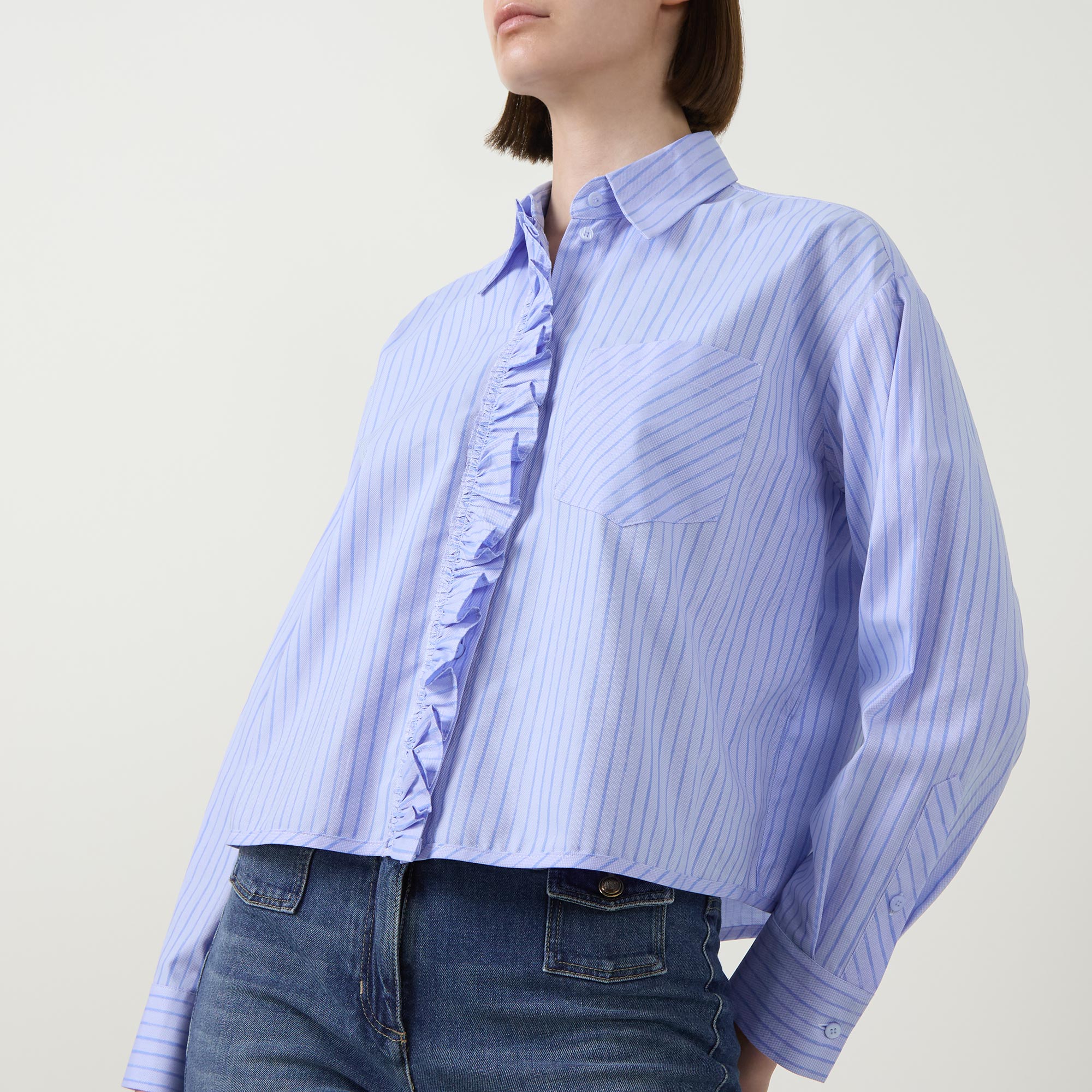 - Point collar, dropped shoulders, long pleated sleeves, buttoned cuffs, concealed front button fastening, ruffle detailing along the placket, one chest patch pocket, straight hem, rear box pleat, cropped length, tonal stitching, tonal striped pattern