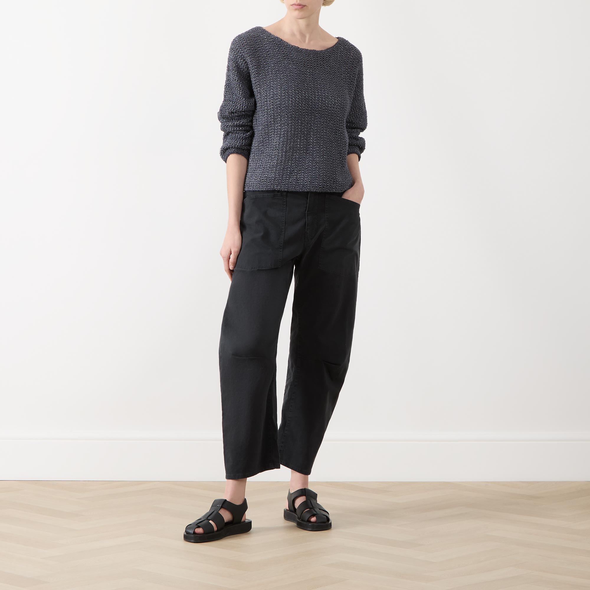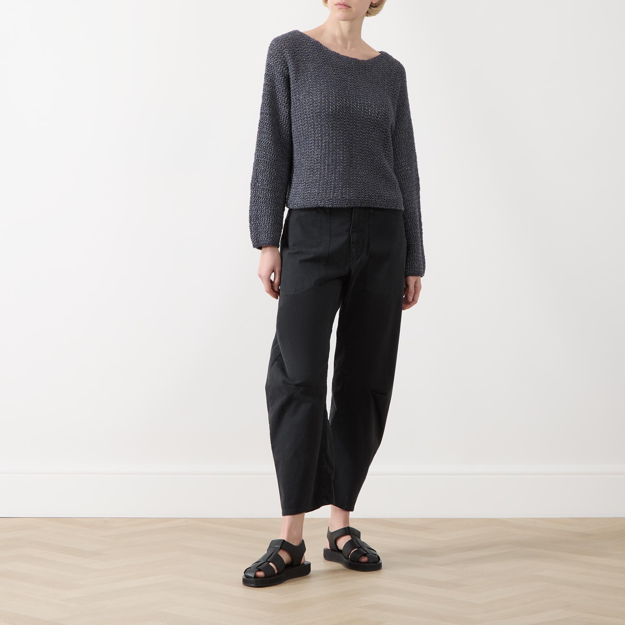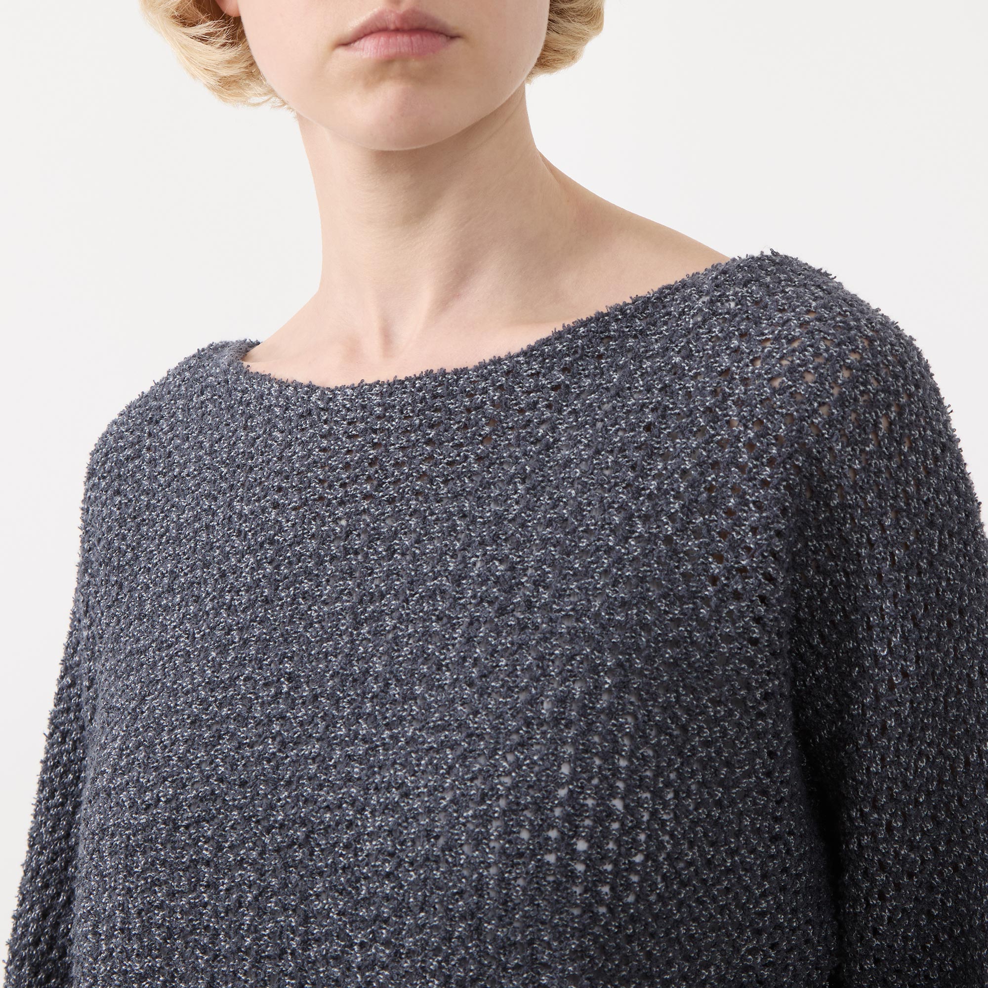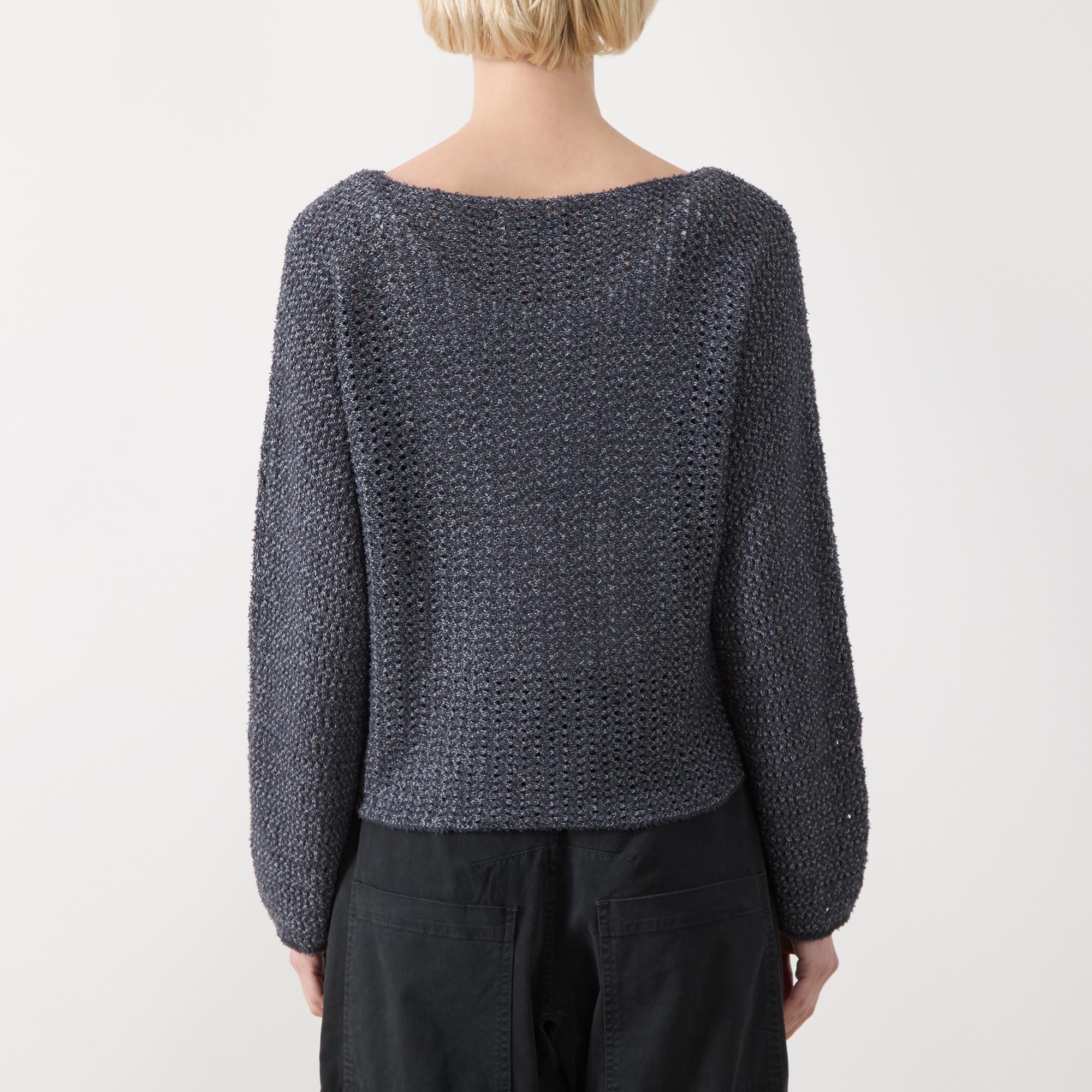 - Boat neckline, long sleeves, straight hemline, crochet knit, seamless finish