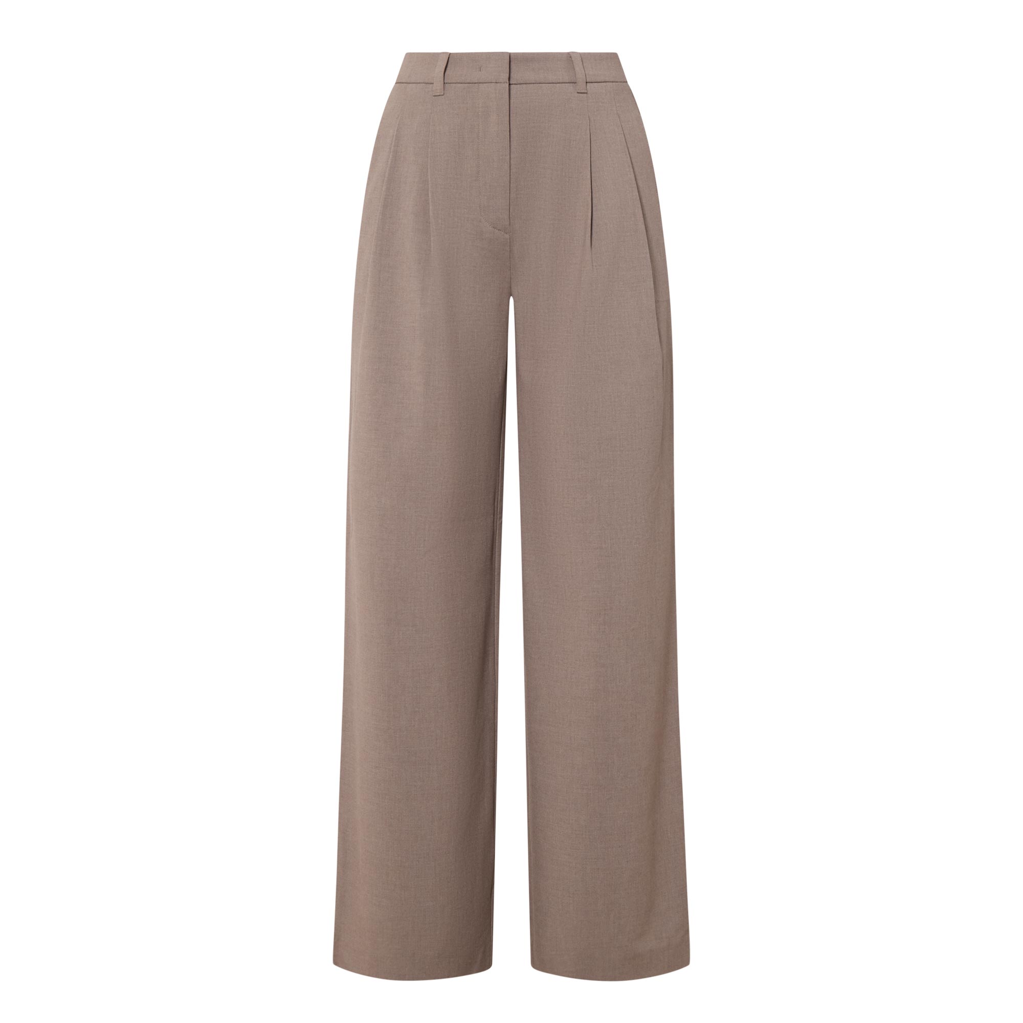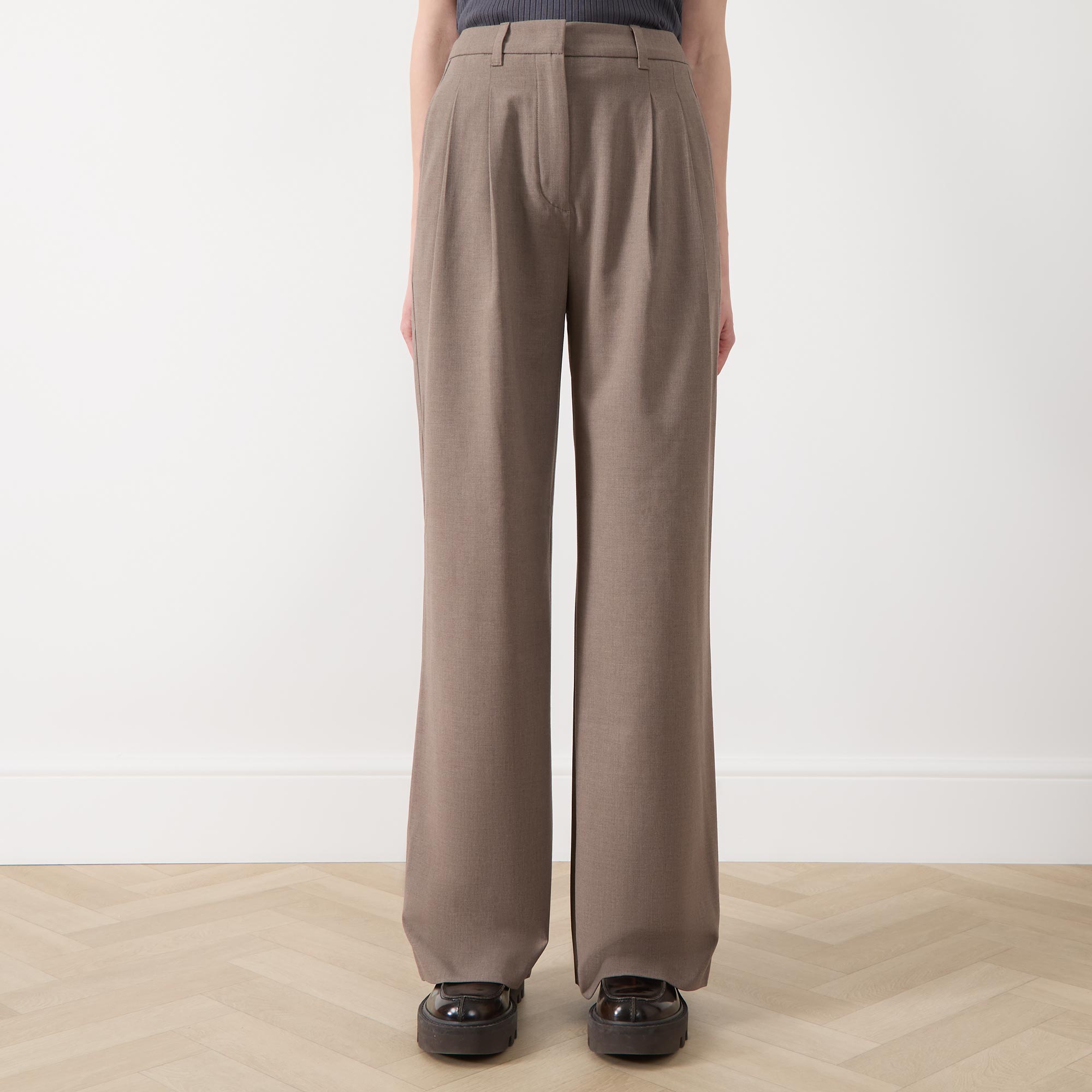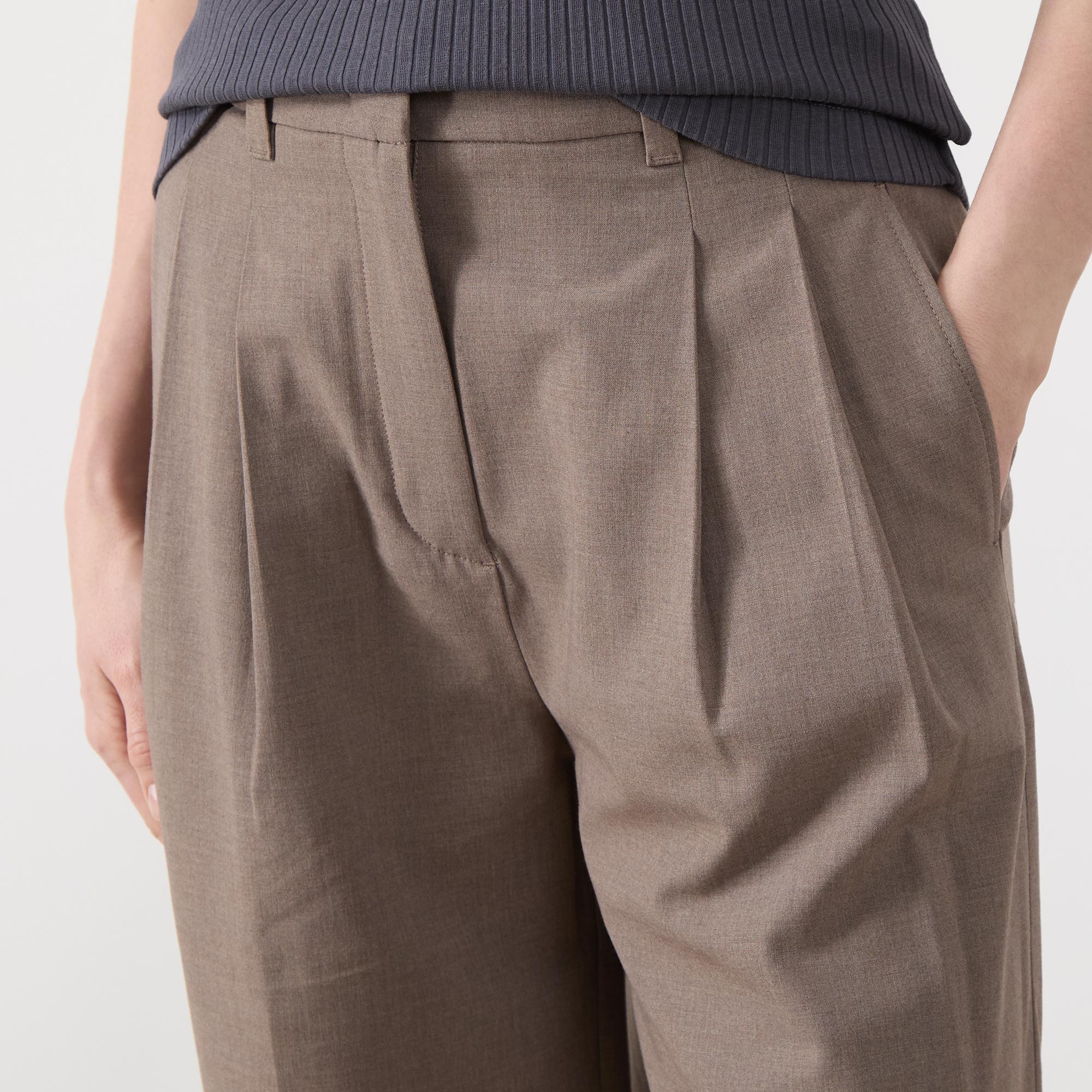• Hook and eye with fly zip fastening, side entry pockets, rear jet pockets, pleated details, wide-cut legs
