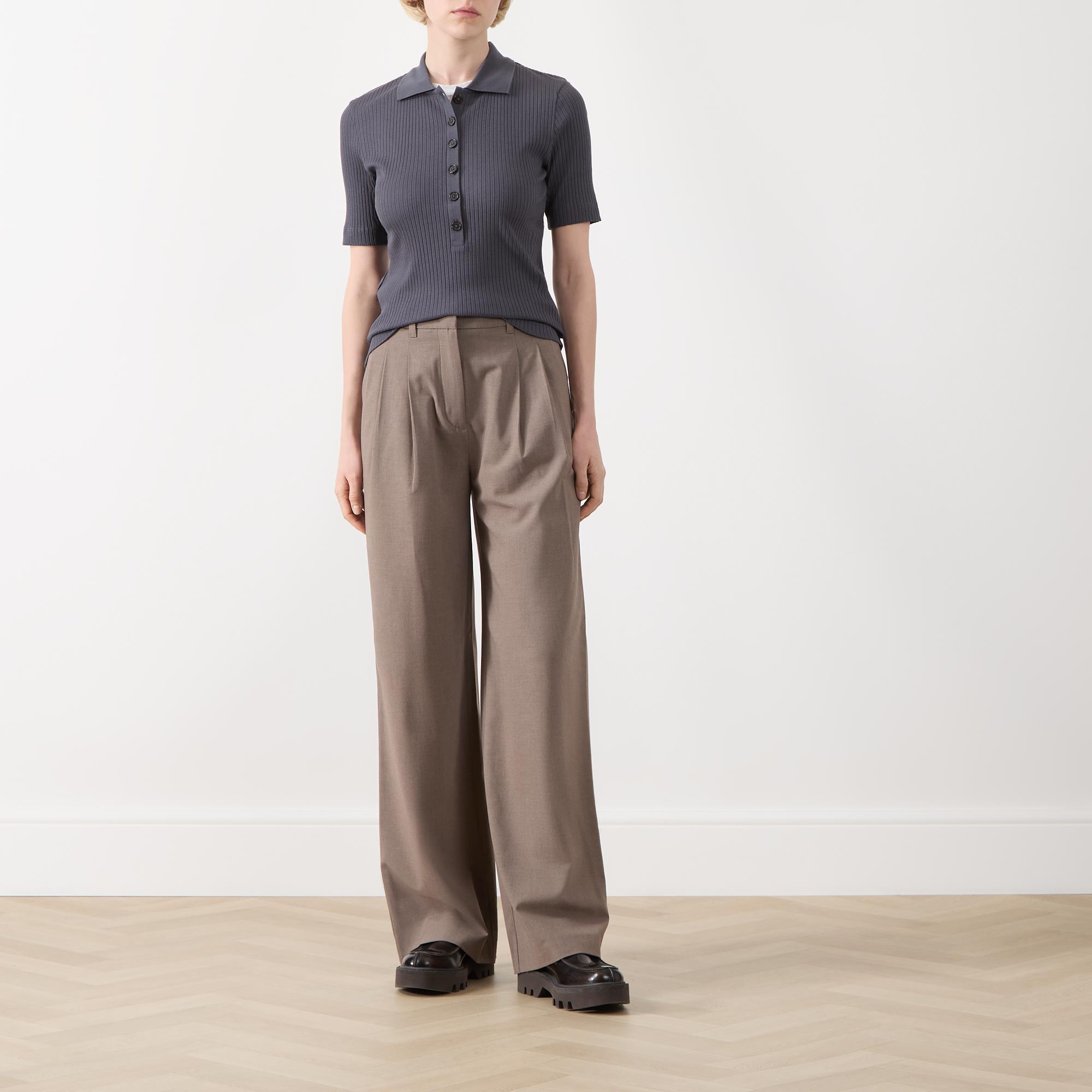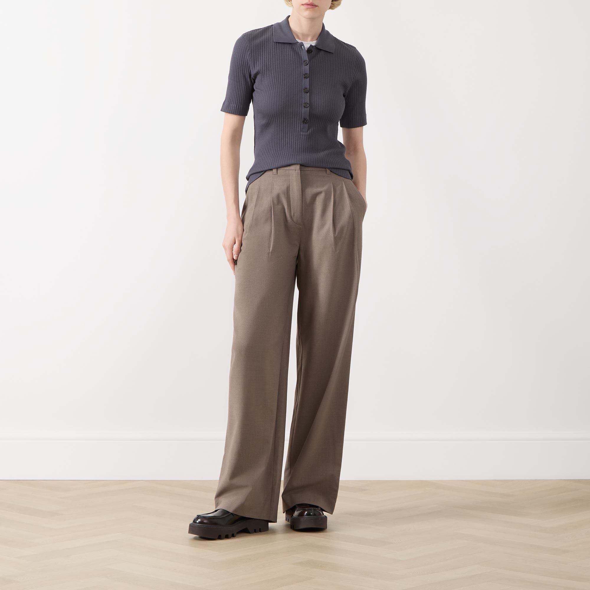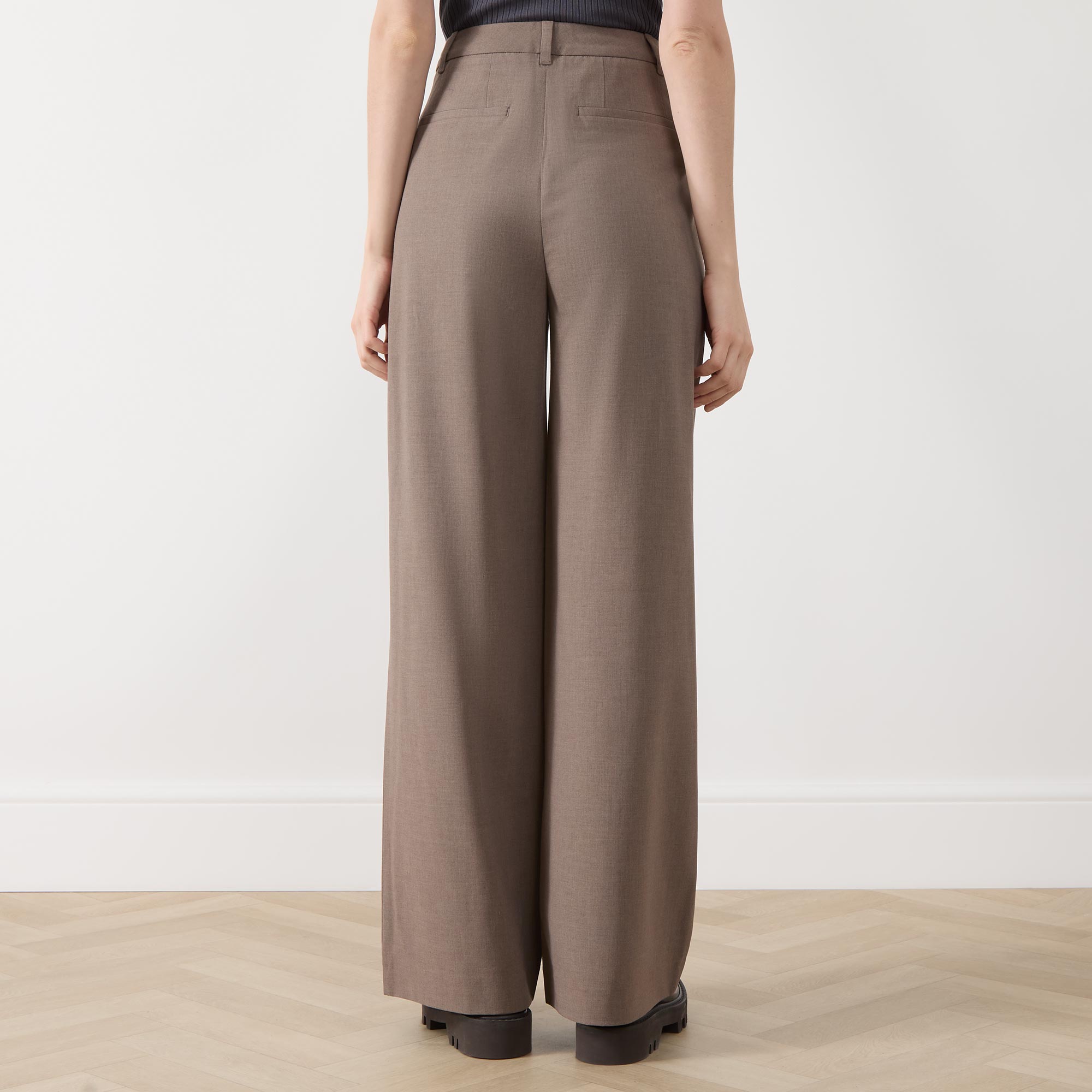 • Hook and eye with fly zip fastening, side entry pockets, rear jet pockets, pleated details, wide-cut legs