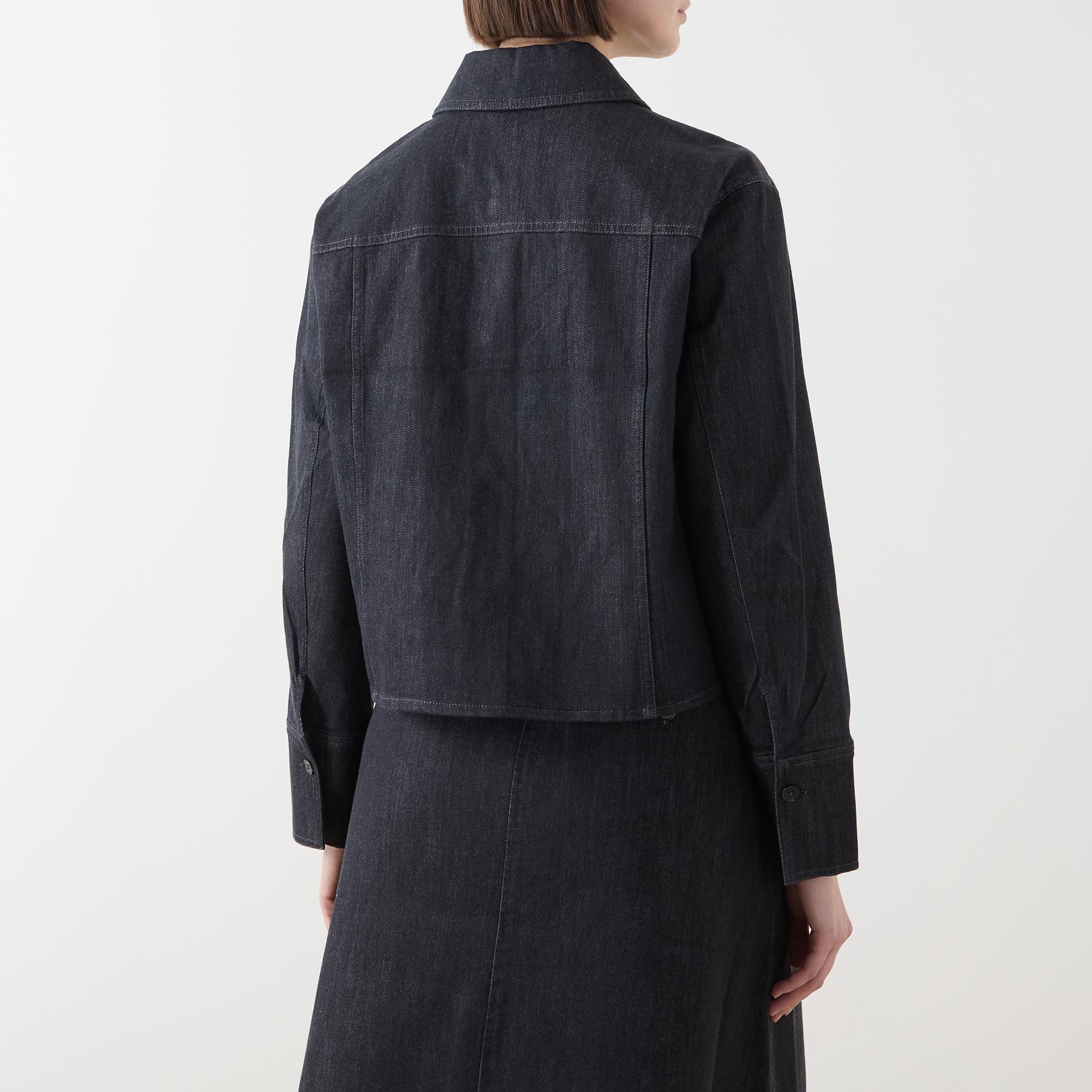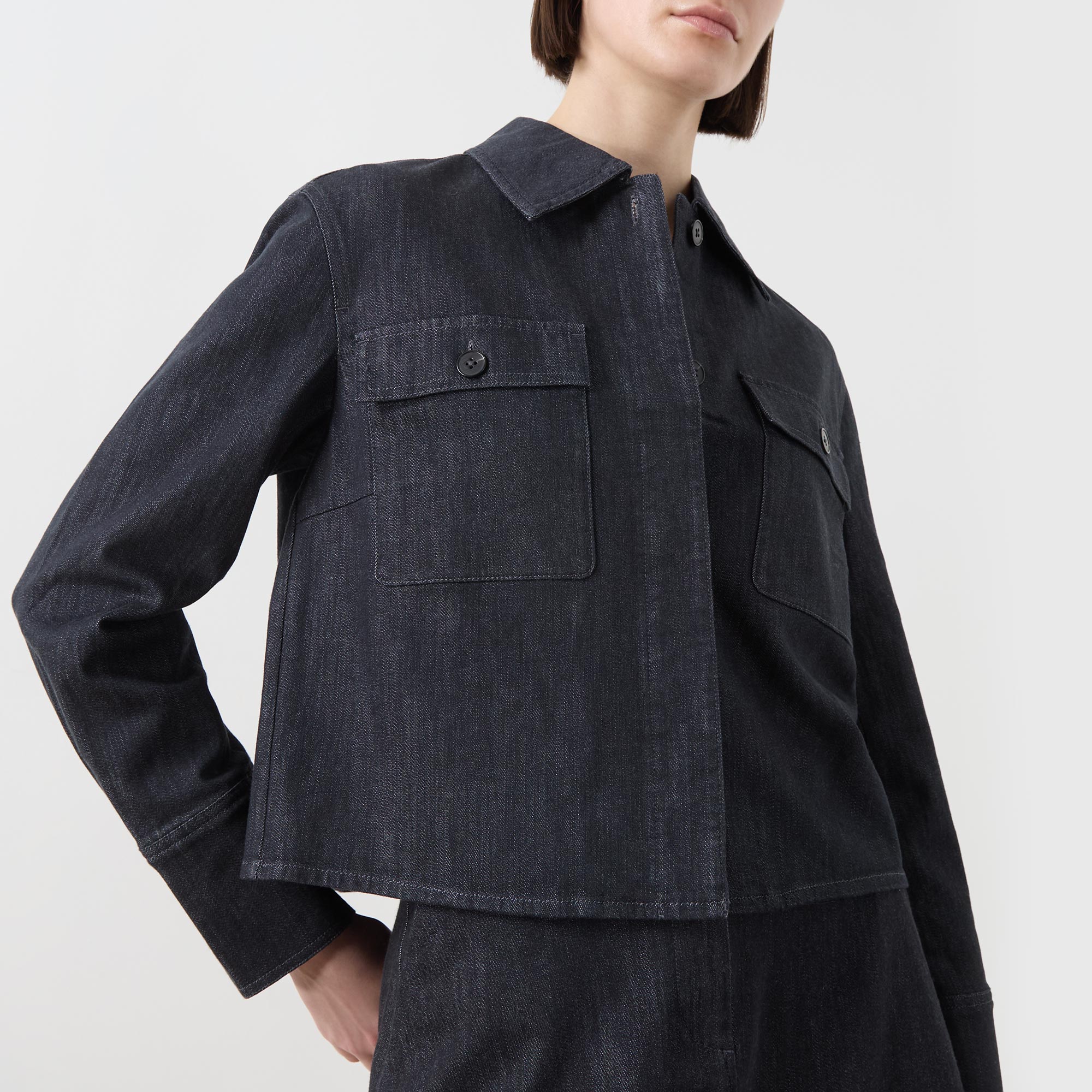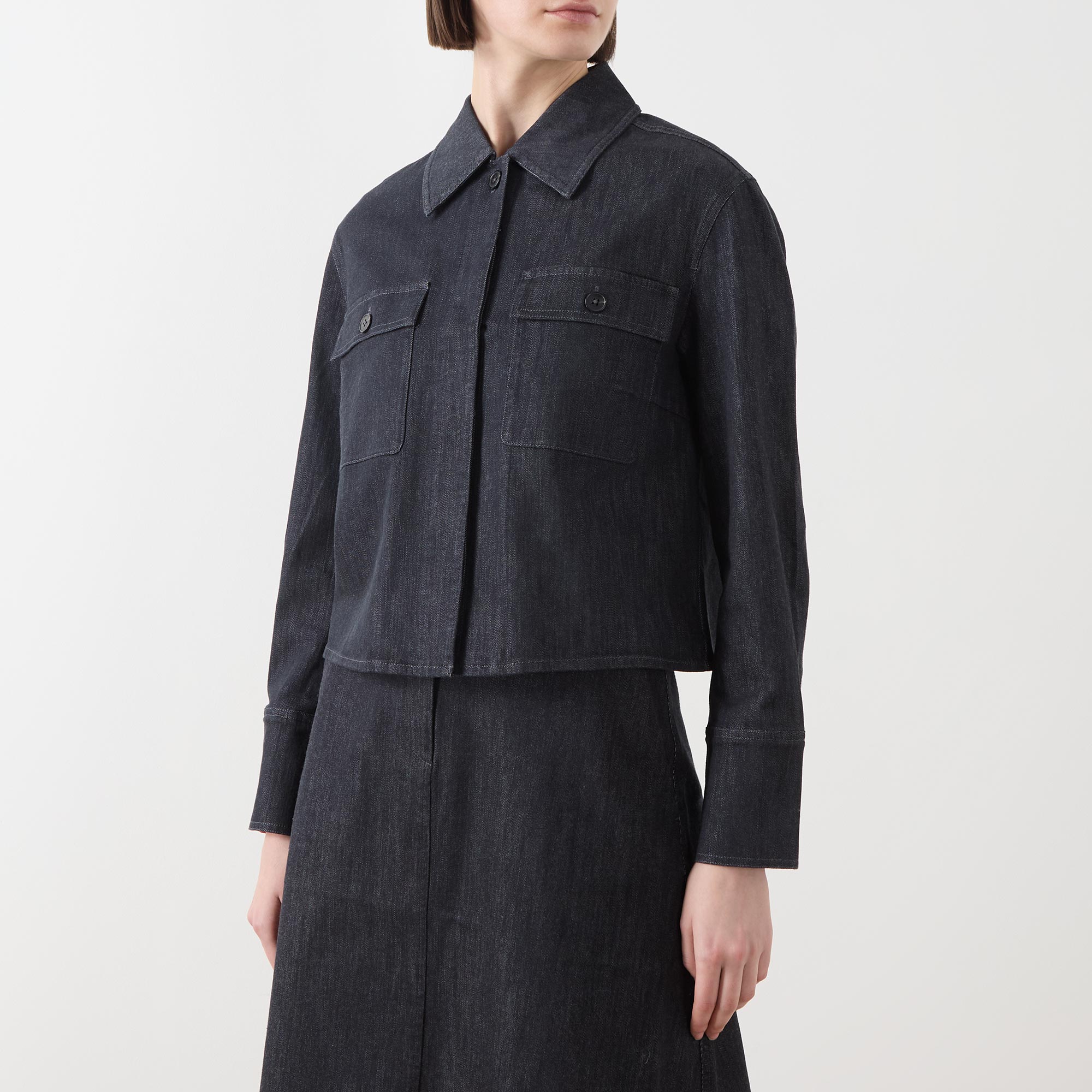- Boxy silhouette, kent collar, concealed button fastening, long sleeves, slightly dropped shoulders, patch pockets with flap closure