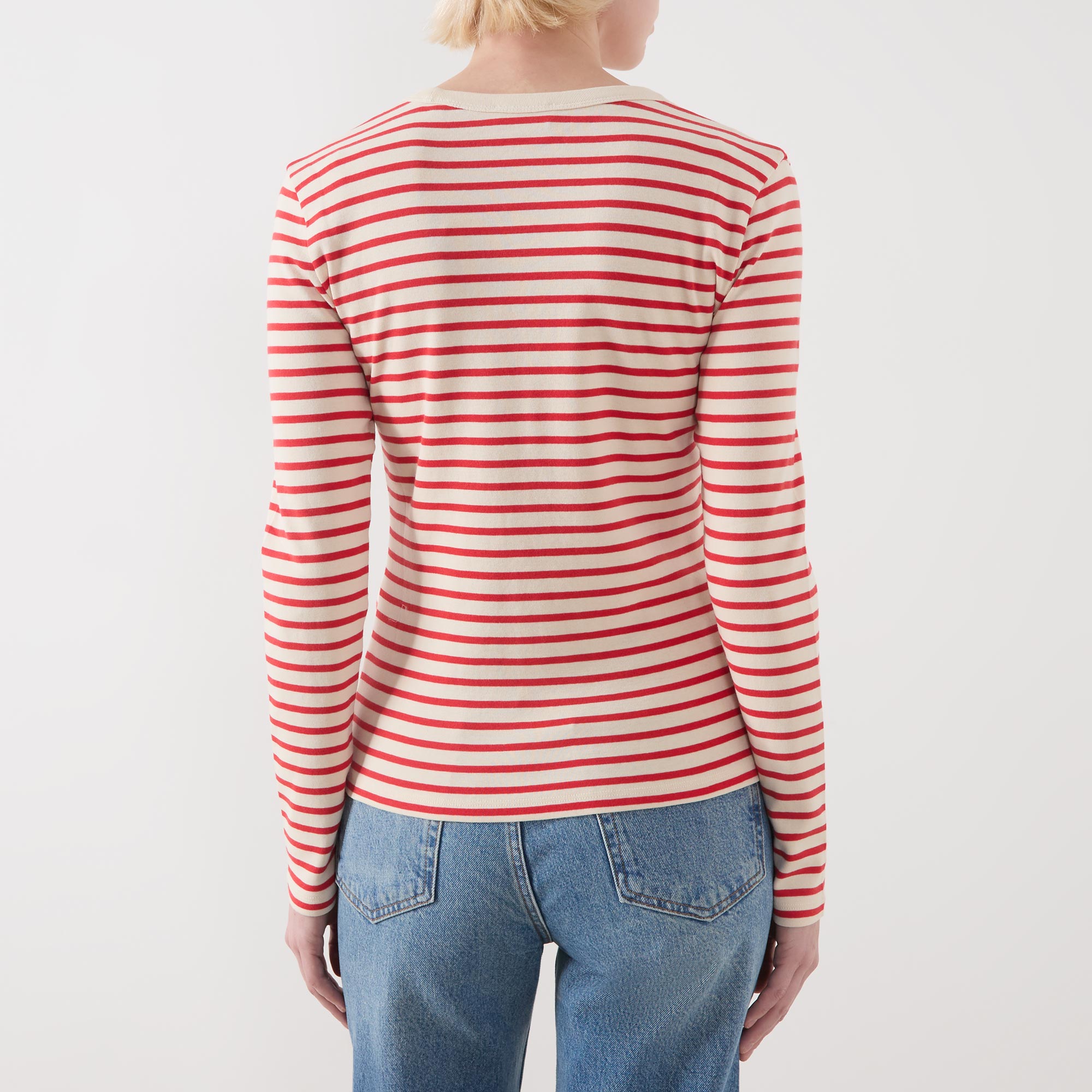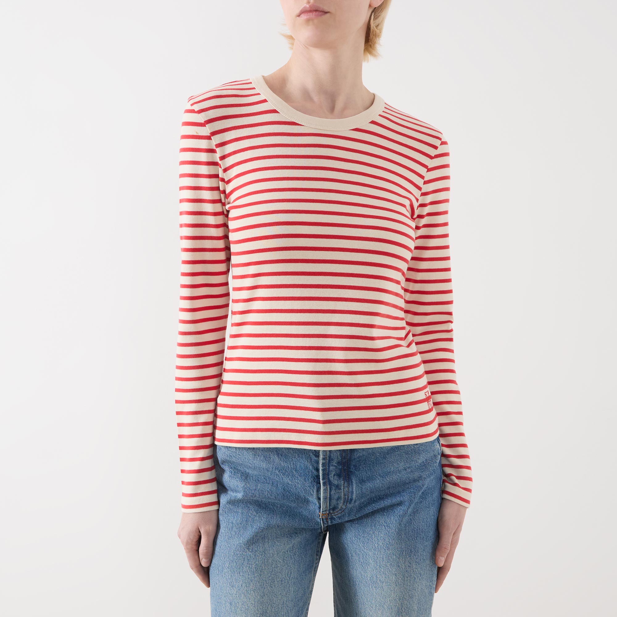 - Round neckline, long sleeves, striped pattern, logo detail, straight hemline, smooth fabric