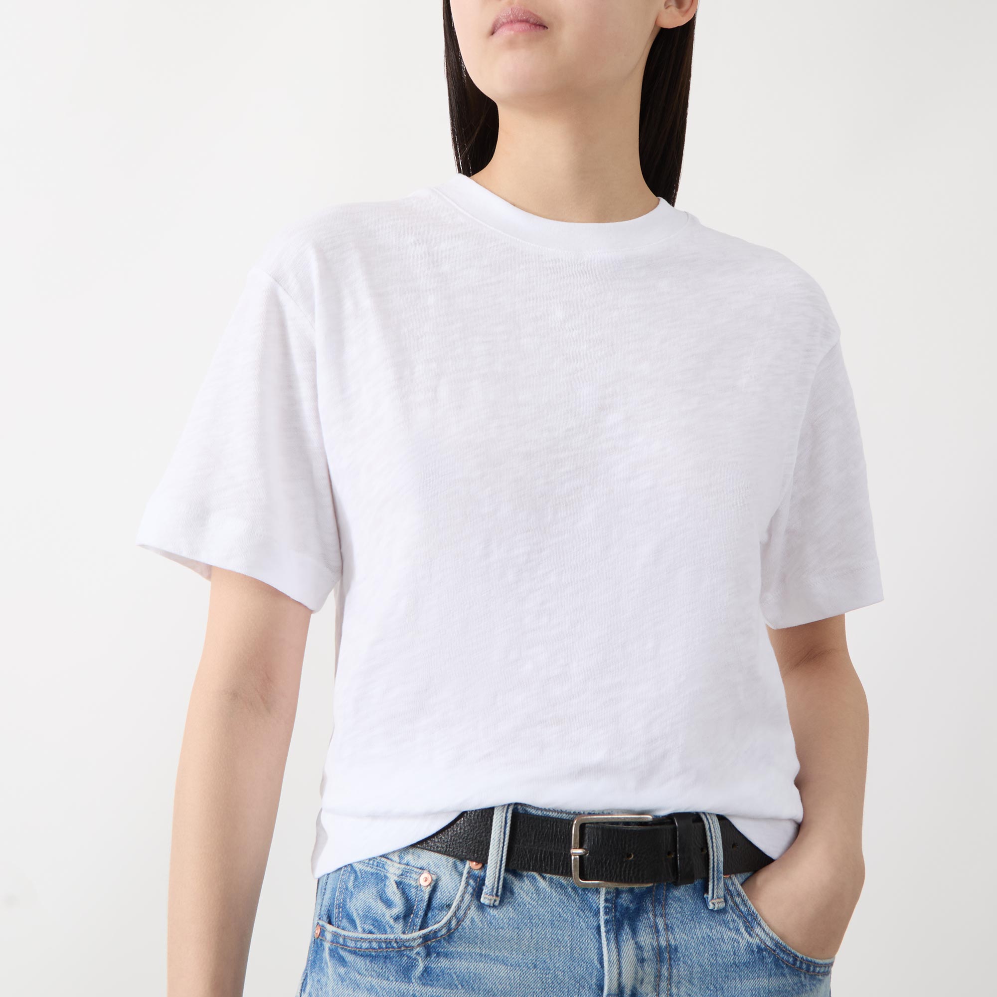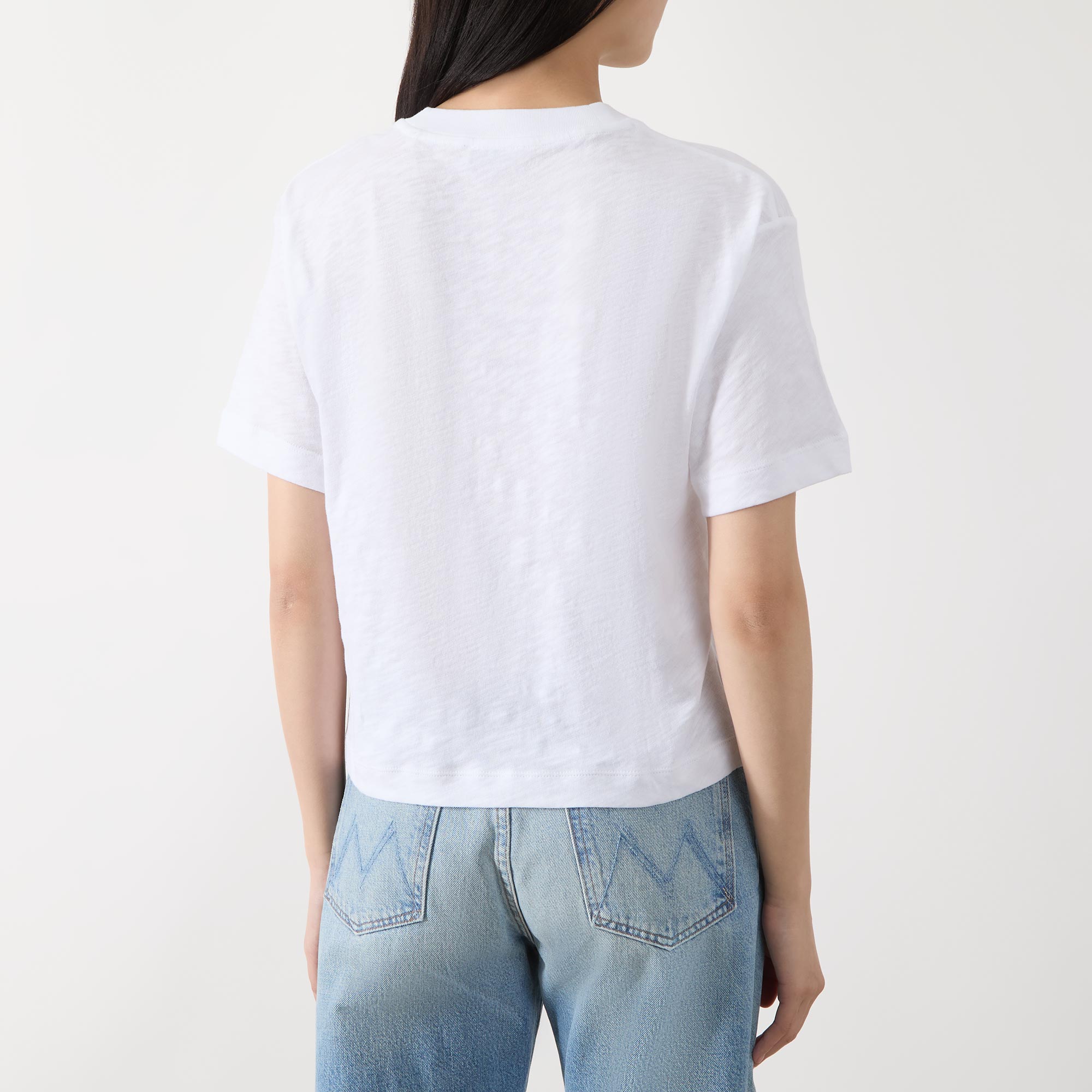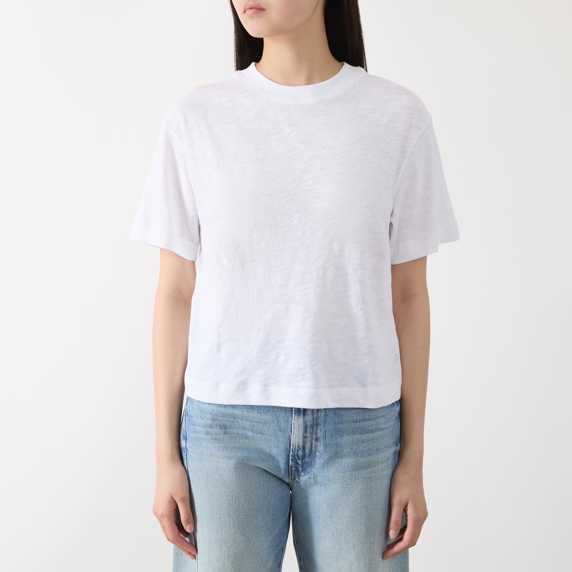 - Round neckline, short sleeves, straight hemline, slub style, logo print at hem
