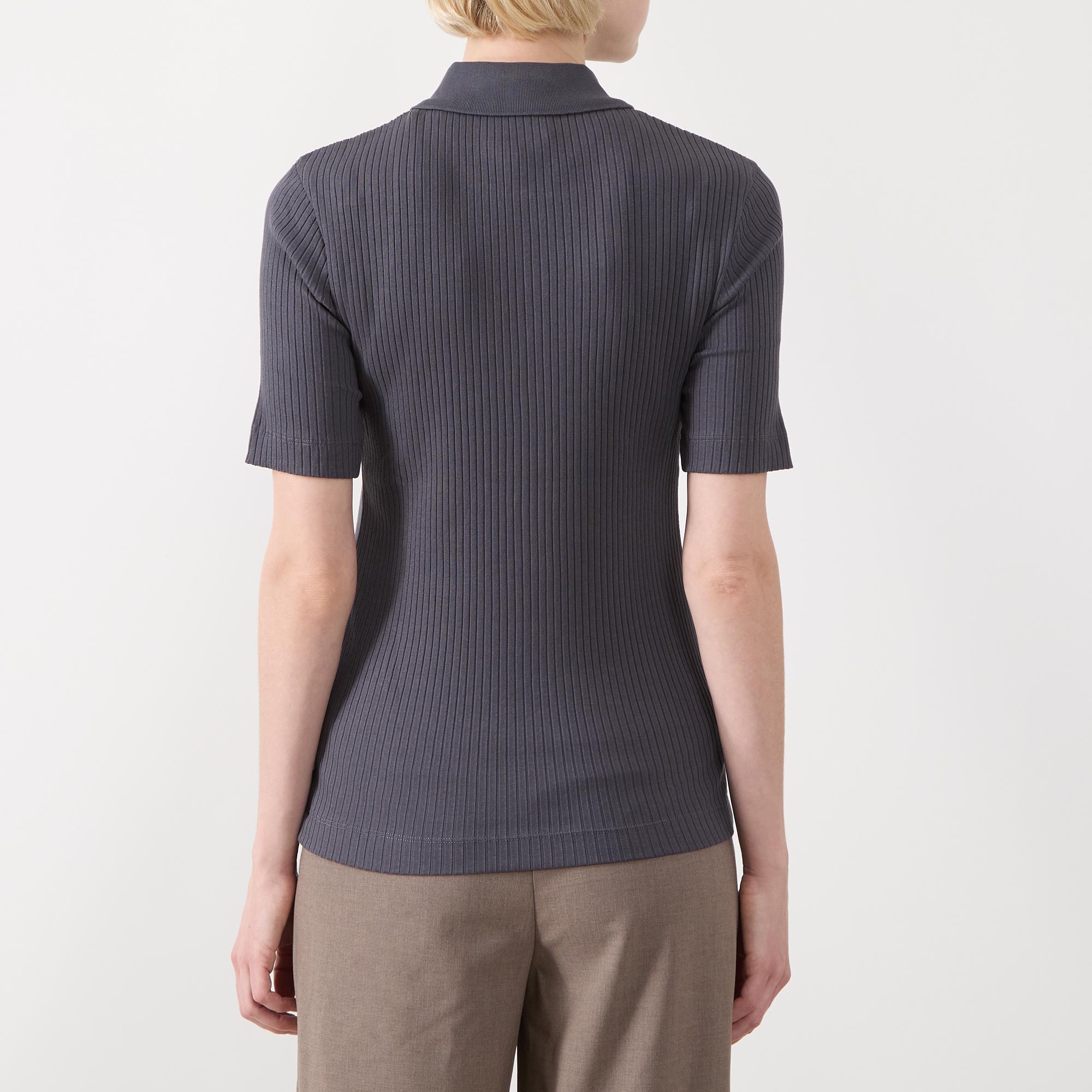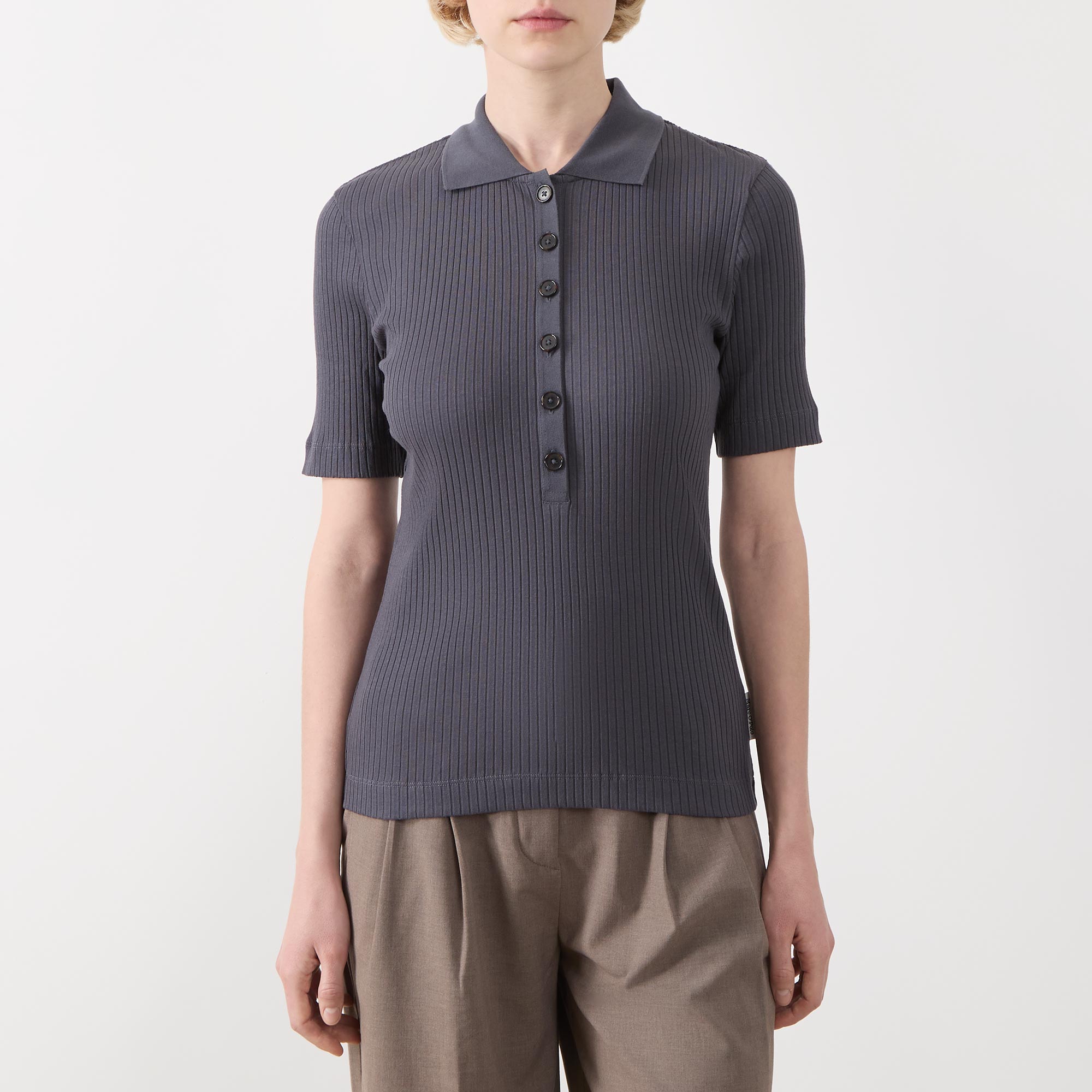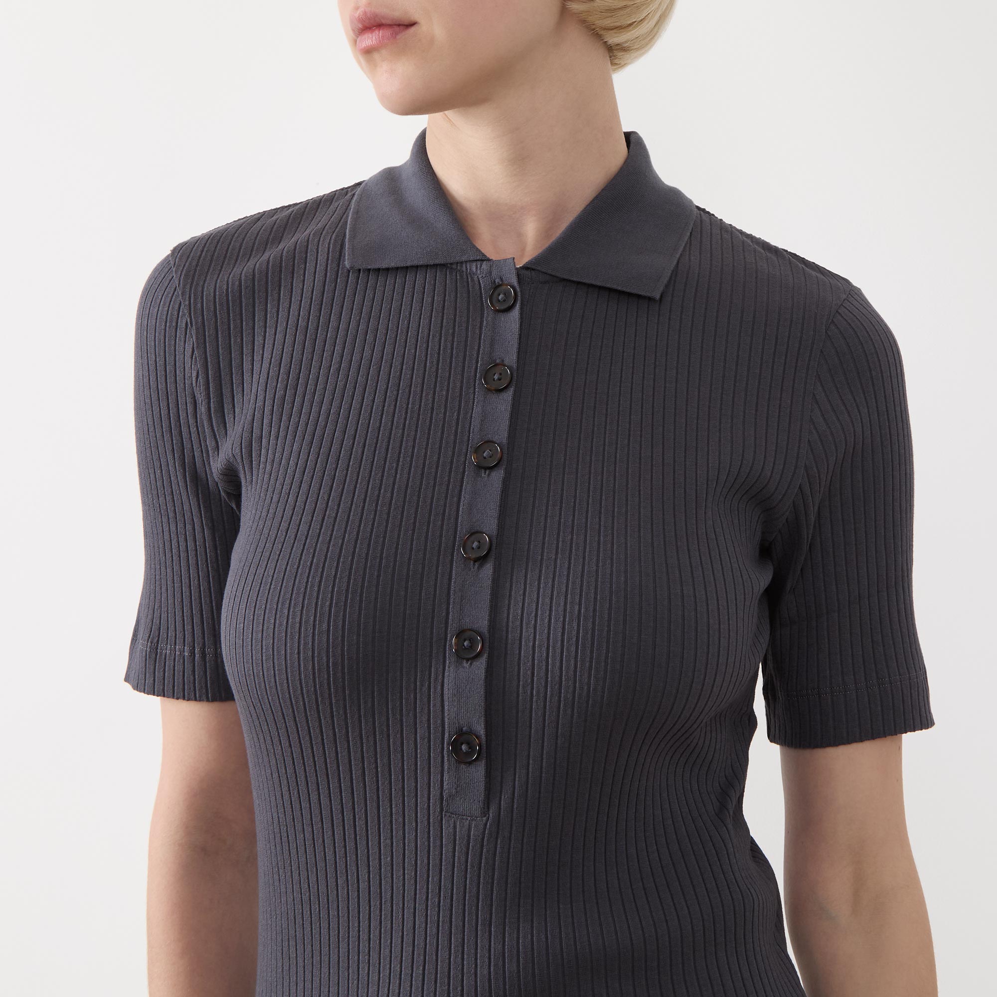 • Flat collar, short sleeves, straight hemline, rib knit structure, button fastening