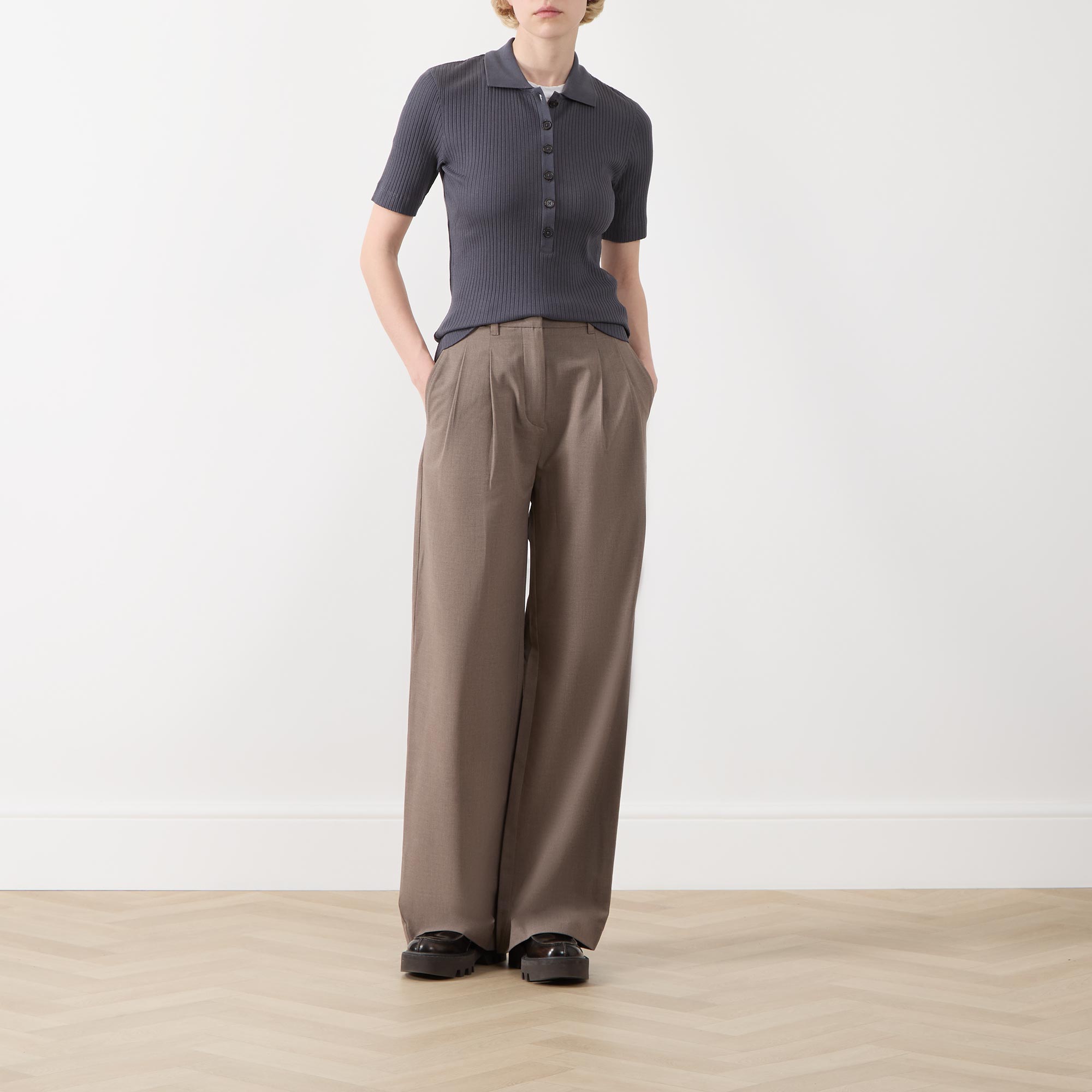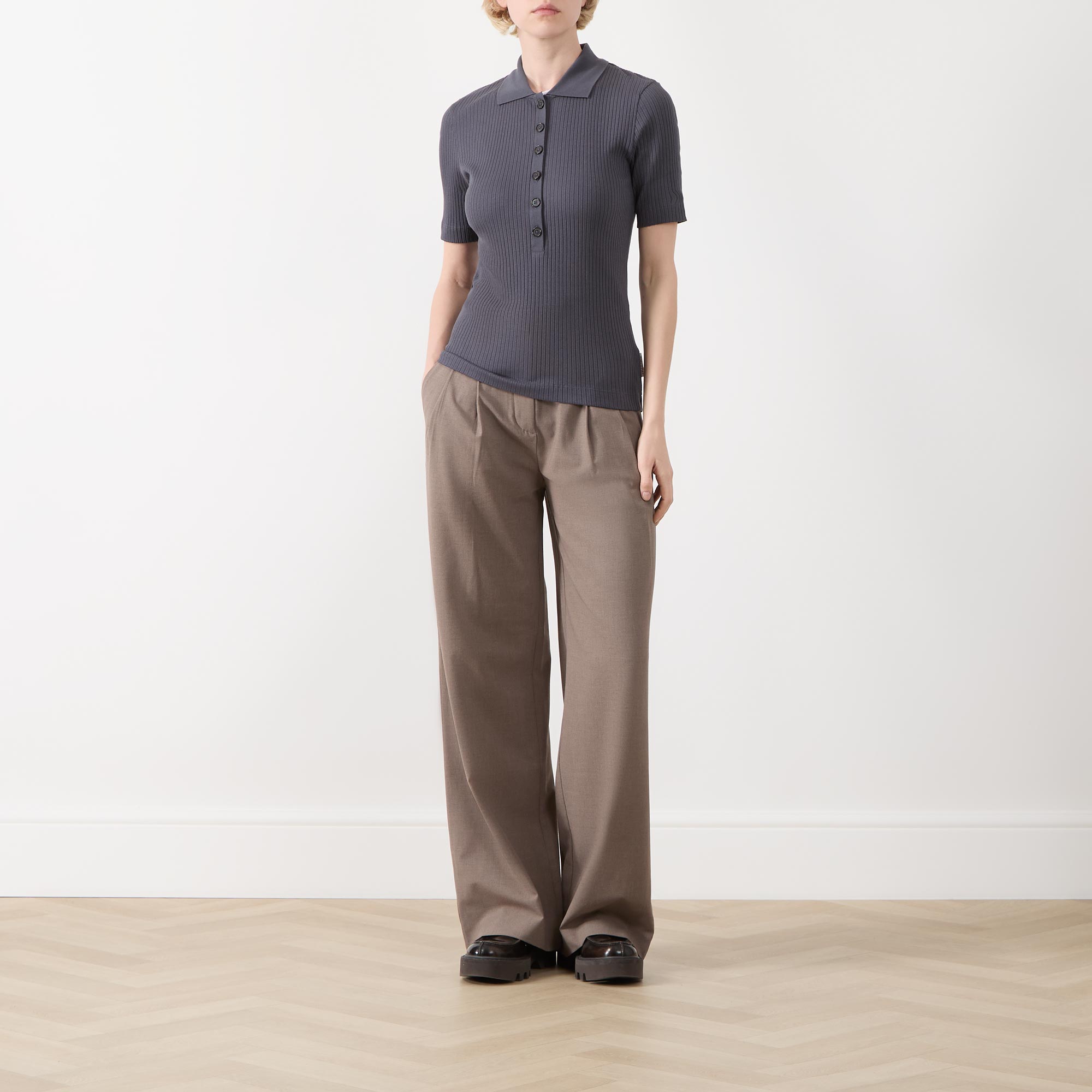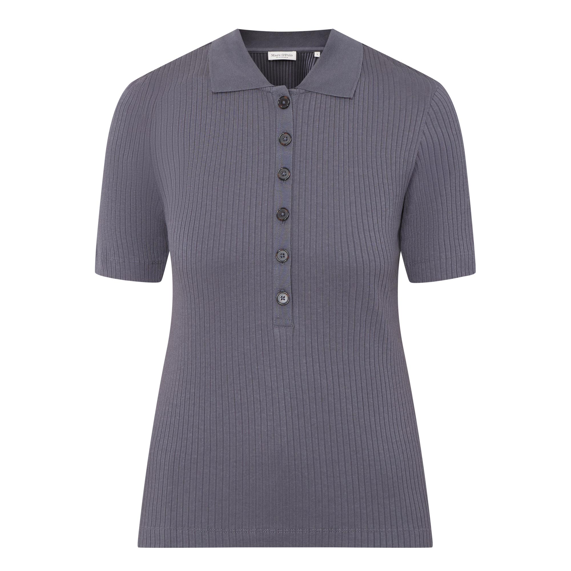 • Flat collar, short sleeves, straight hemline, rib knit structure, button fastening
