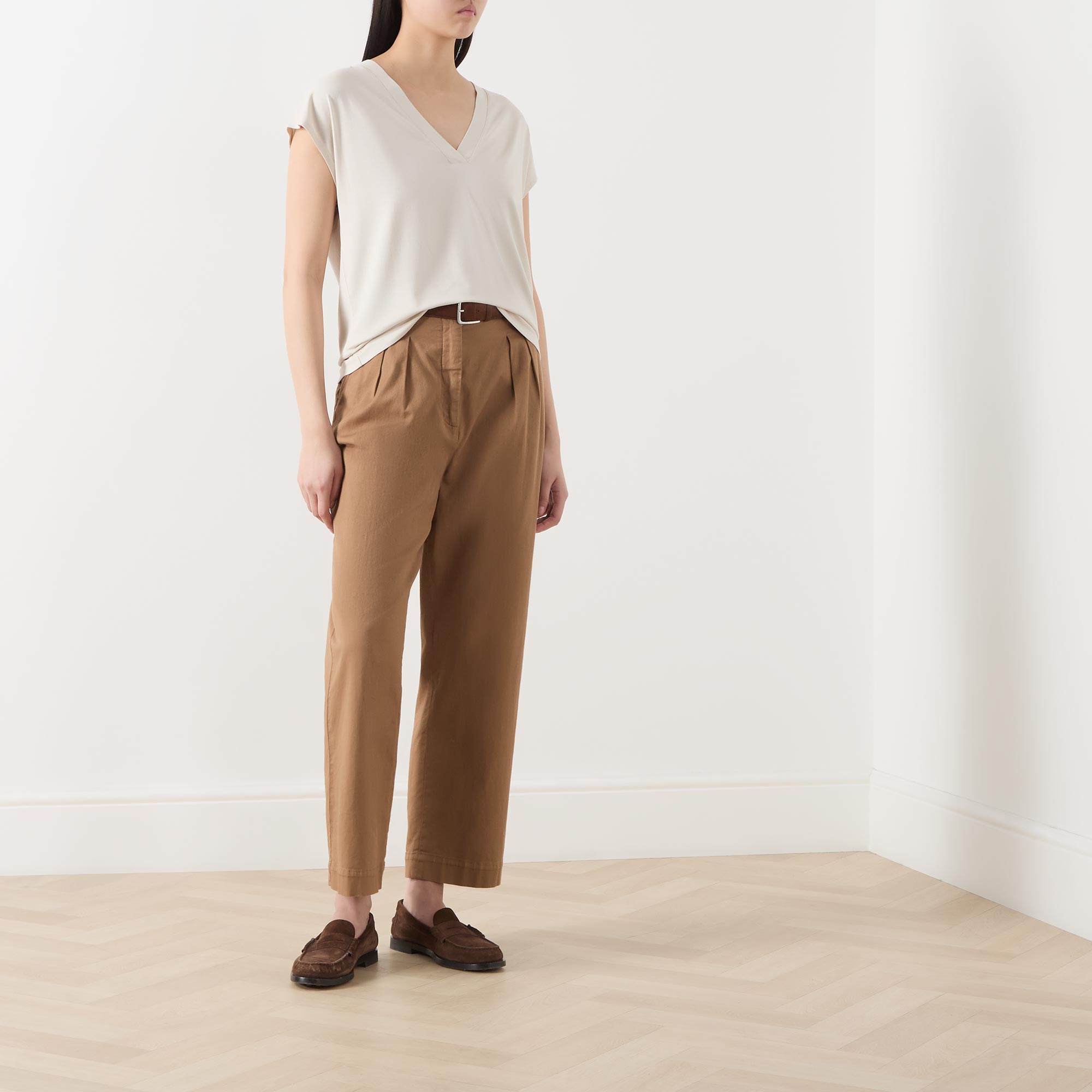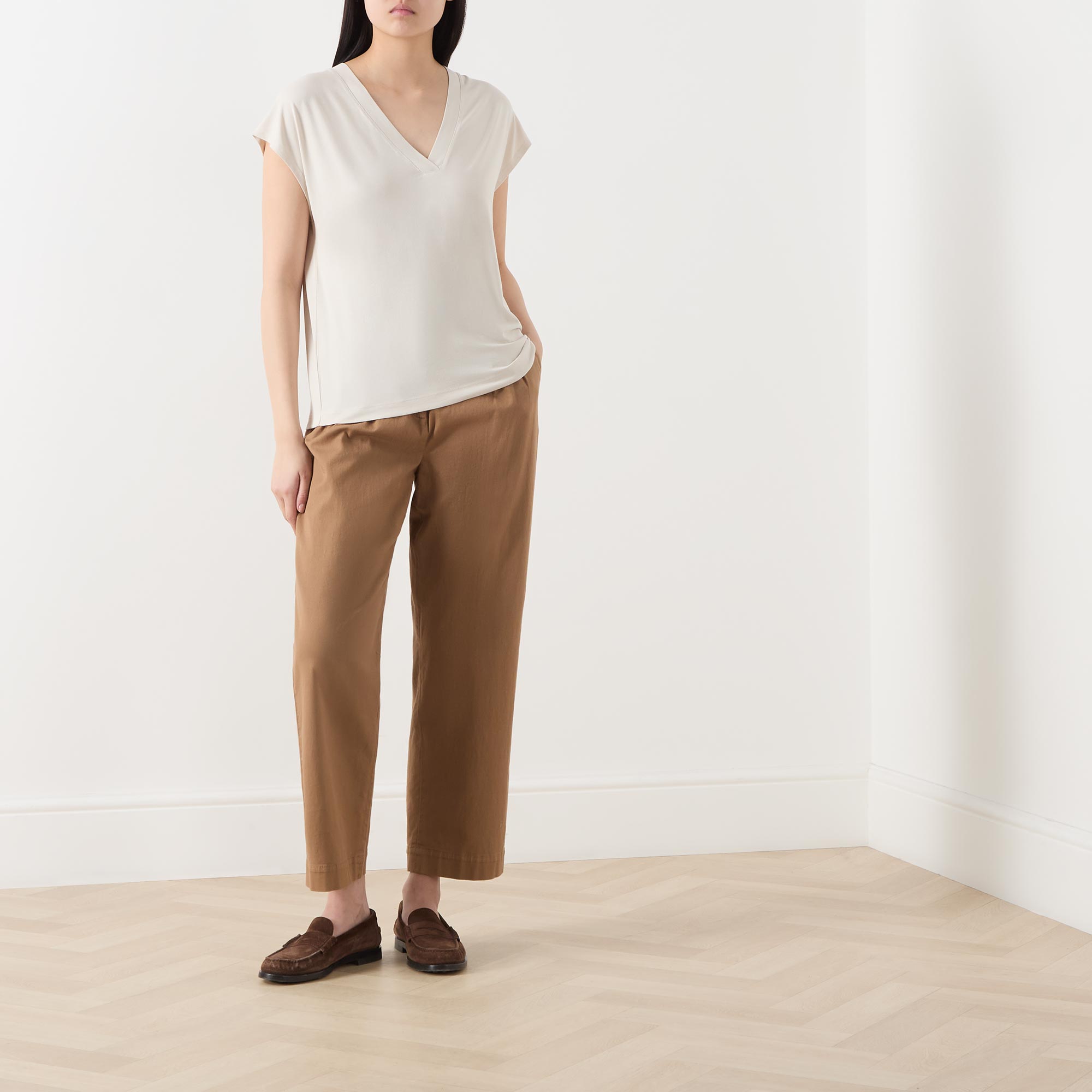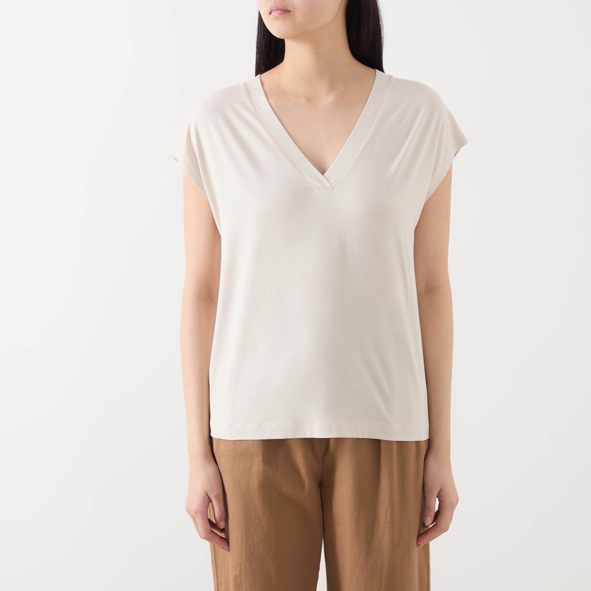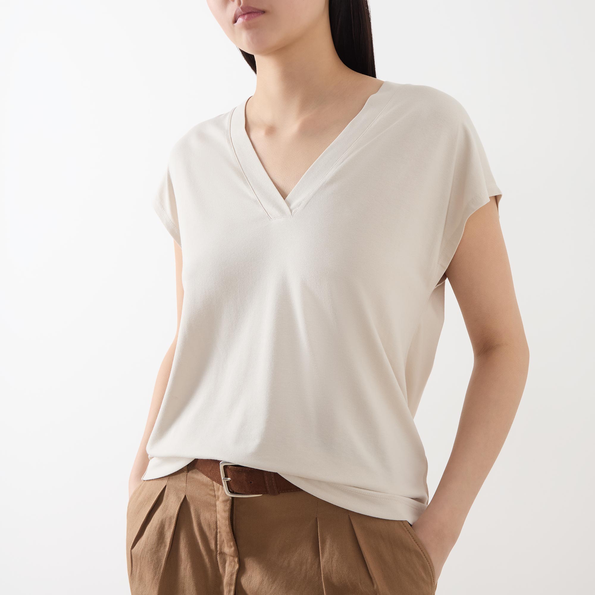 • V-neckline and back, cap sleeves, straight hemline, stretch-fused fabric, solid style