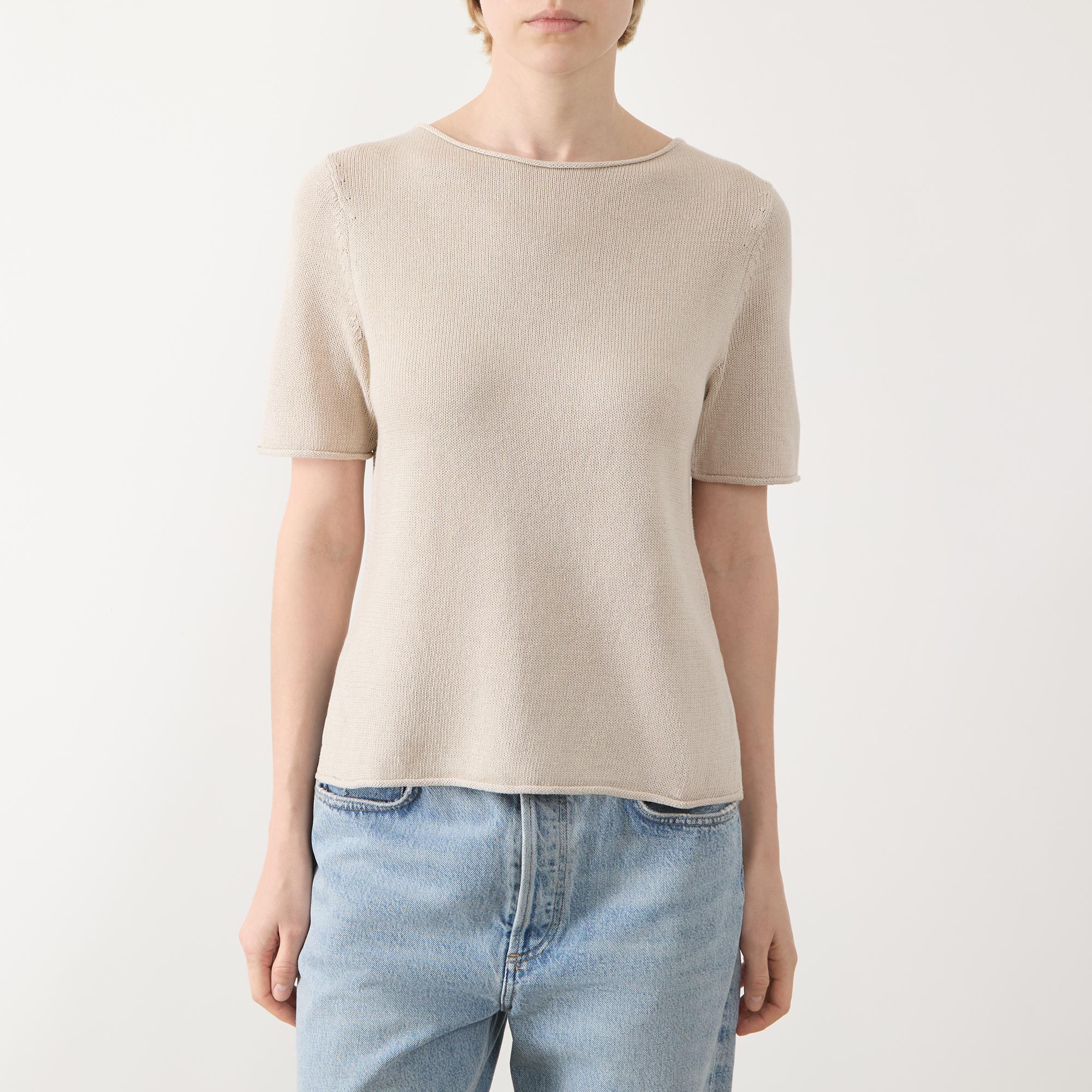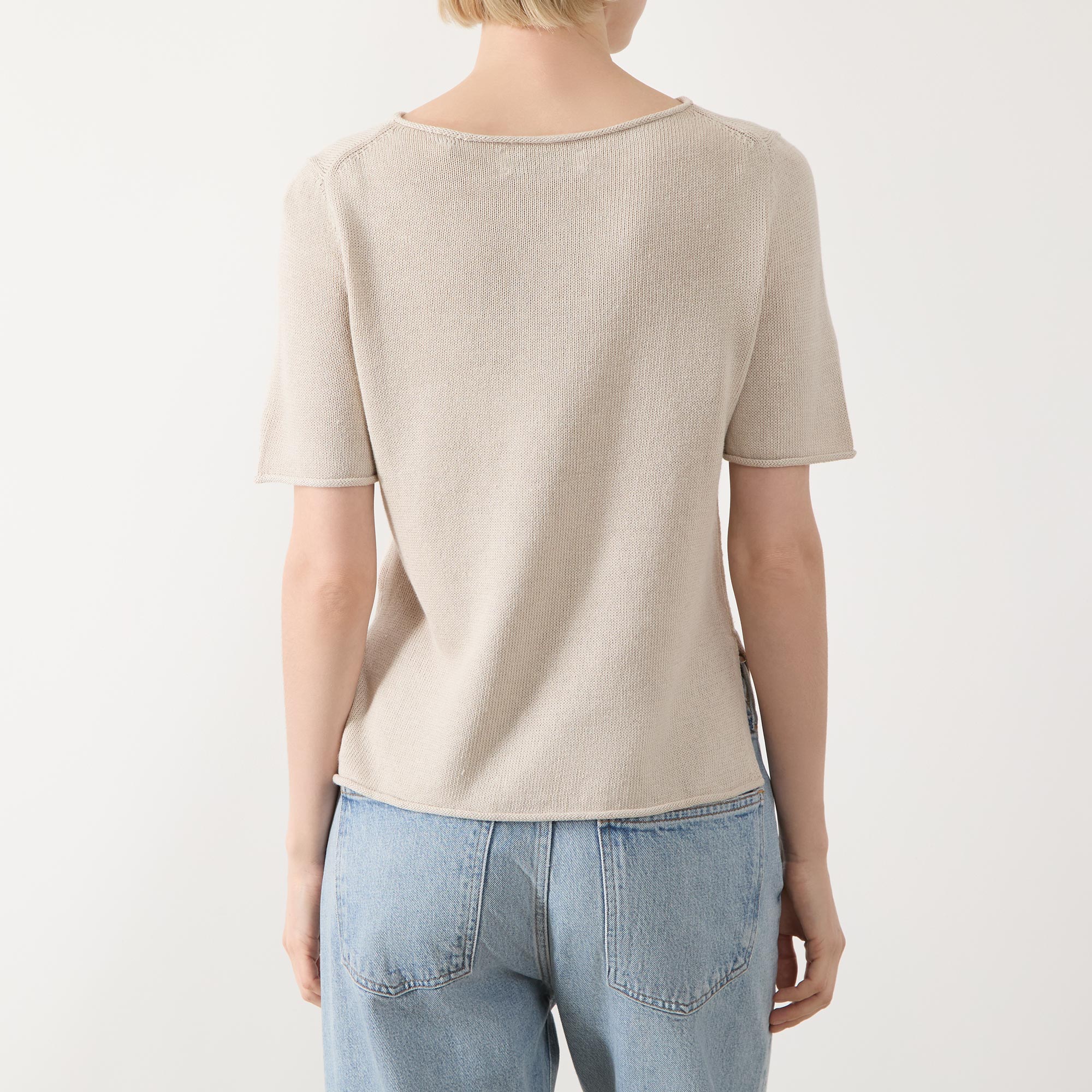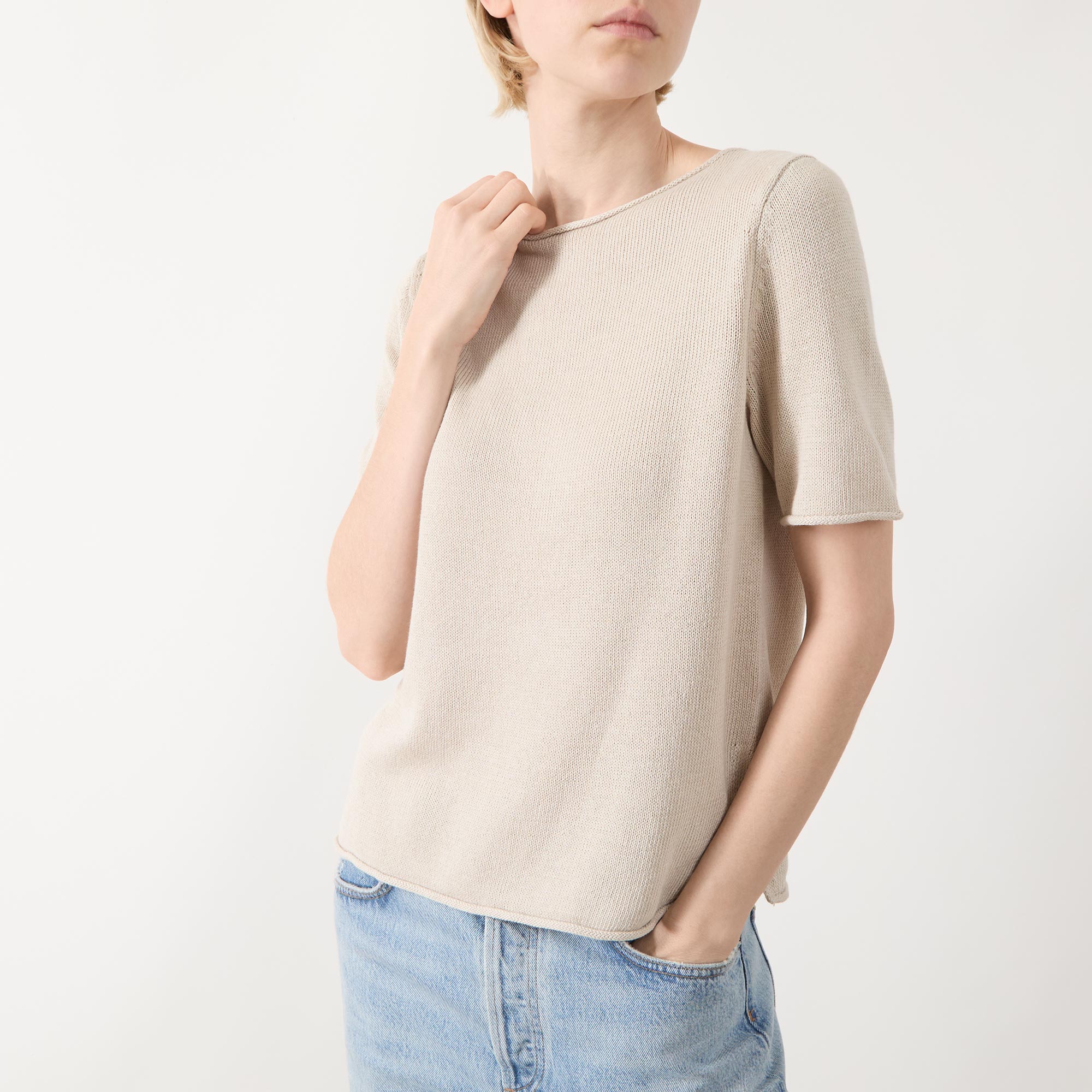 - Round neckline, short sleeves, straight hemline, rolled trims, stockinette stitch structure