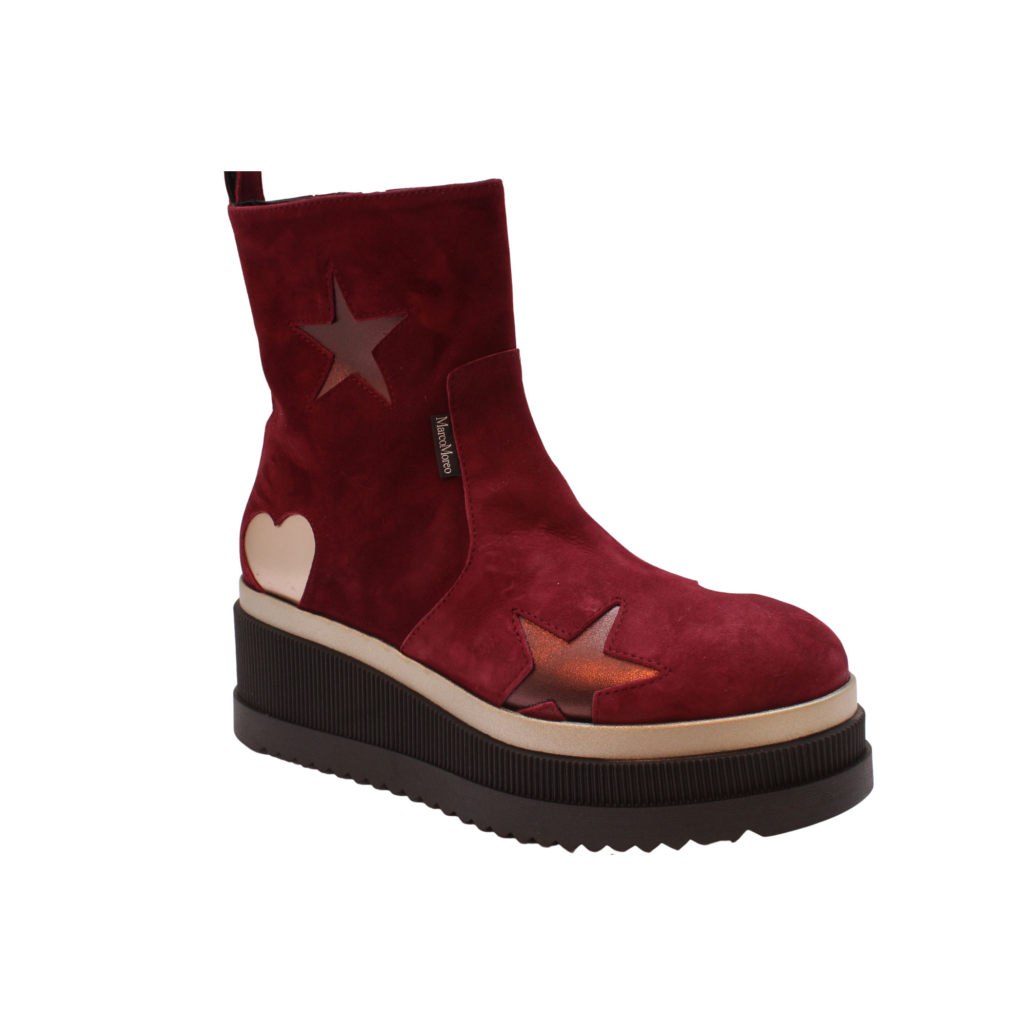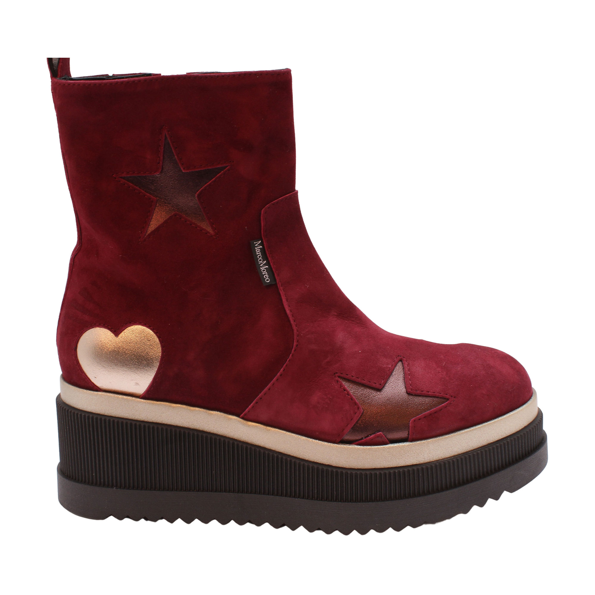 Corinne is the most classic of ankle-boots, with clean and elegant lines that ooze a romantic style. Marco Moreo’s iconic star and heart decoration from previous collections returns, and this time the tones are gold and bronze, for a play of light and reflections that warms every step!