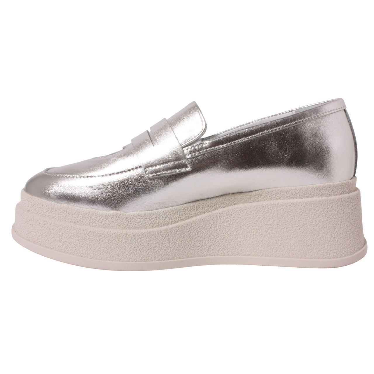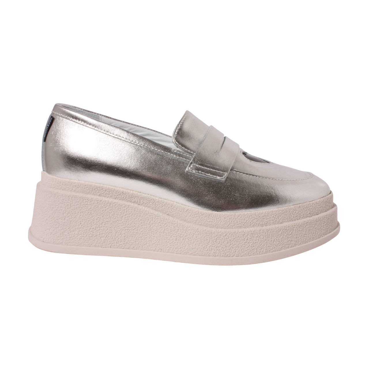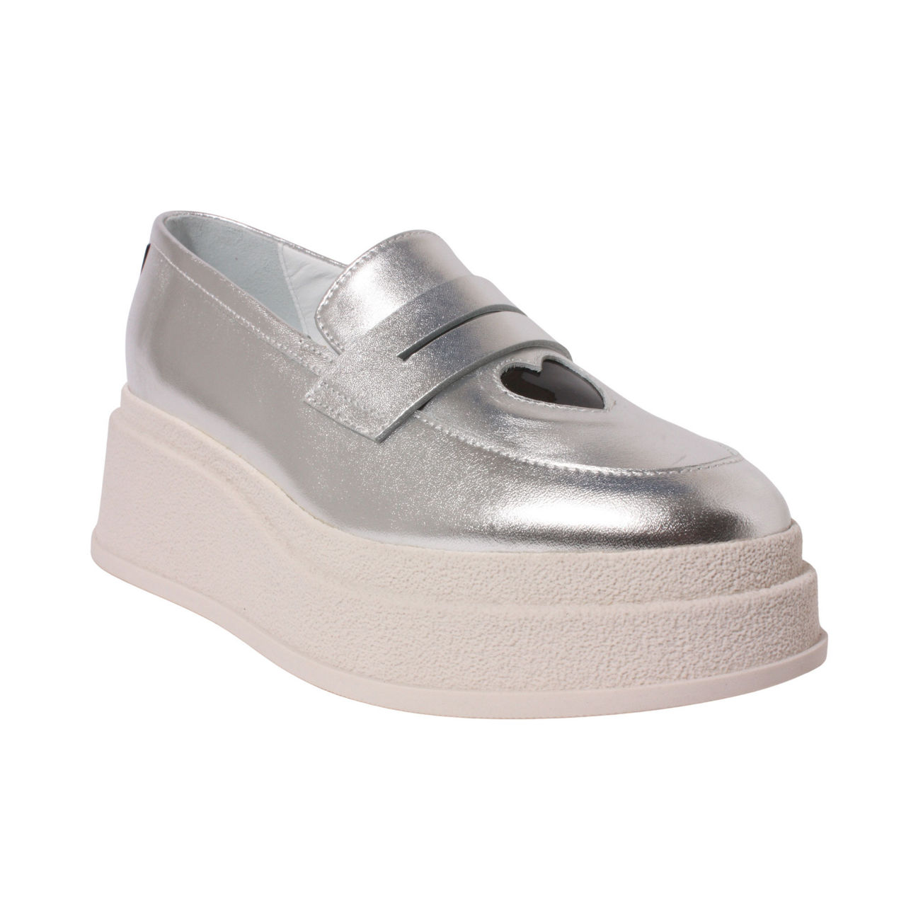 The wedge shoe continues to go from strength to strength with a heart detailing on the front of this loafer it is the ultimate walking shoe for both style and comfort. Available in silver gold and white.