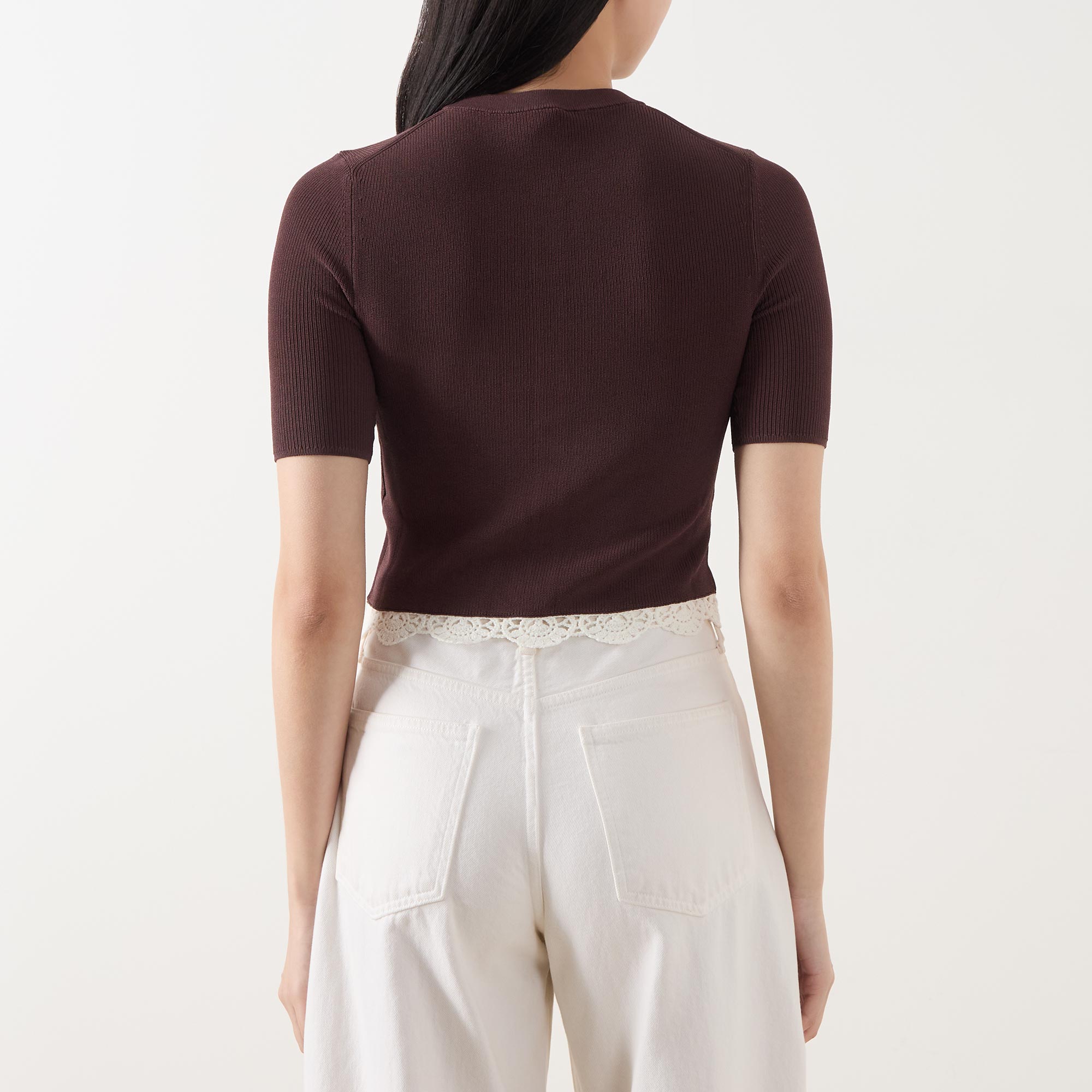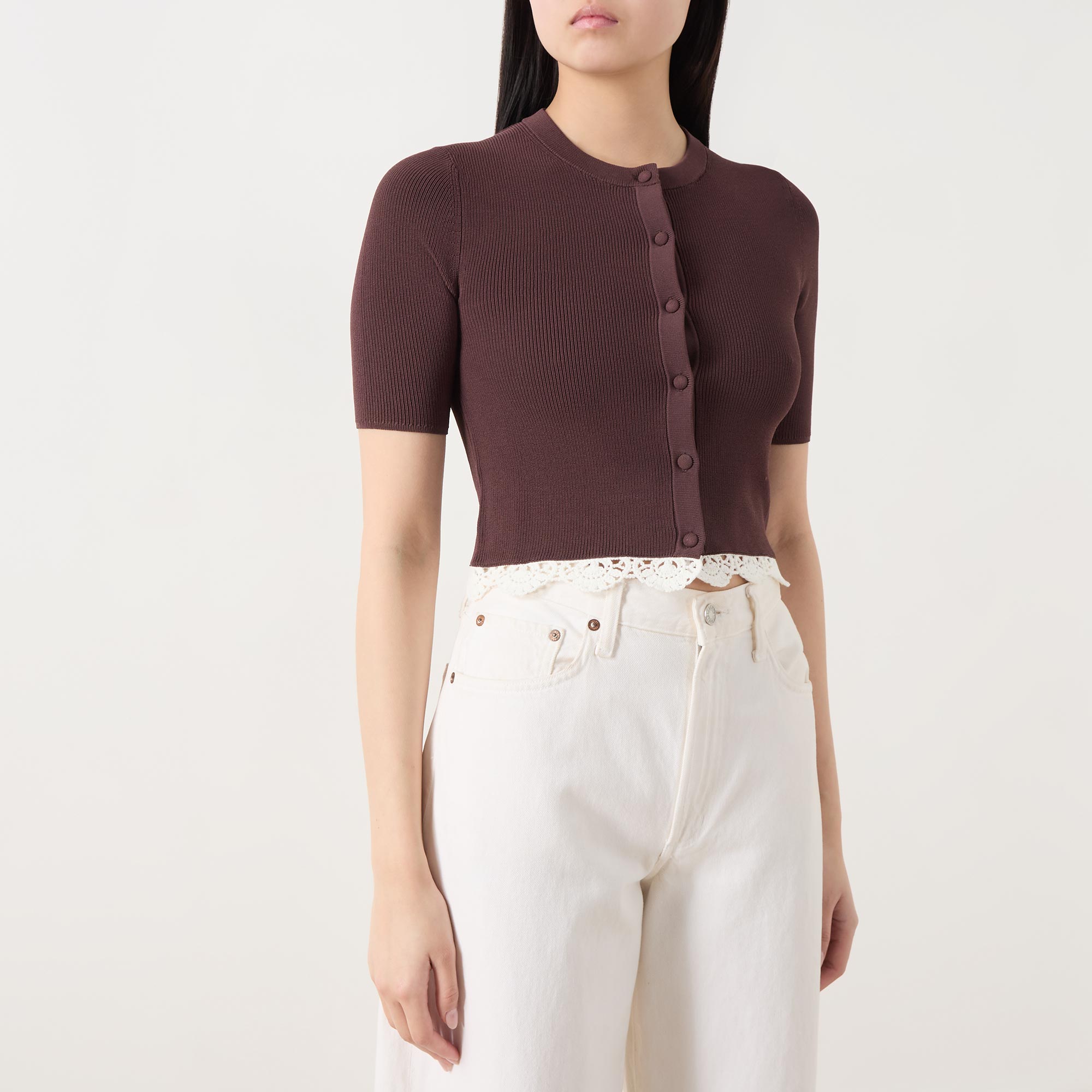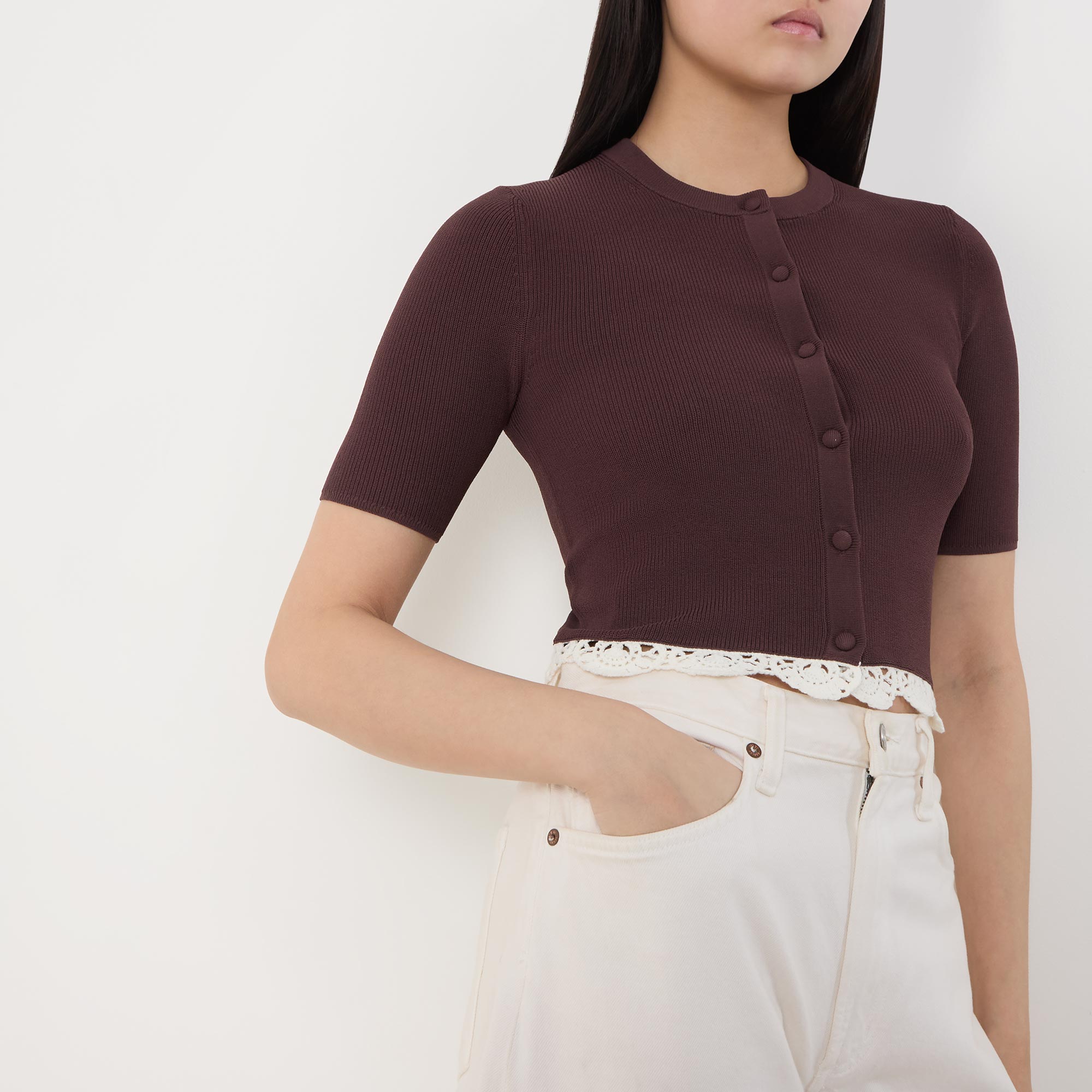 - Round neckline, button fastening, short sleeves, cropped length, knit structure