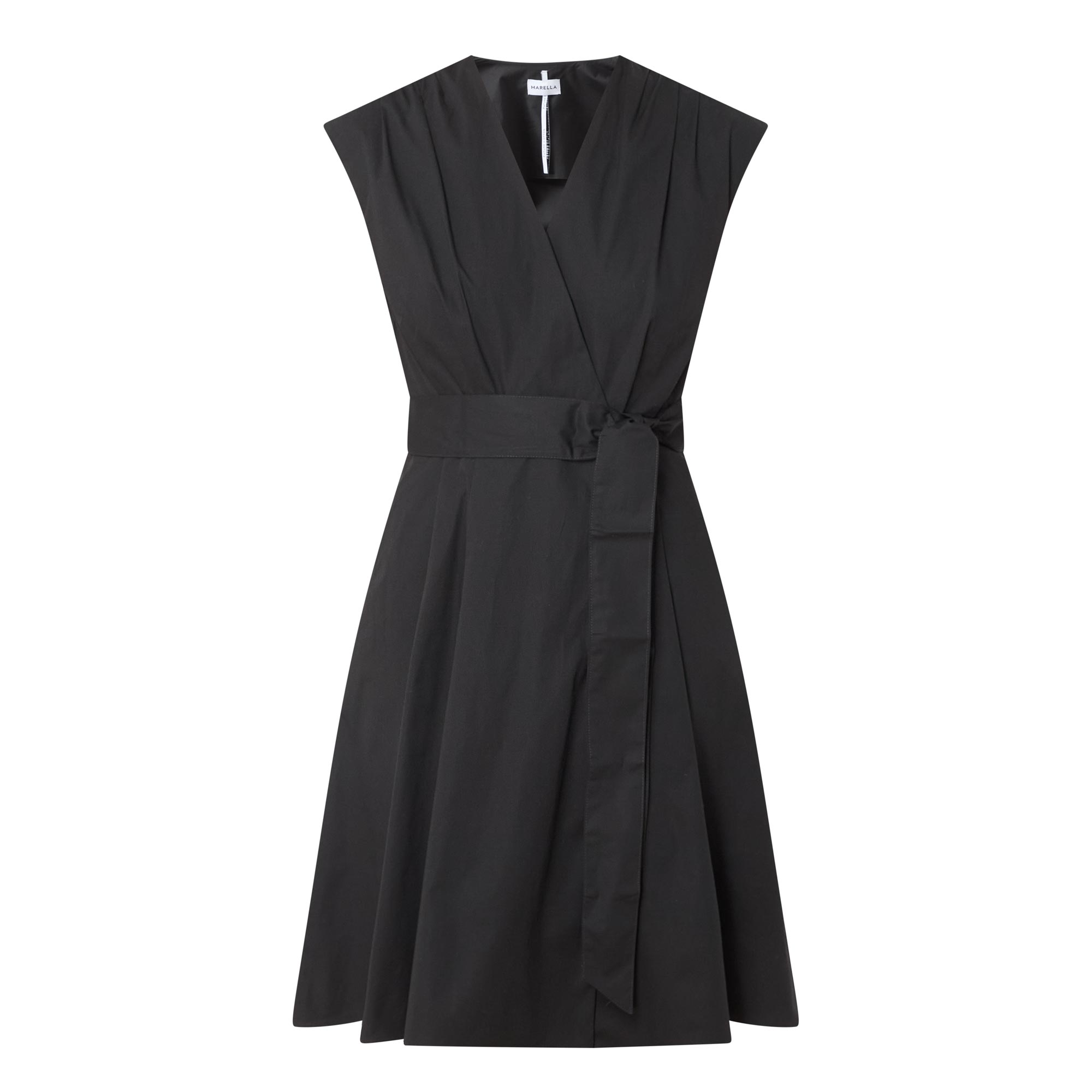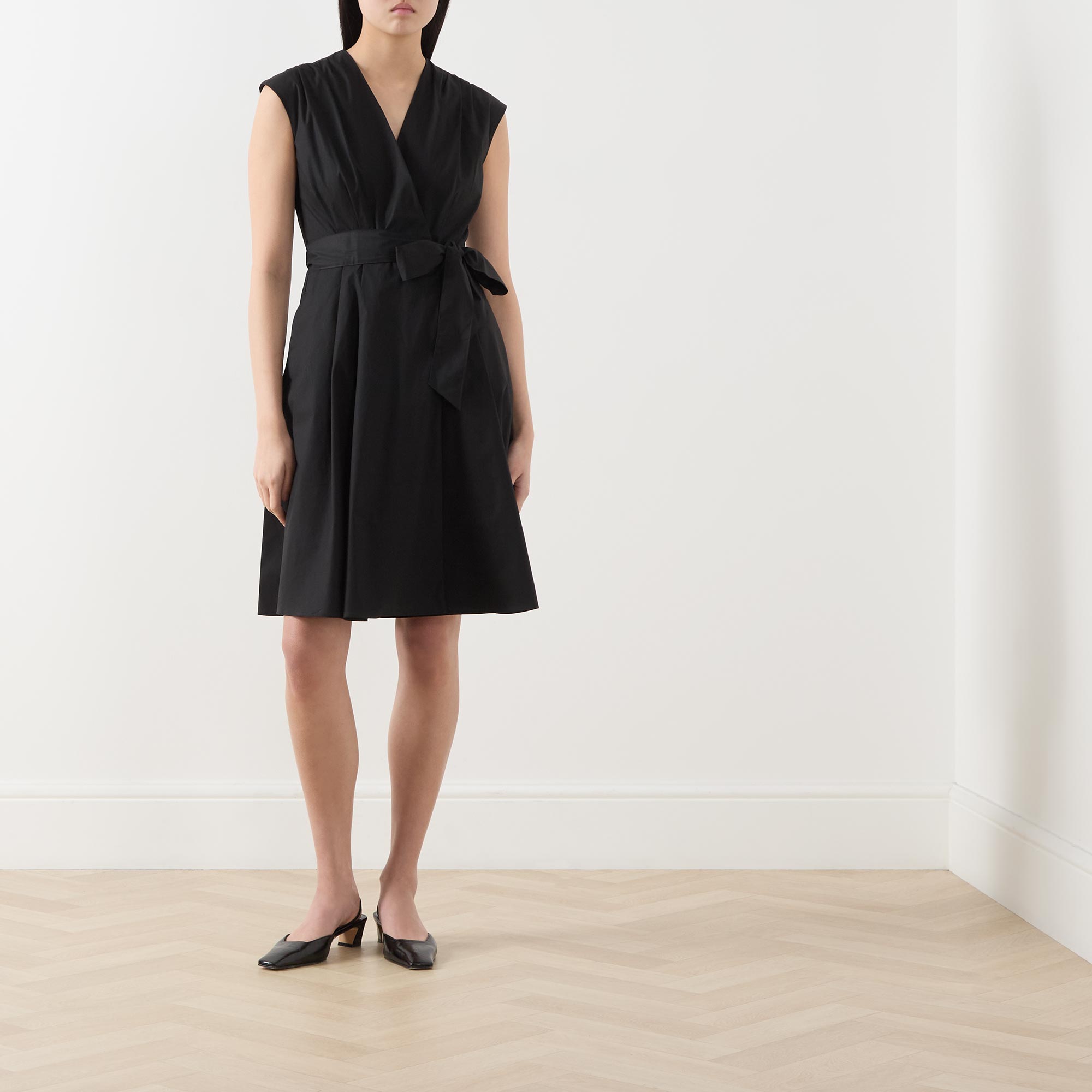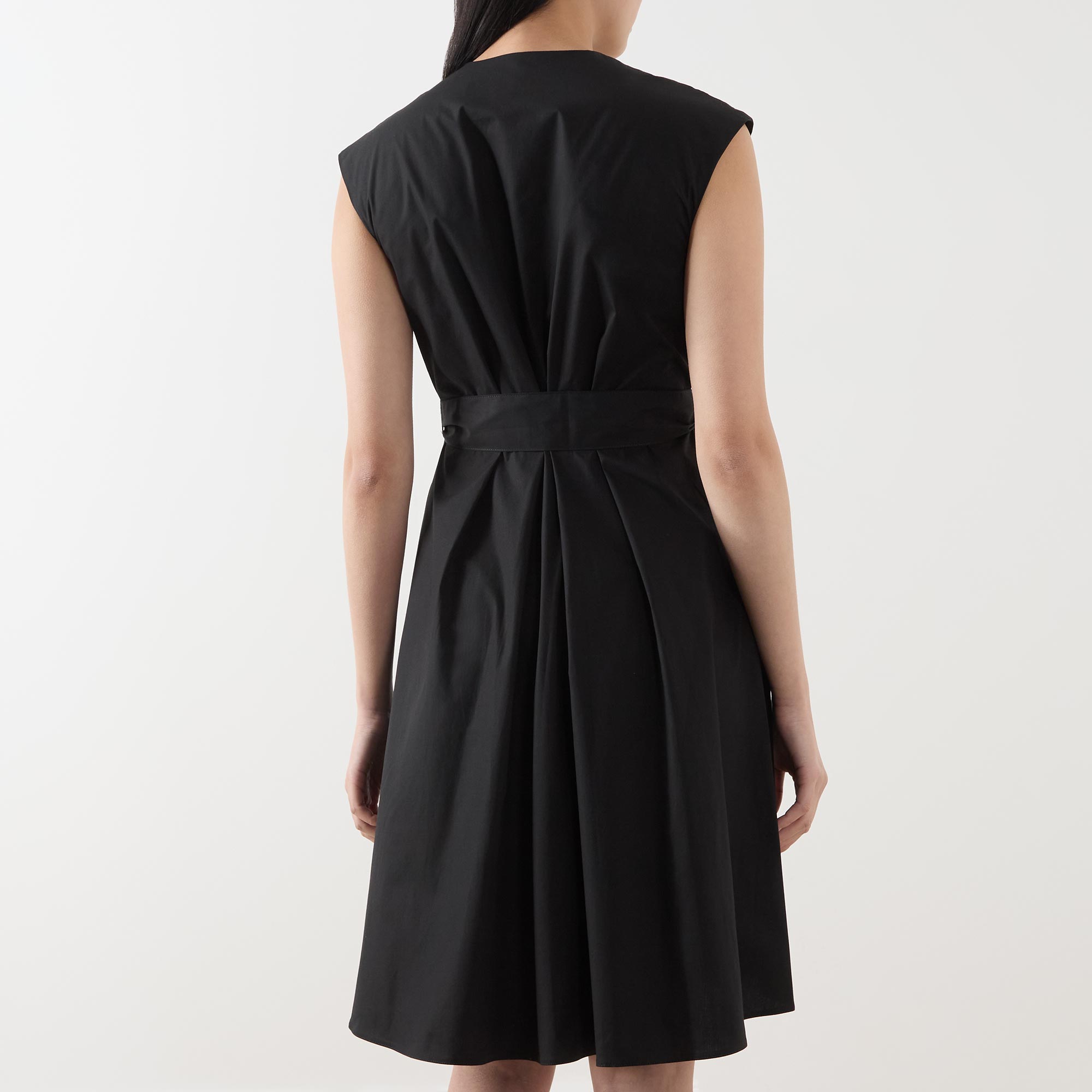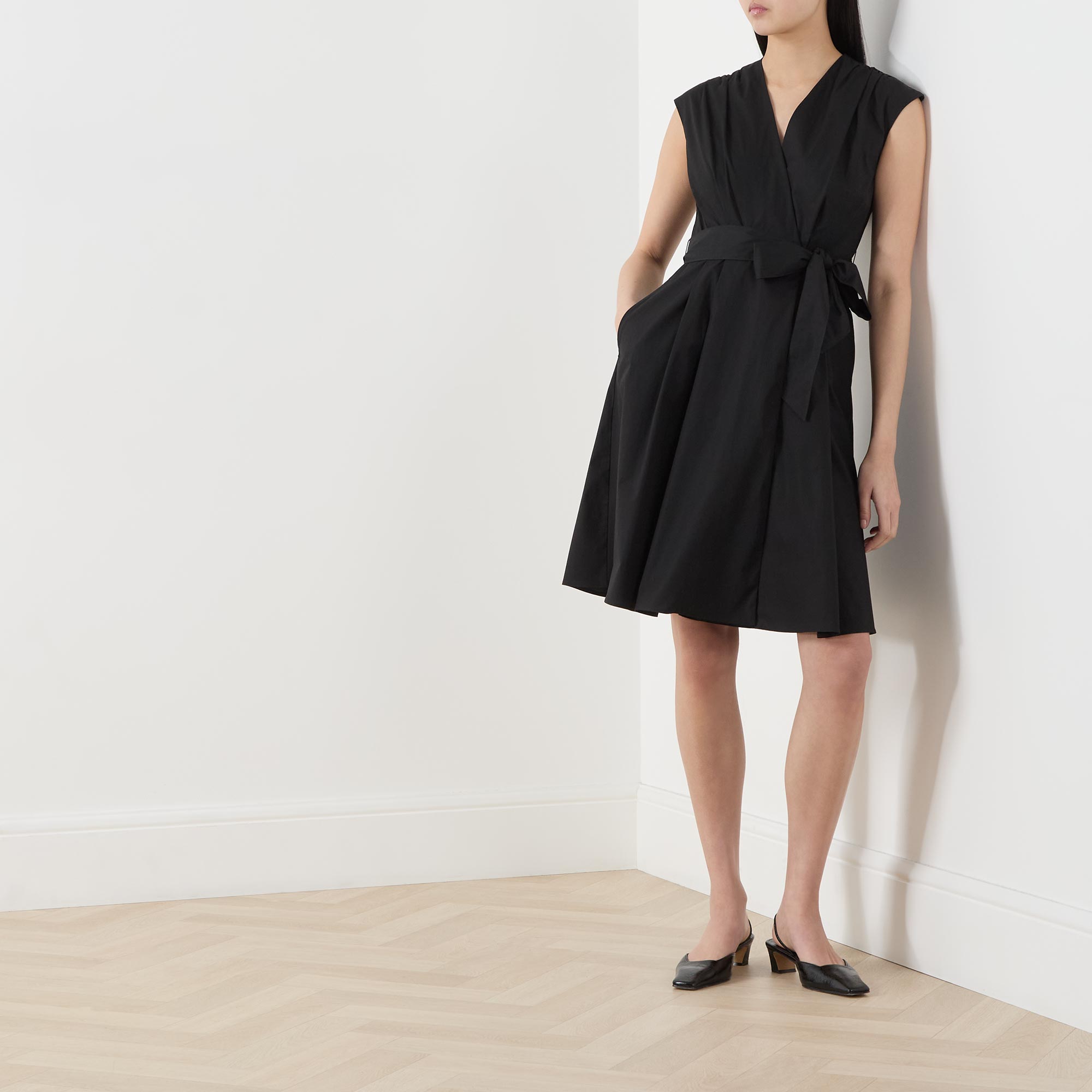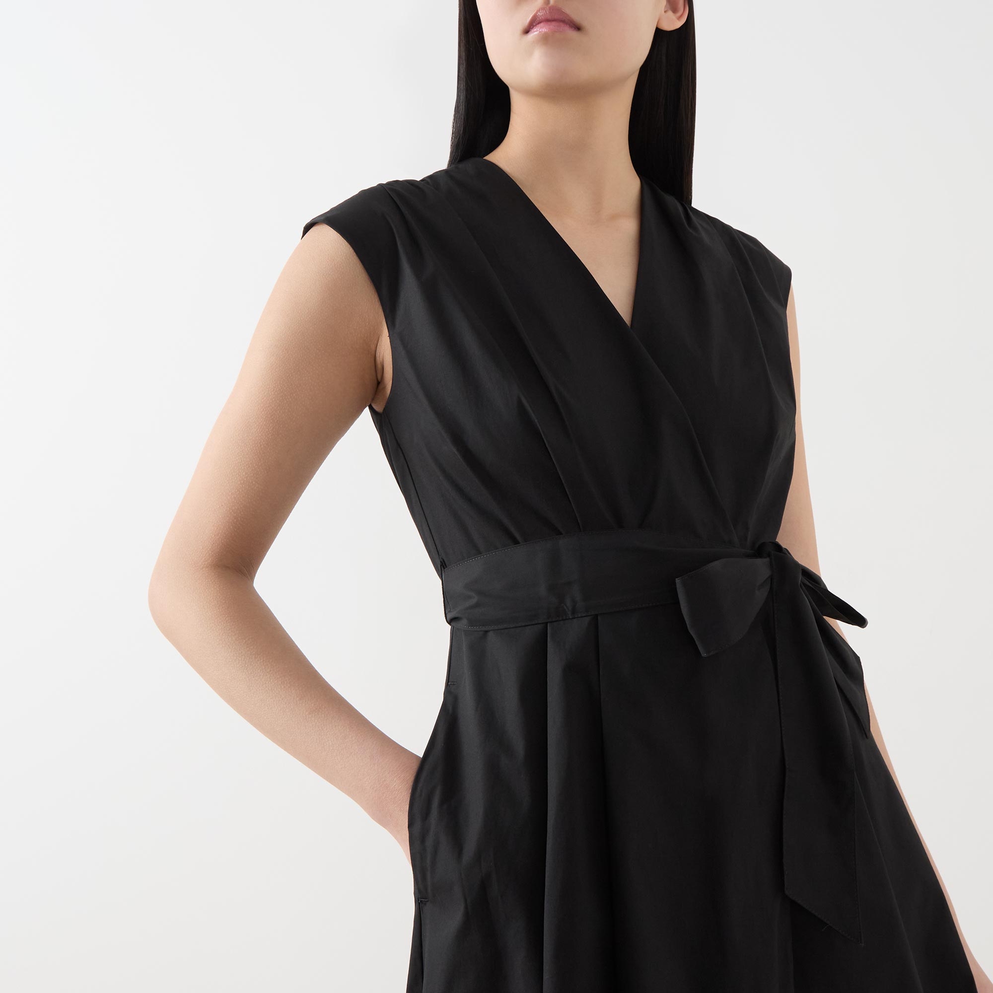 - V-neckline, sleeveless design, wrap-style front, matching belt fastening, two side in seam pockets, flared skirt, gathered detailing throughout, midi length